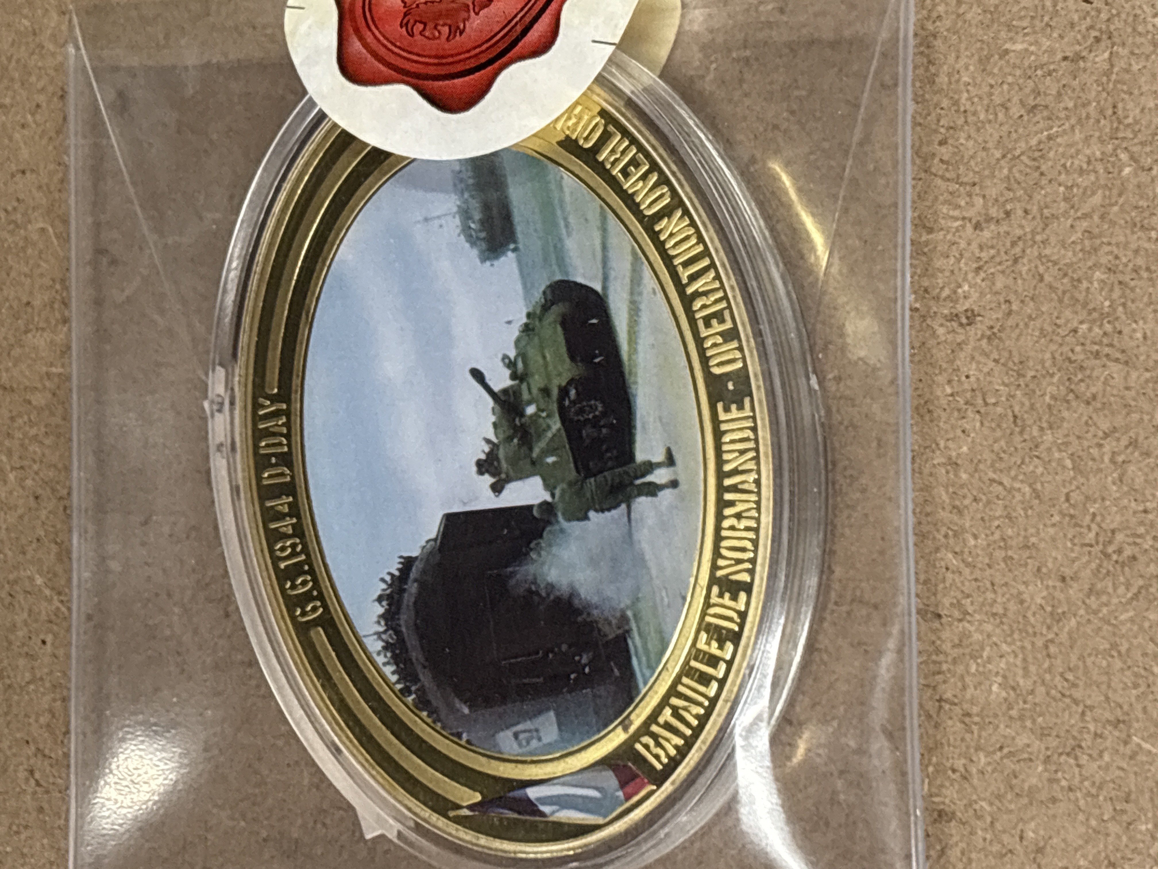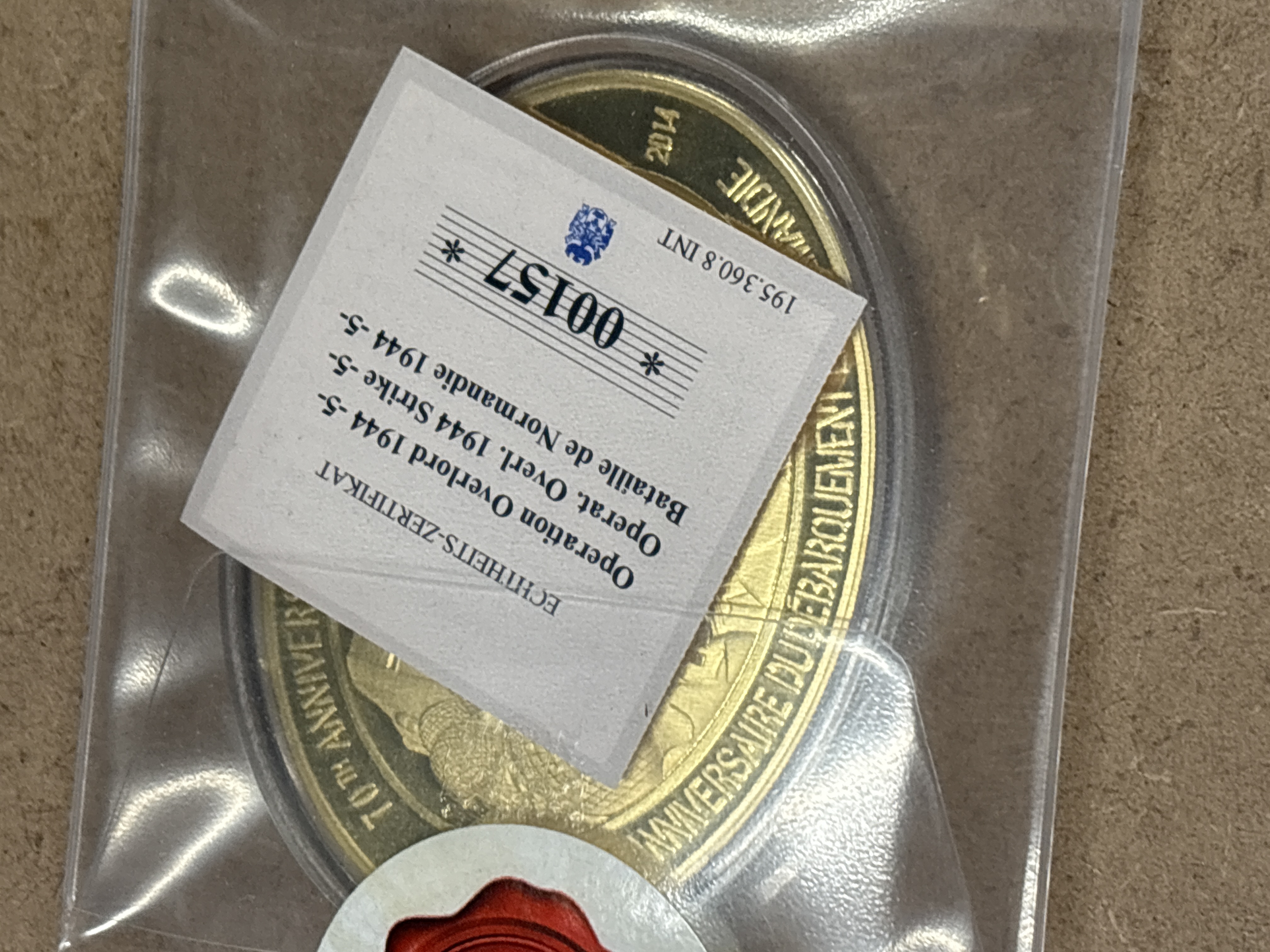 Commemorative oval medallion issued for the 70th anniversary of the D-Day landings. Design type: Colourised Beachhead / Anniversary Inscription. Key identifiers: Serial number 00157 on accompanying German certificate of authenticity. Inscribed BATAILLE DE NORMANDIE – OPERATION OVERLORD and 70TH ANNIVERSAIRE DU DEBARQUEMENT. Issued in 2014 to commemorate the 1944 Allied invasion of Normandy.