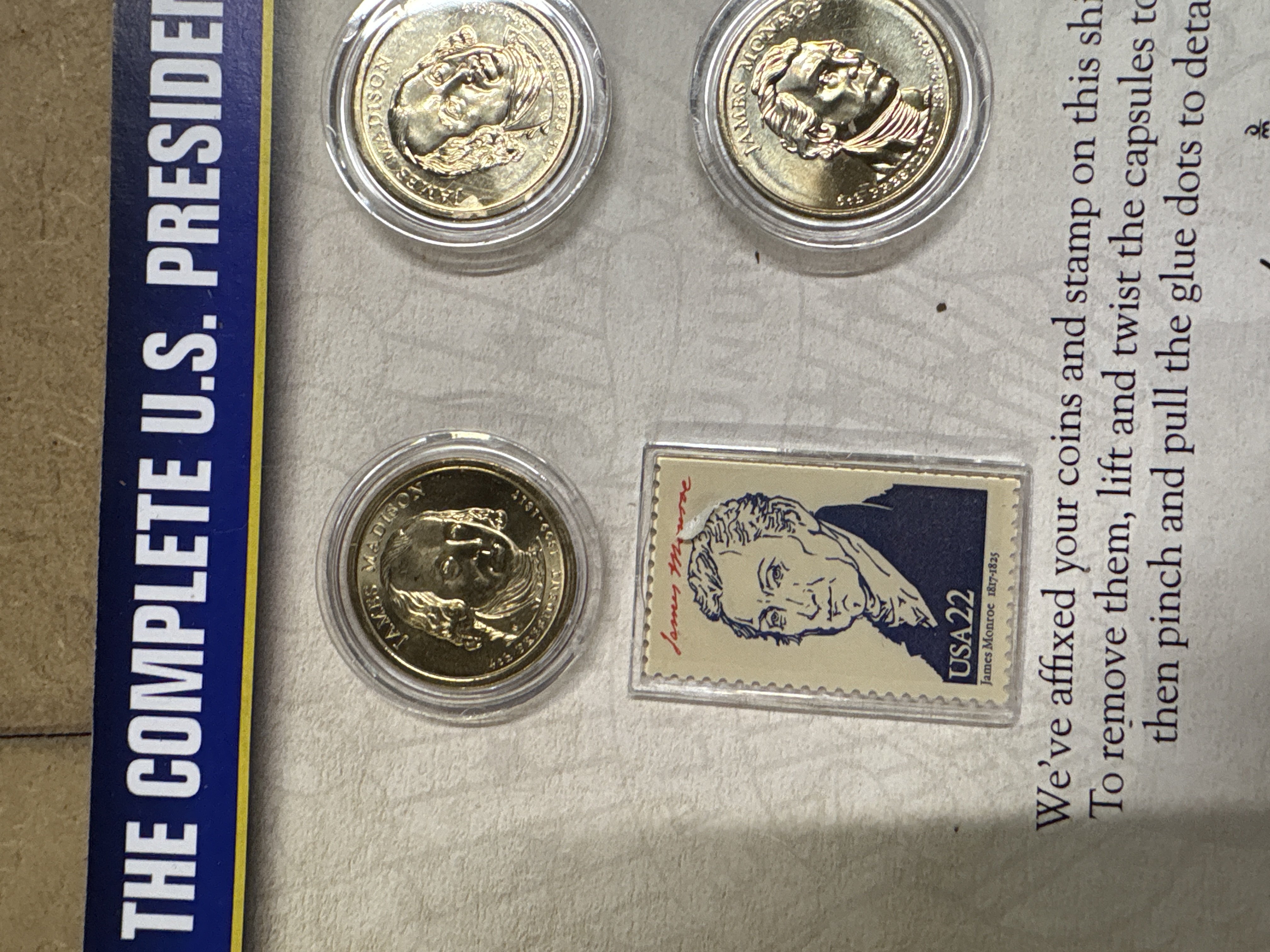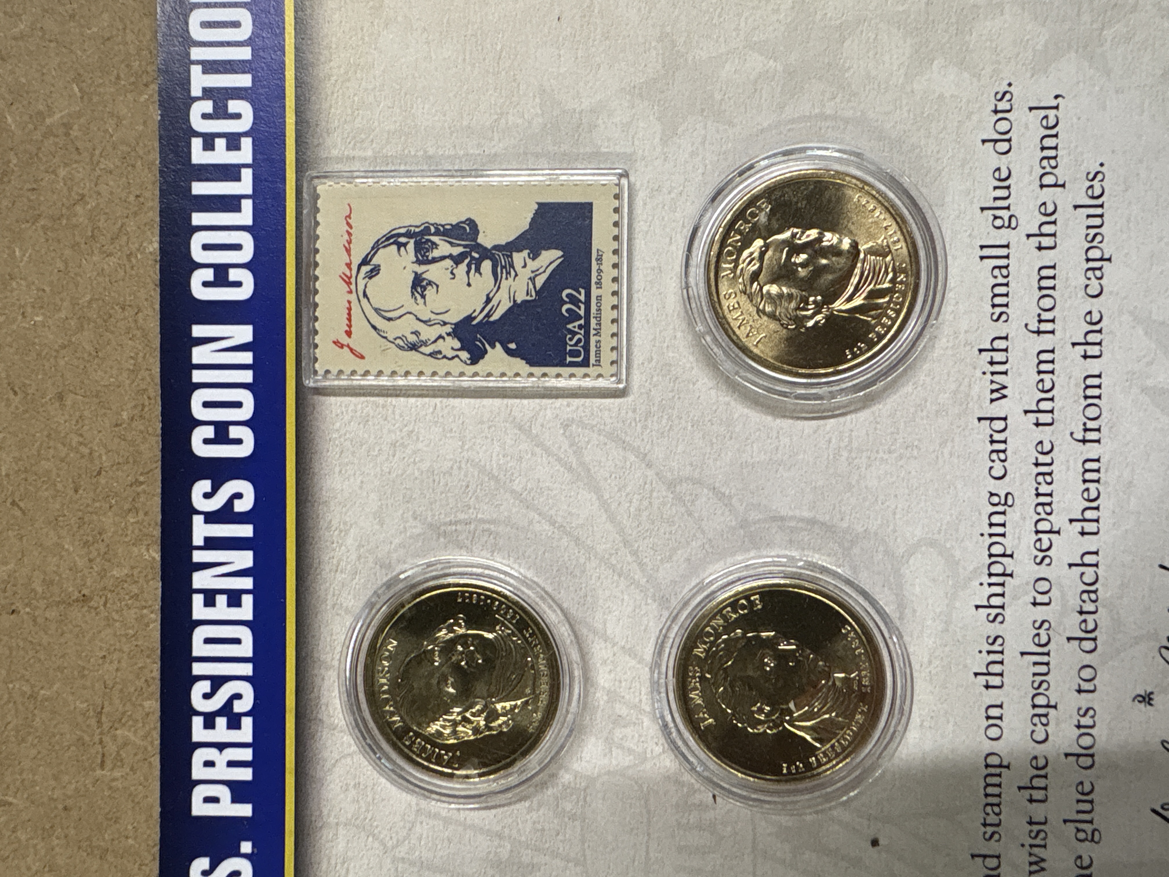 KM# 404 and KM# 405. Presidential obverse / Statue of Liberty reverse. Features edge-incused inscriptions for date, mint mark, and motto. This philatelic and numismatic presentation includes two James Madison $1 coins, two James Monroe $1 coins, and two corresponding US 22-cent postage stamps.