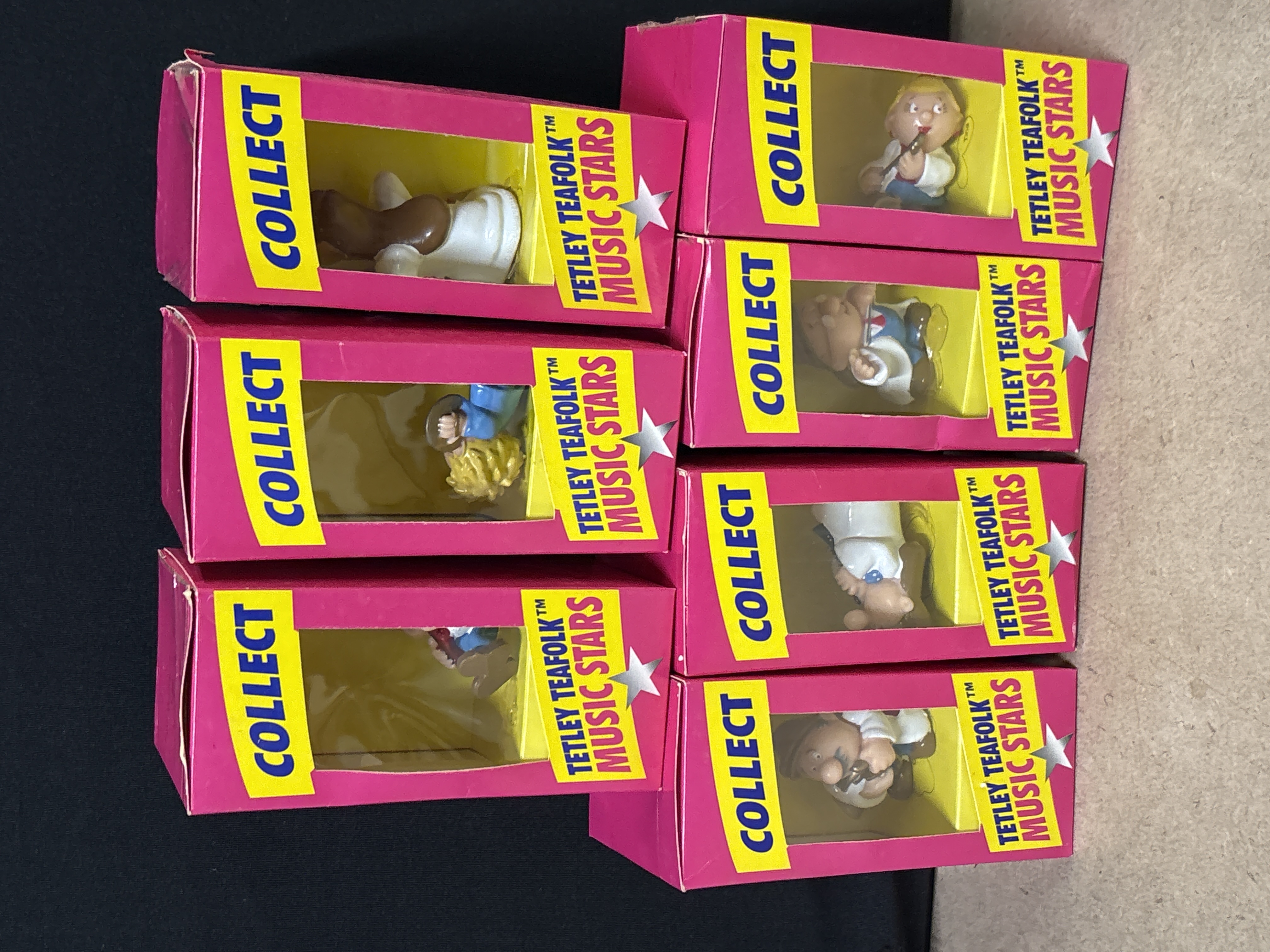 Produced for Tetley Tea, this lot comprises 7 original promotional plastic figurines from the Teafolk Music Stars collection. These really tea folk characters are static PVC models, each presented in its original pink window display box. The series features the iconic brand mascots depicted as various musical performers. The packaging is clearly branded with the Tetley Teafolk Music Stars logo and includes the Collect instruction on the side panels. These items were issued as part of a popular marketing campaign and remain a staple of modern promotional tea memorabilia.