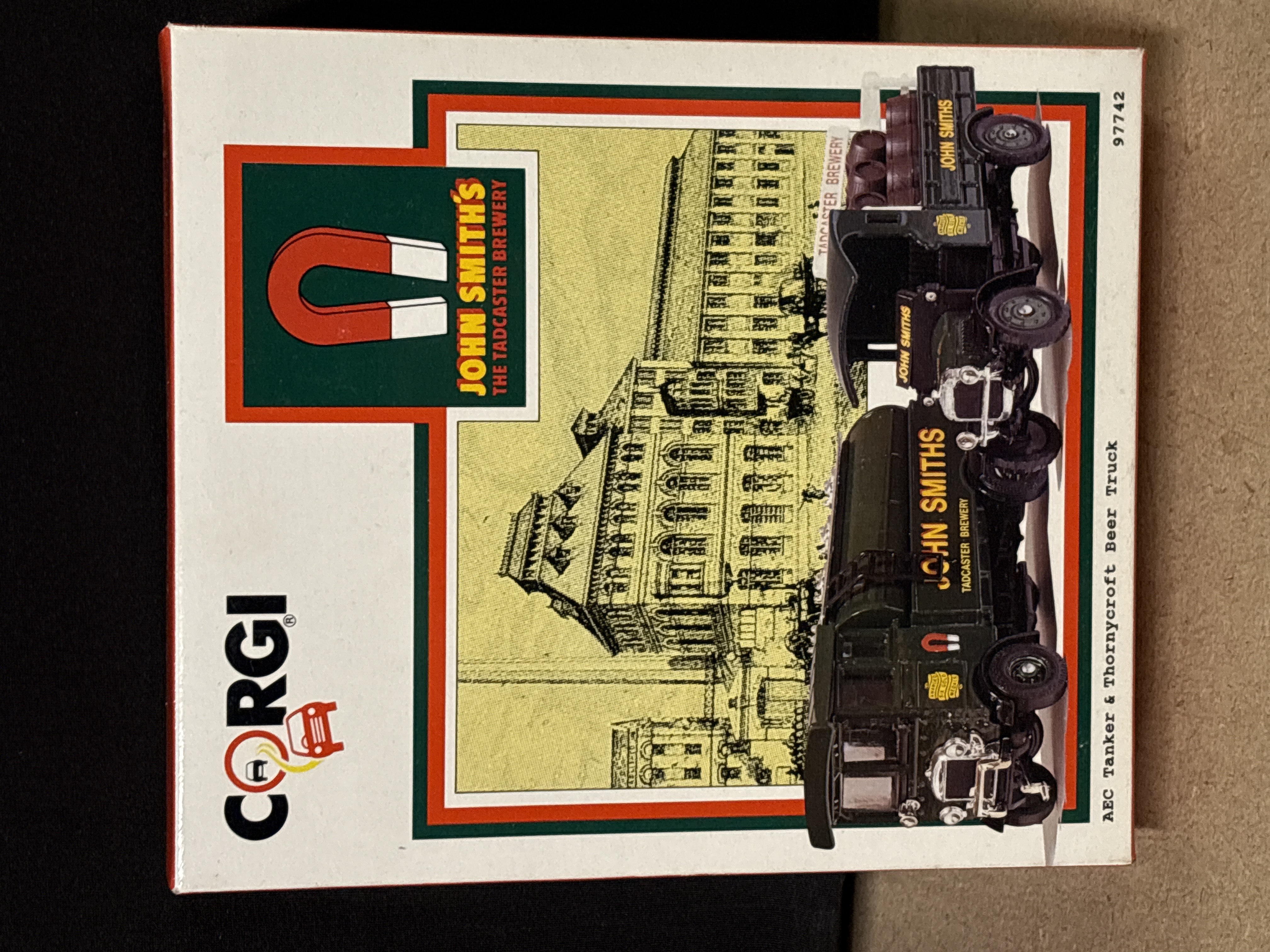 Produced by Corgi, this limited edition model set (reference 97742) is part of the Corgi Classics collection. Constructed from metal, the set features two vintage-style commercial vehicles finished in the distinctive dark green livery of John Smith’s Tadcaster Brewery. The lot includes an AEC Tanker with gold and red lettering and the company’s signature magnet logo, alongside a Thornycroft Beer Truck featuring a flatbed loaded with miniature brown beer barrels. Both models are housed in their original decorative cardboard box with a protective moulded plastic inner tray. This set is a limited edition release and includes the original certificate of authenticity, numbered 00668 of 10,000 produced, as well as a Corgi promotional leaflet.