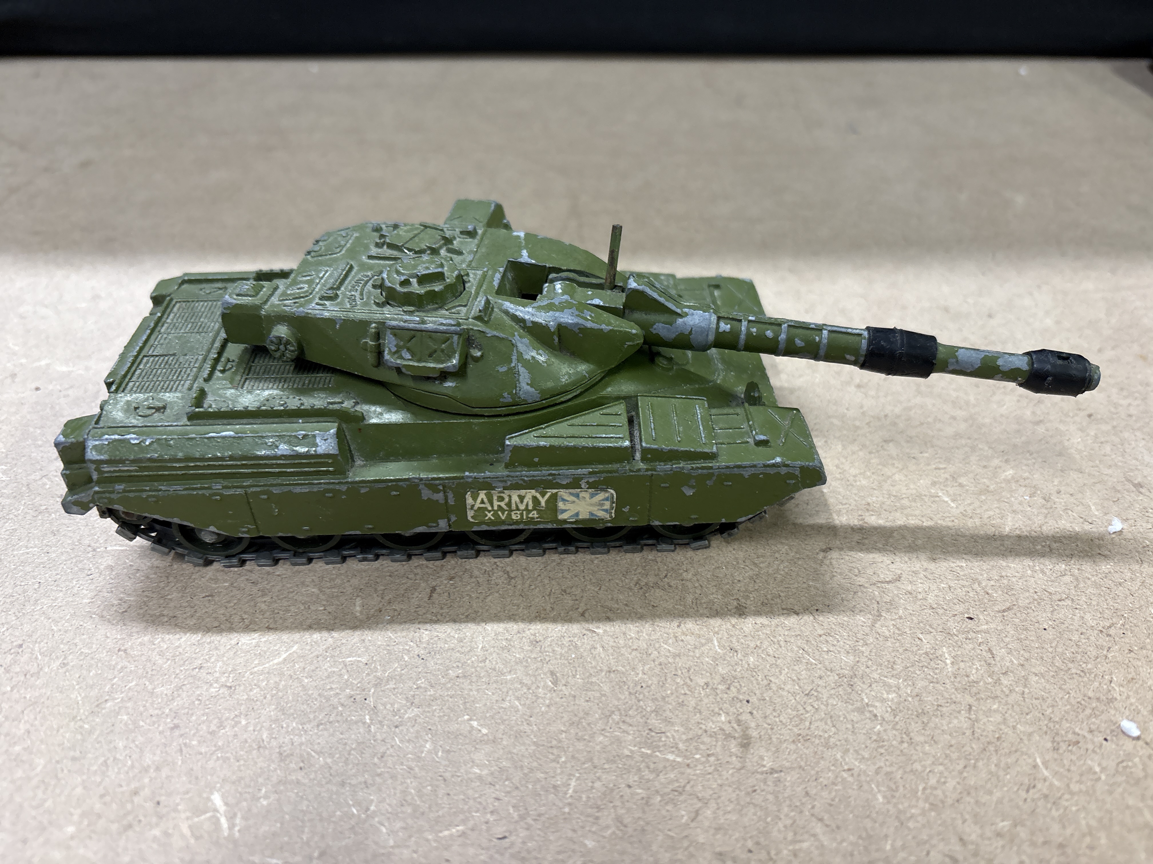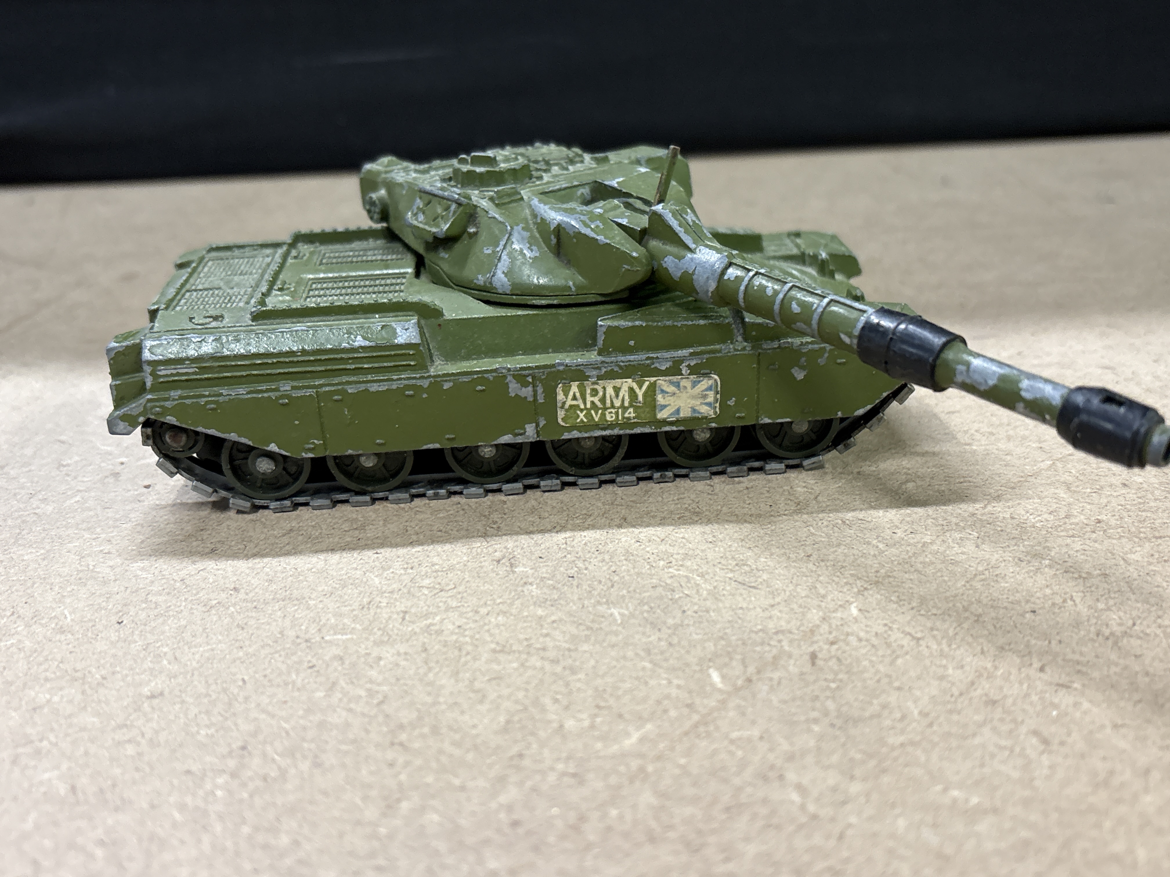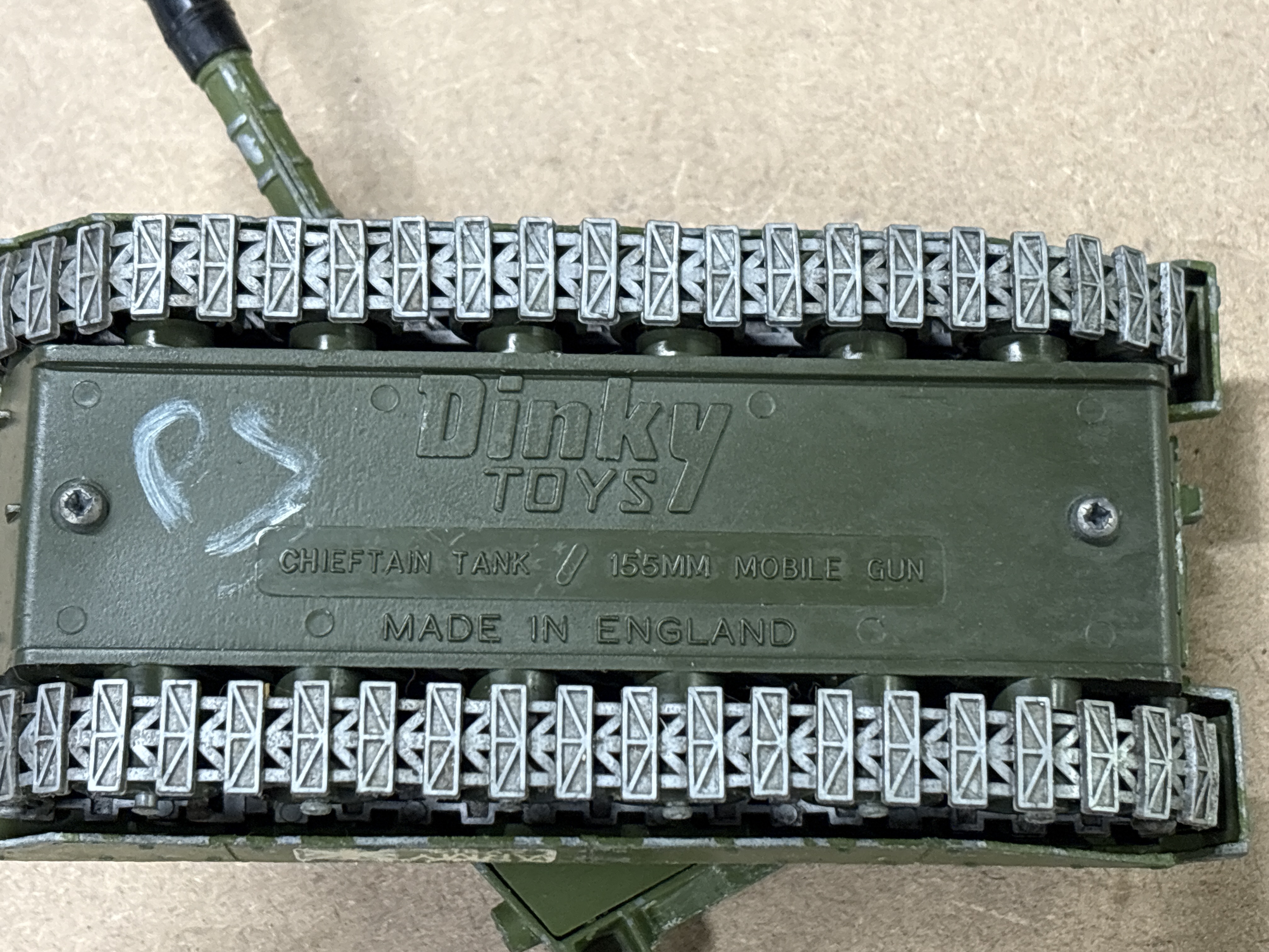 A vintage Dinky Toys Chieftain Tank military vehicle, produced in England. This metal model is based on the chassis shared with the 155mm Mobile Gun. The vehicle features a 360-degree rotating turret, an elevating gun barrel, and rolling metal caterpillar tracks. The hull sides retain the original ARMY XV614 decals featuring the Union Jack. The base is clearly embossed with the Dinky Toys manufacturer name, model titles, and country of origin. This item is offered as a single unit and is unboxed.