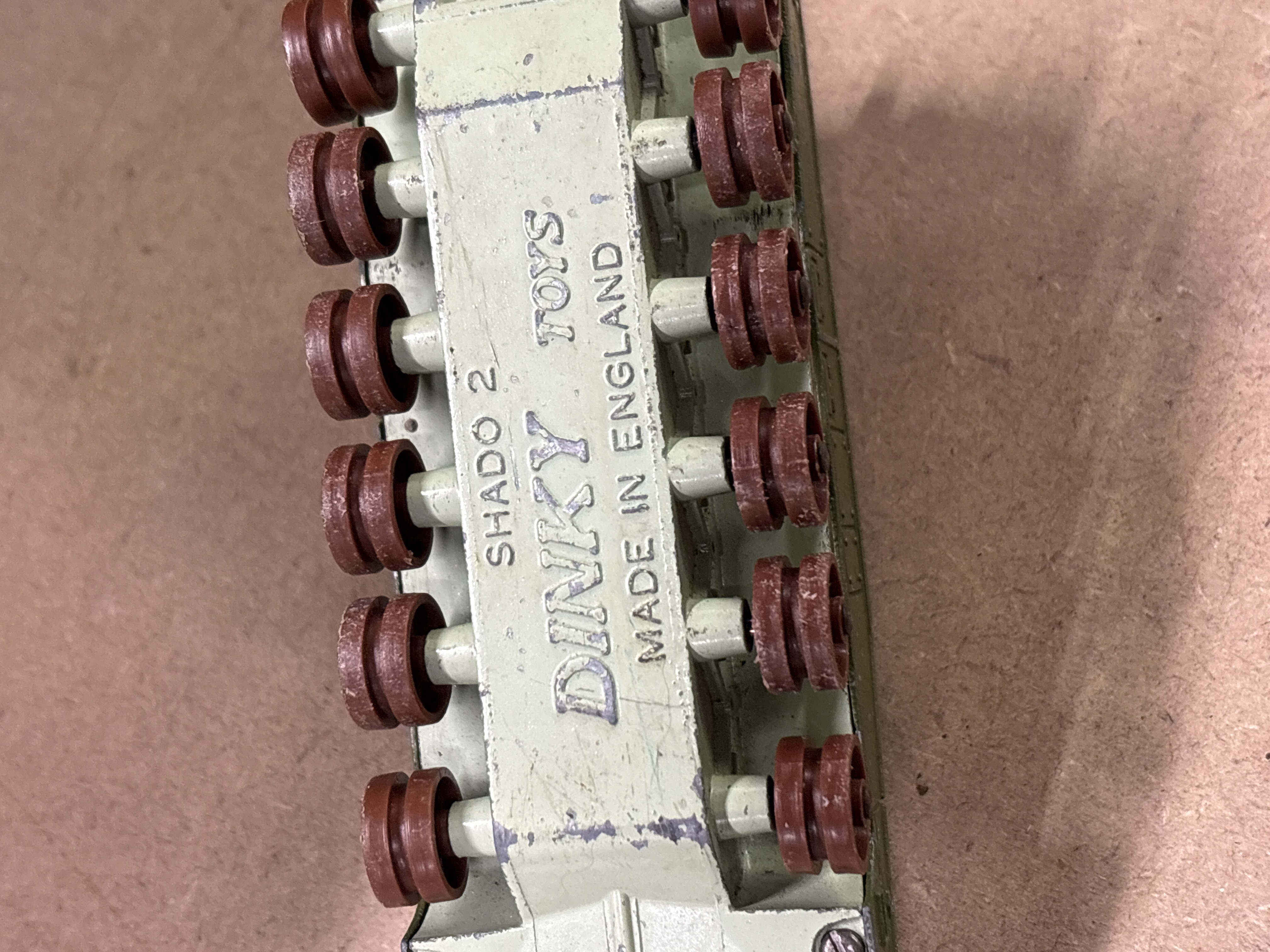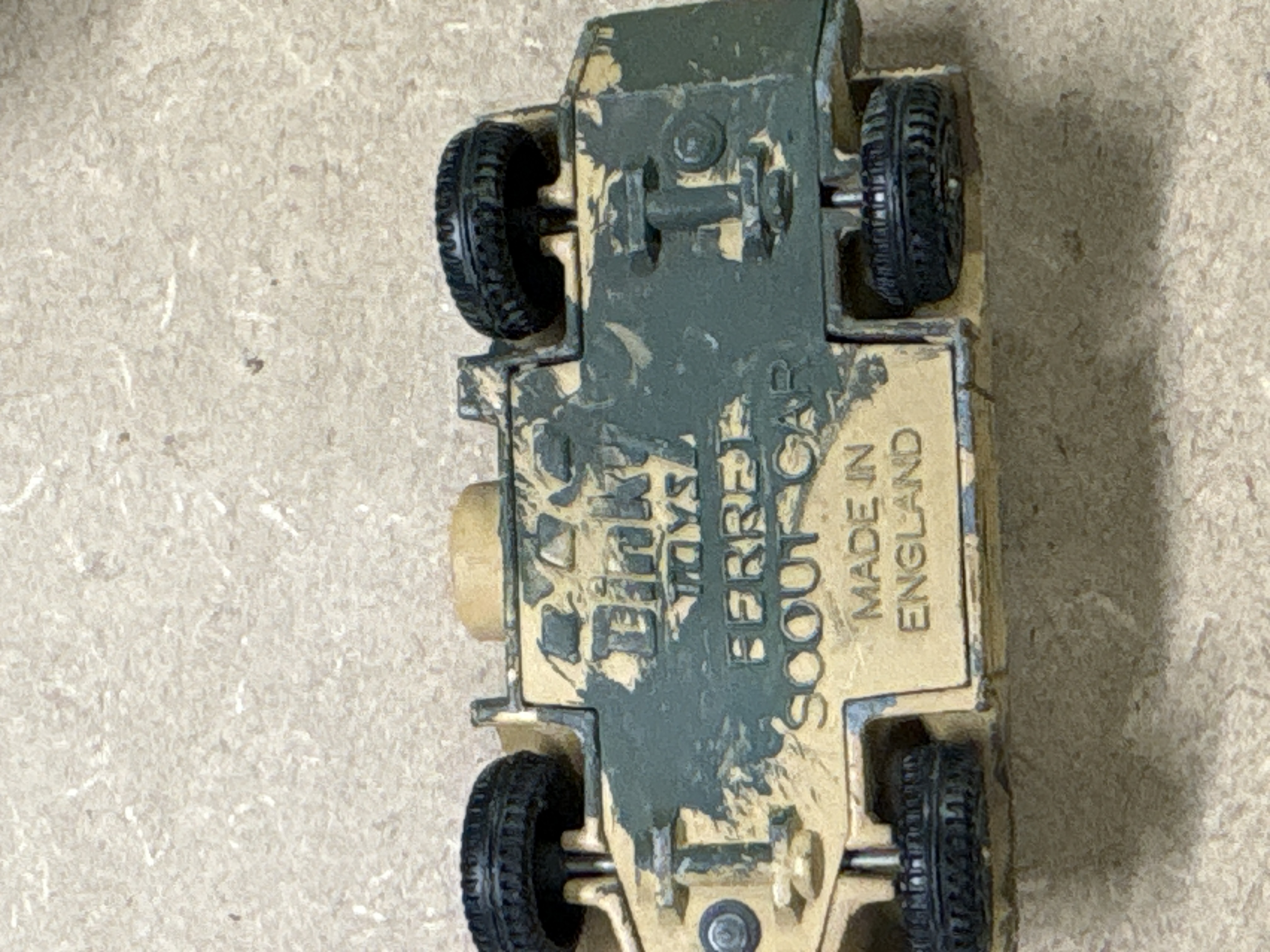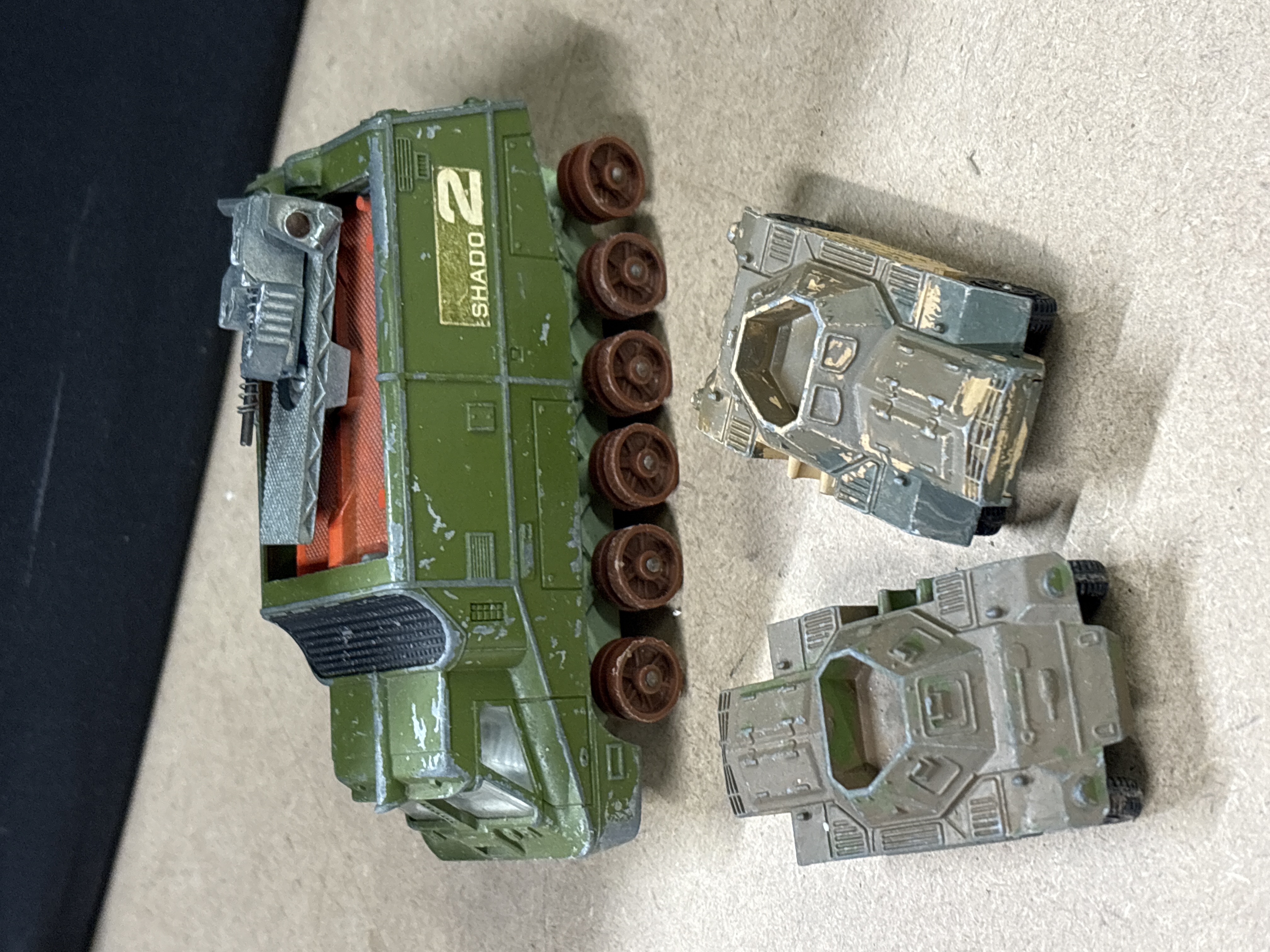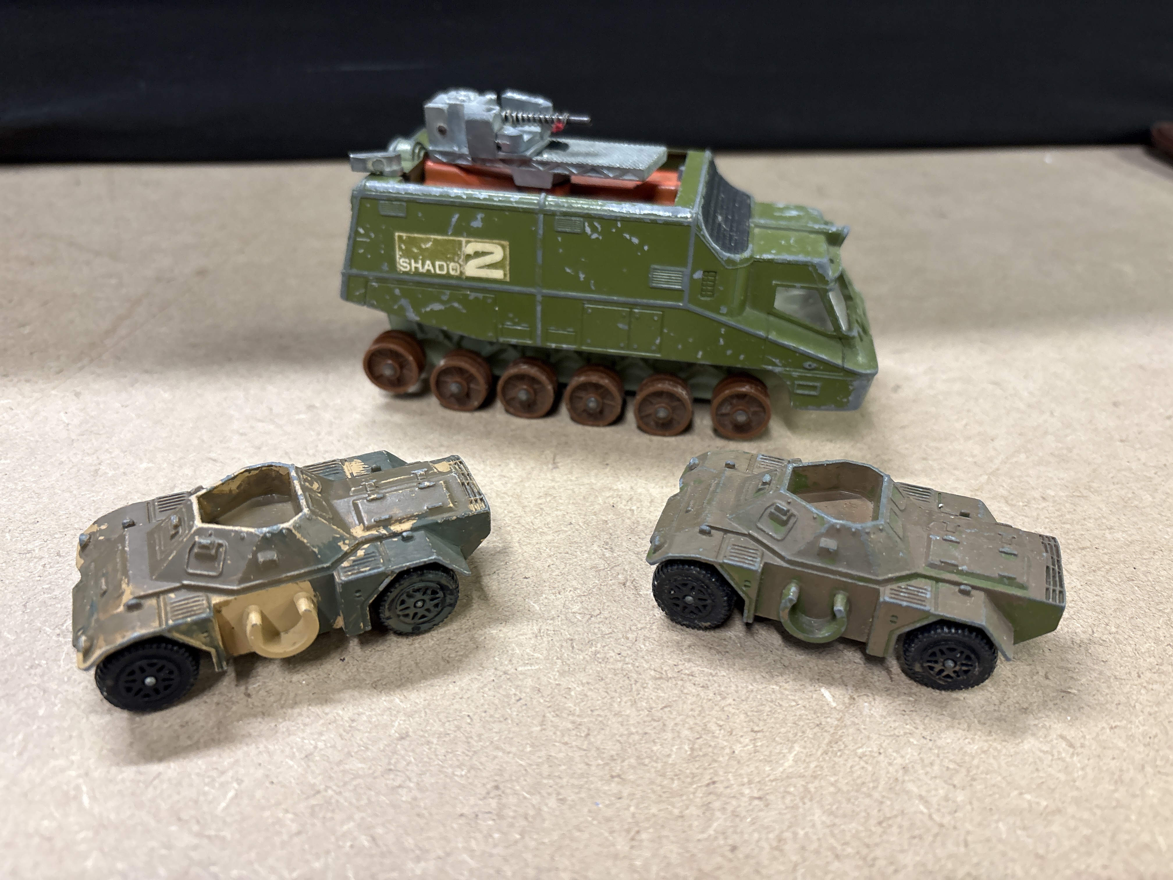 Dinky Toys. This lot features three vintage metal vehicles manufactured in England by Meccano Ltd. Included is a No. 353 SHADO 2 Mobile from the Gerry Anderson sci-fi series UFO, alongside two No. 670 Ferret Scout Cars. The SHADO 2 Mobile is equipped with a rotating roof turret and a flip-top roof section that opens to reveal an orange interior. The Ferret Scout Cars are military-style vehicles. The undersides of the vehicles bear the Dinky Toys stamps and model identifications. No original boxes are included with this lot.