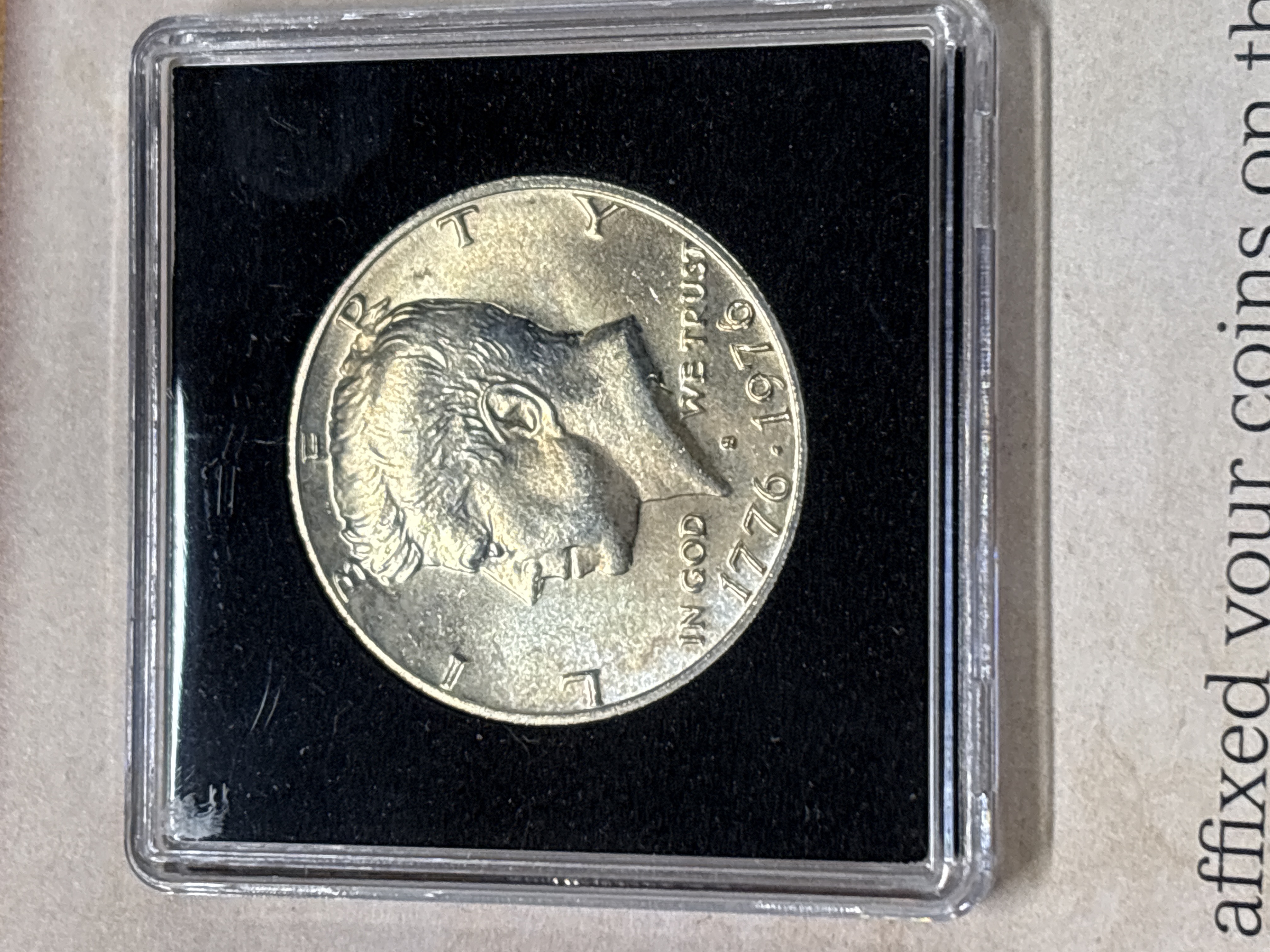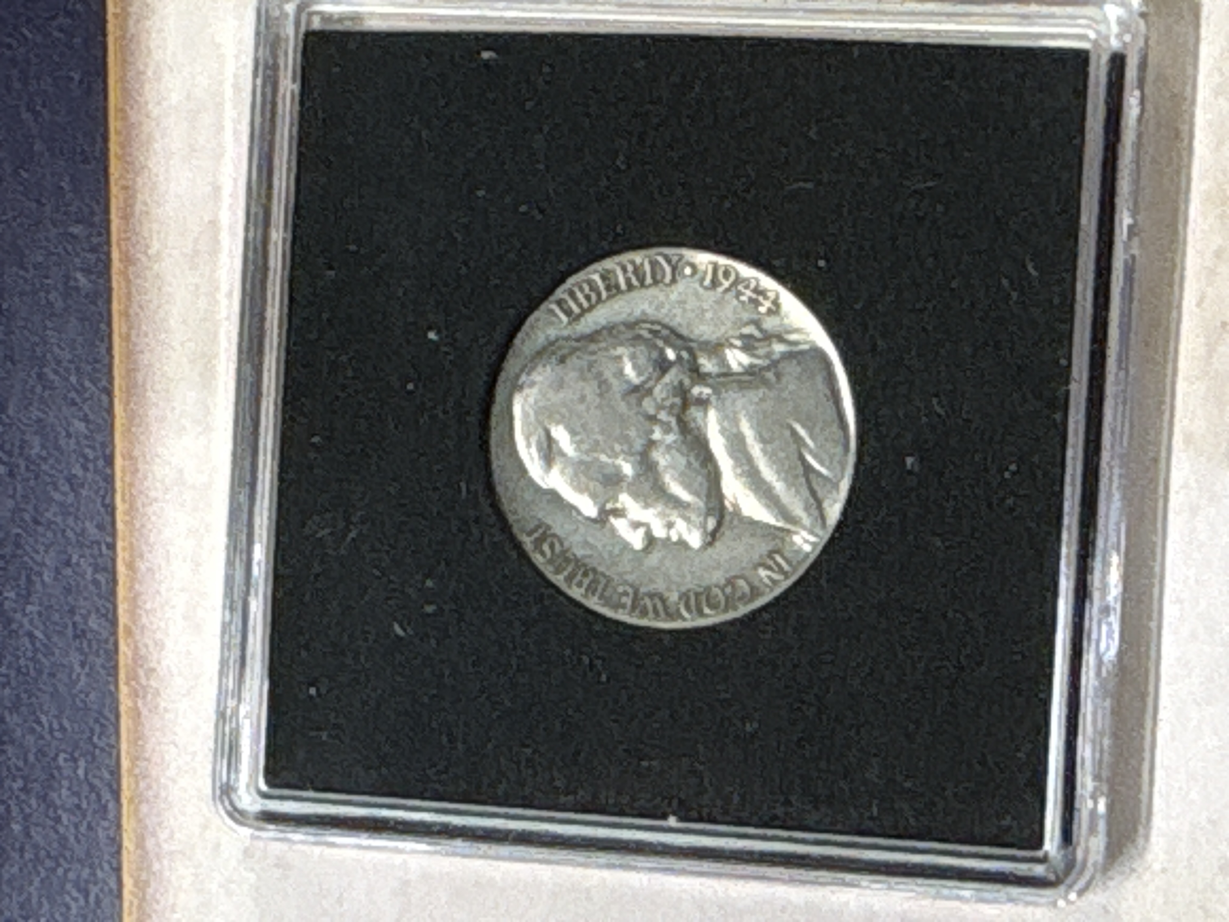US 1944 Jefferson nickel (KM-192a) and 1776-1976 S Kennedy half dollar (KM-205a). Jefferson obverse; Kennedy obverse. The half dollar features the S mint mark for San Francisco. A pair of silver coins presented on a Danbury Mint shipping card. The 1944 nickel is a wartime issue struck in a silver alloy to conserve nickel for the war effort.
