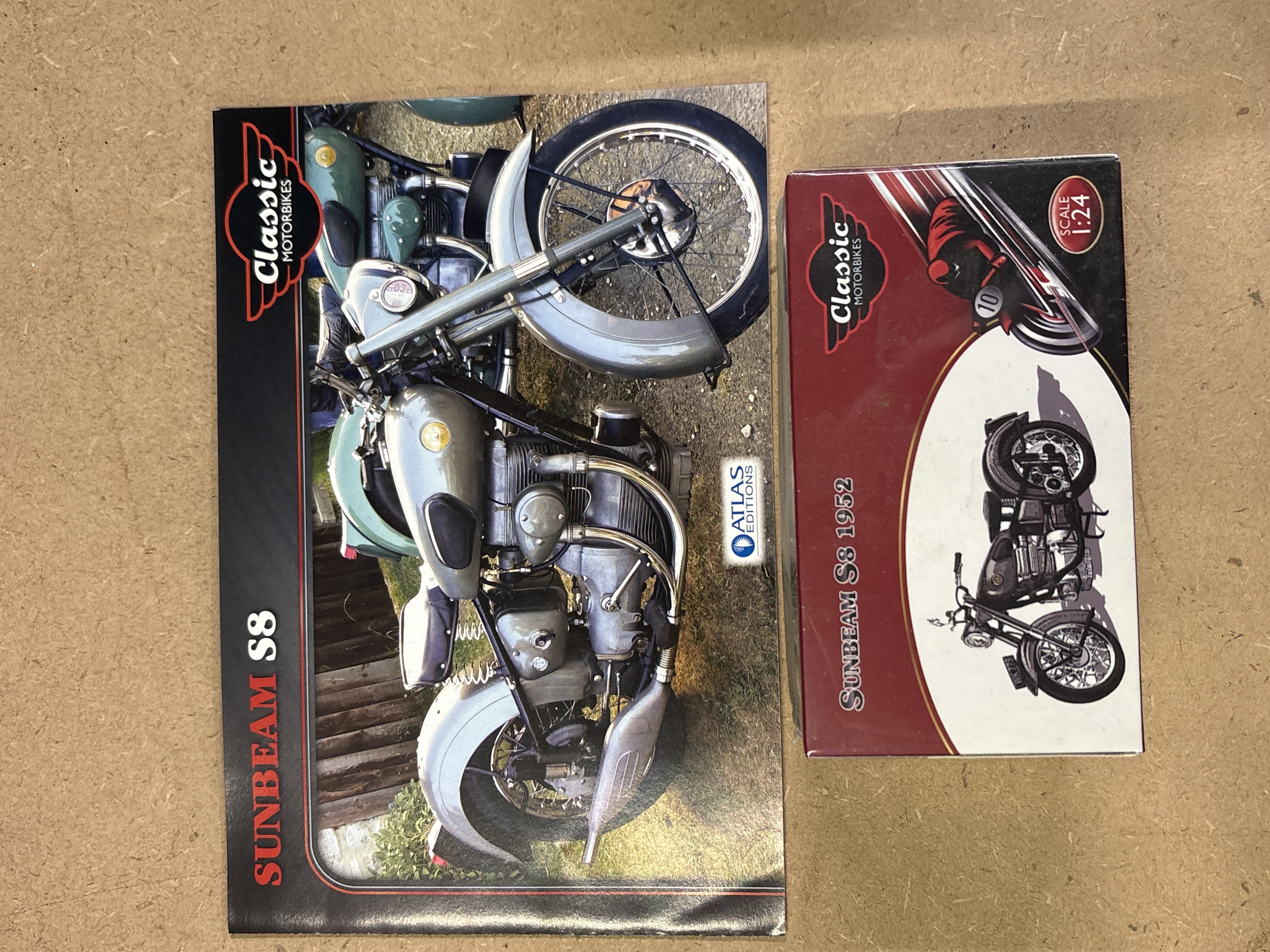 1952 Sunbeam S8 1:24 scale metal model. VIN: N/A. Engine: 500cc (original subject specification). Mileage: N/A. Modifications: None. This lot features a die-cast metal replica from the Atlas Editions Classic Motorbikes collection. The item includes the original retail box and a Classic Motorbikes informational brochure. The model displays the registration LHK779.