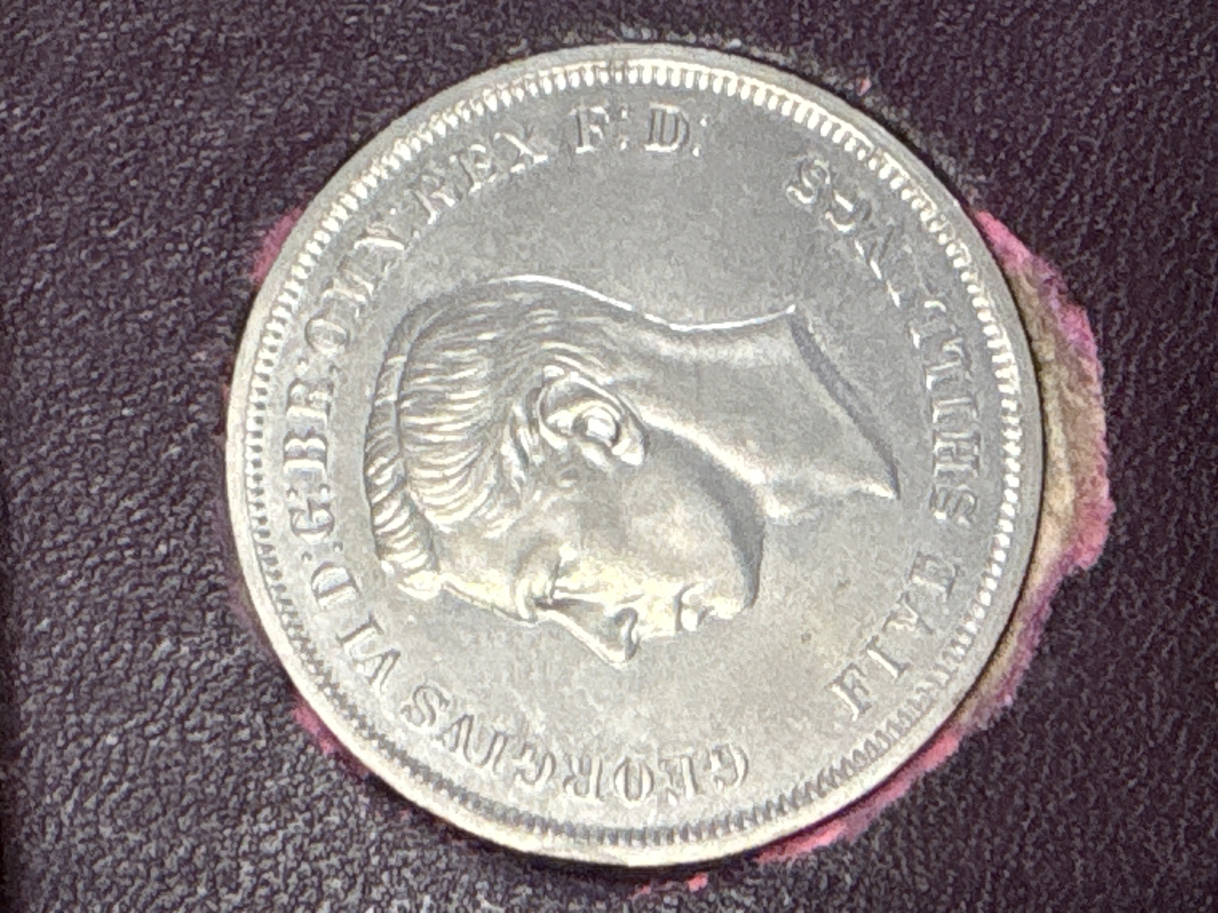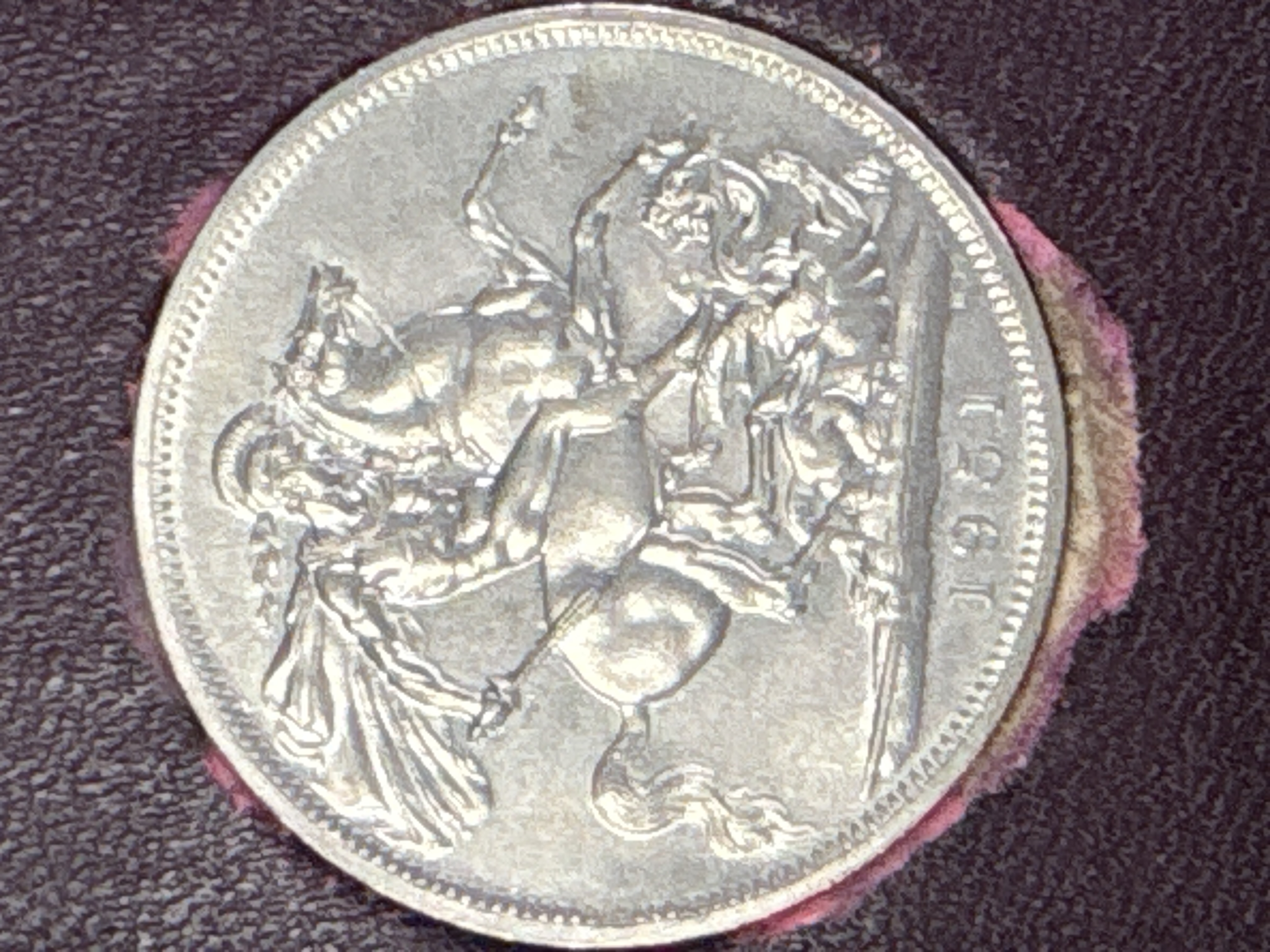 KM-880. Obverse by Humphrey Paget; reverse by Benedetto Pistrucci. Royal Mint, London. George VI obverse / St. George and Dragon reverse. Edge inscription: MDCCCLI CIVIUM INDUSTRIA FLORET CIVITAS MCMLI. Issued to commemorate the Festival of Britain. Accompanied by original burgundy textured cardboard presentation box and printed informational insert.