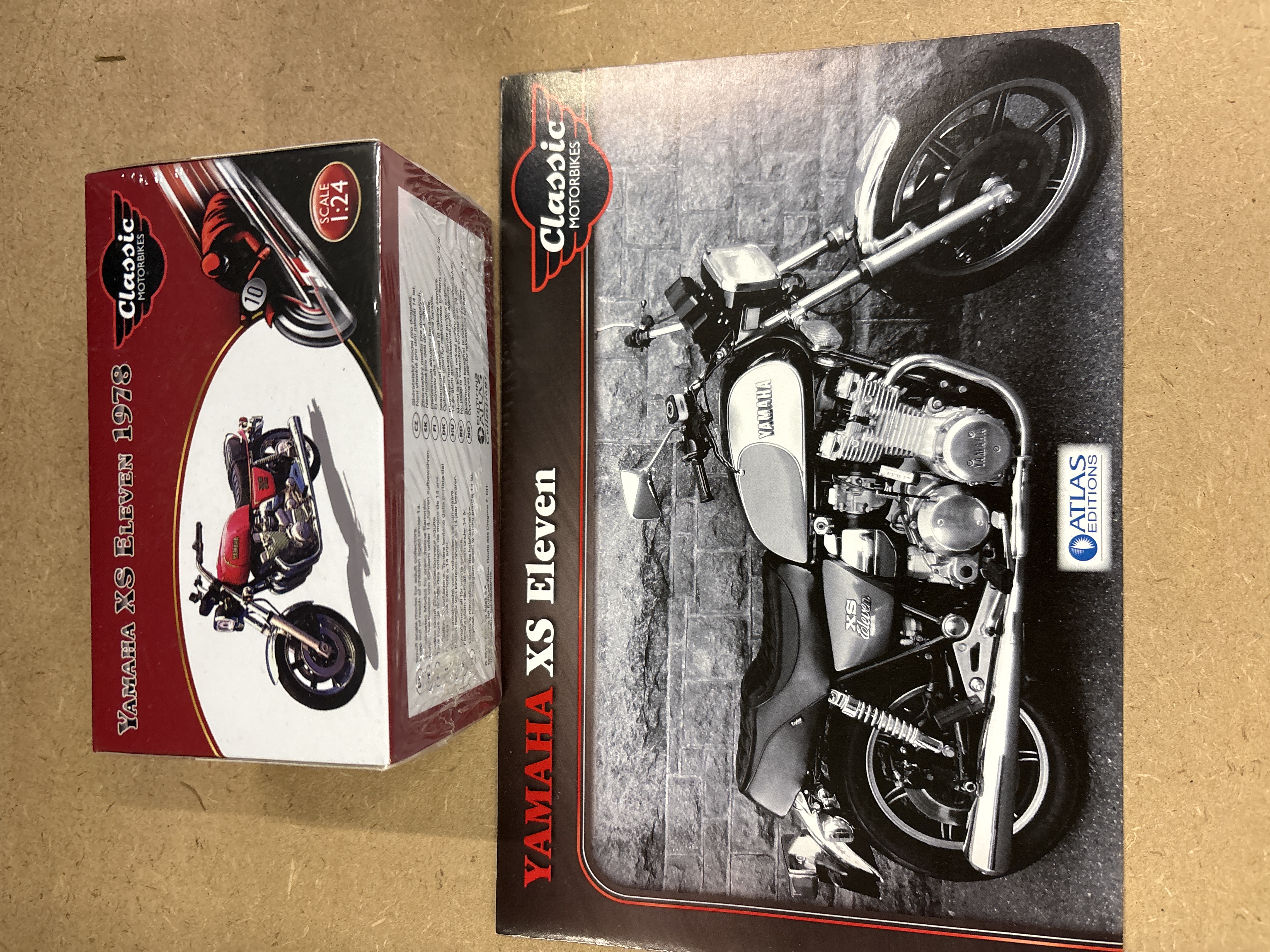 Produced by Atlas Editions, this is a 1:24 scale model of the Yamaha XS Eleven 1978 motorcycle from the Classic Motorbikes series. The model is constructed from metal and features intricate detailing of the engine, exhaust, and chassis components. The motorcycle is finished in a period-accurate red and silver colour scheme. This lot includes the model in its original branded window-style box and is accompanied by the original informational collector’s booklet which provides technical specifications and history for the Yamaha XS Eleven. The manufacturer’s branding and series title are clearly displayed on both the packaging and the literature.