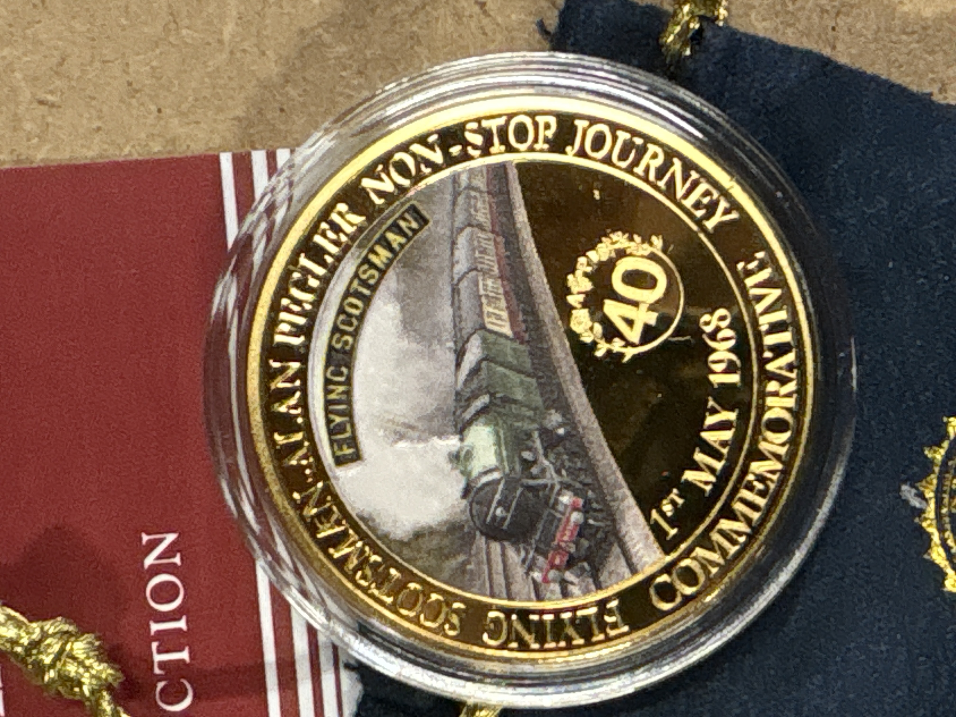 Issued by The Bradford Exchange as part of The Flying Scotsman Icon of Steam Official Commemorative Collection. This issue commemorates the 40th anniversary of the 1968 non-stop journey. Features a colourised obverse design. Includes original Certificate of Authenticity, informational brochure, and branded drawstring pouch.