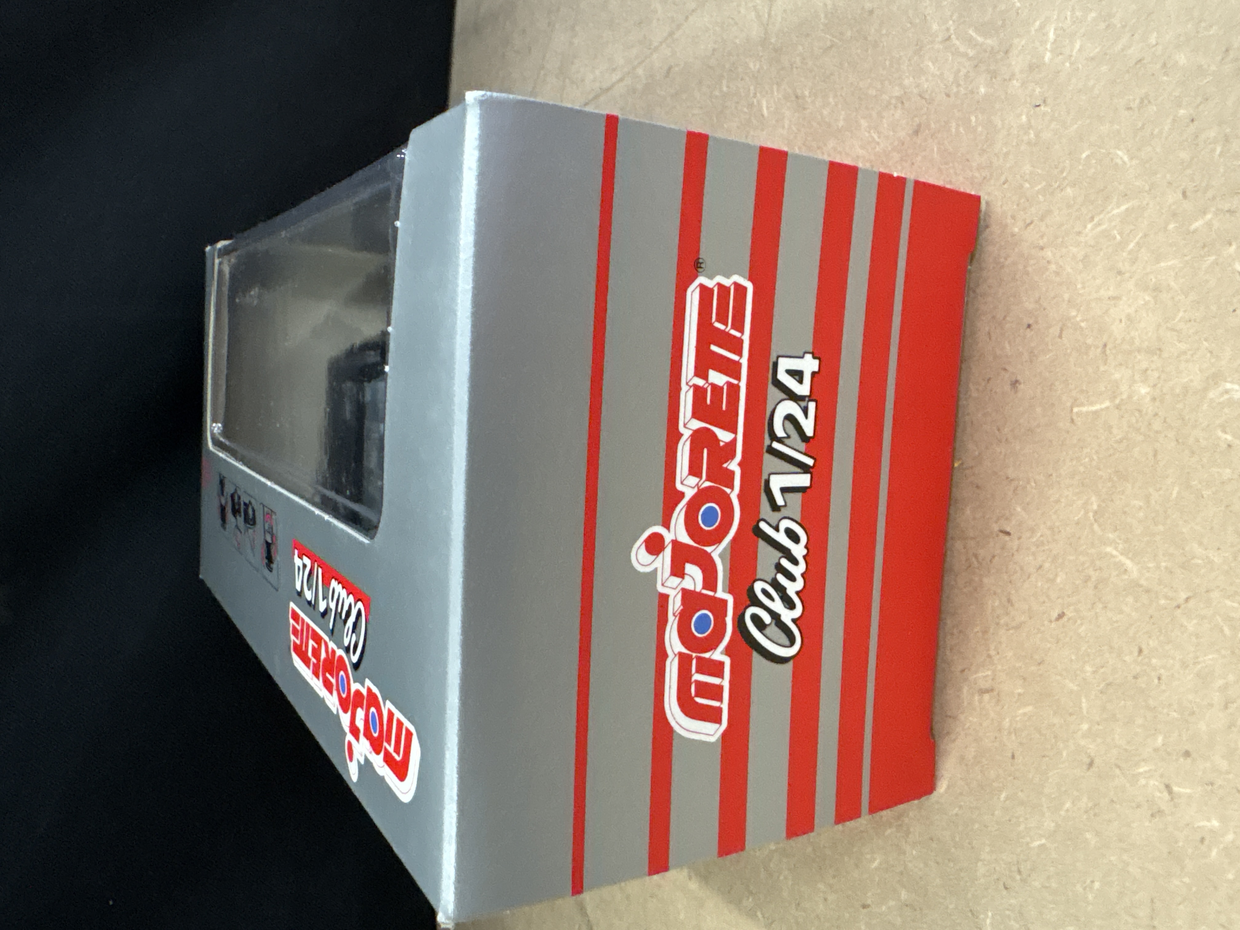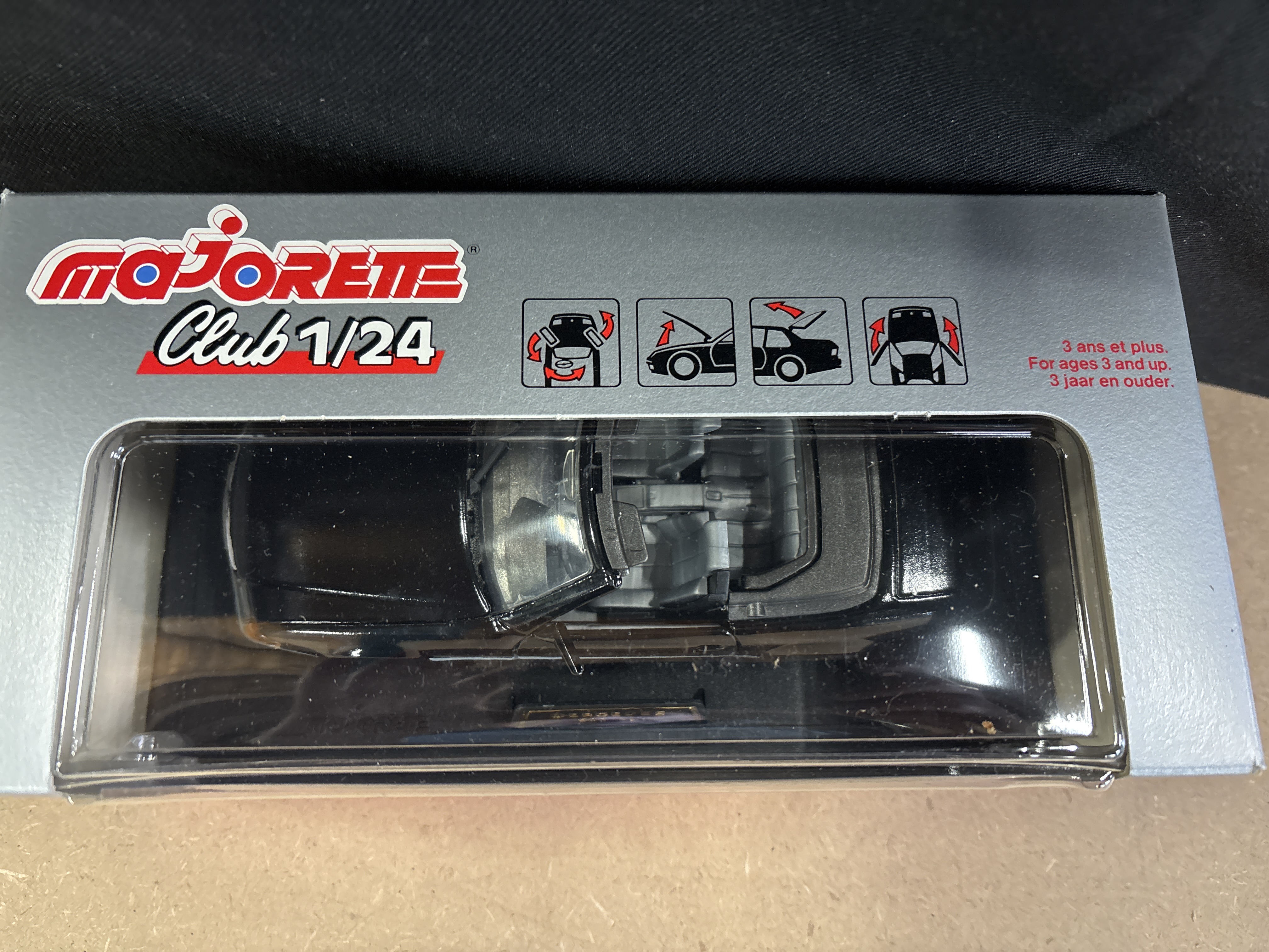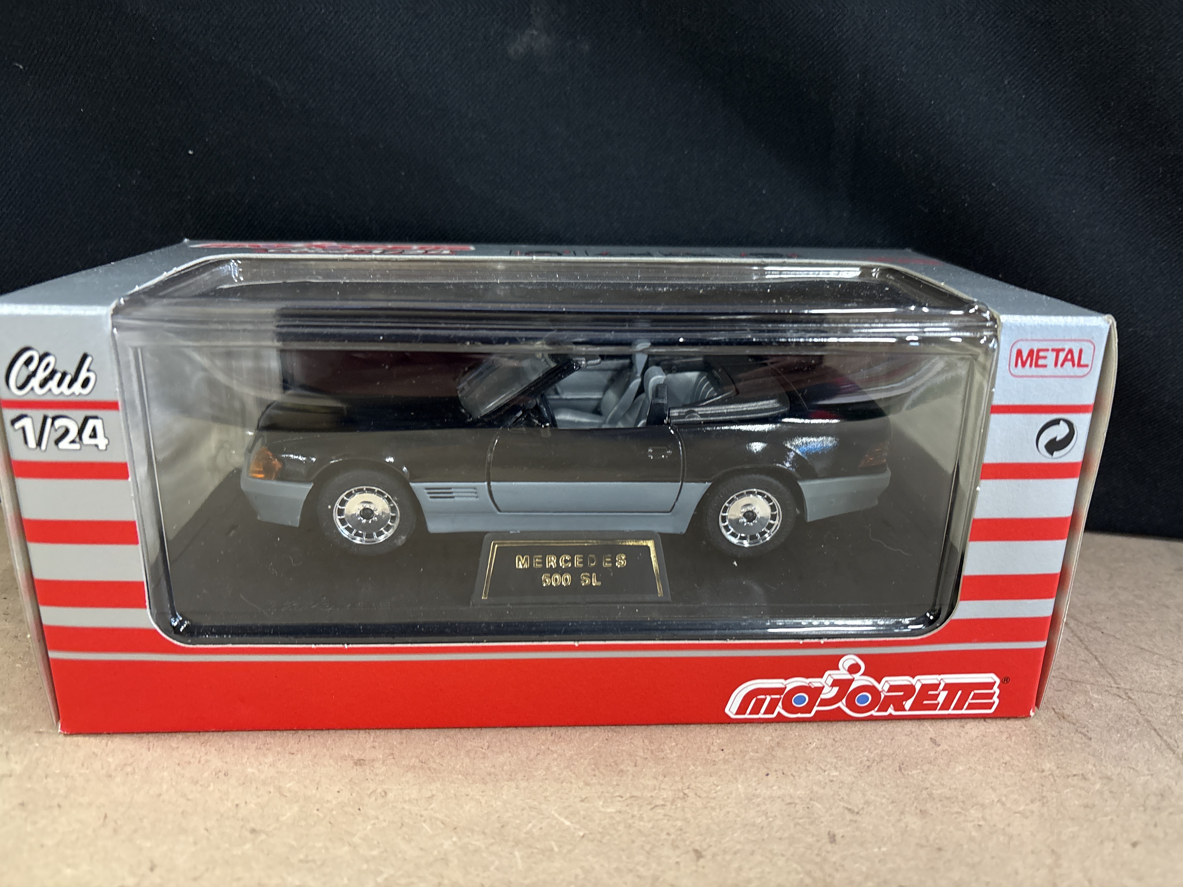 This lot features a single Majorette “Club 1/24” scale model of a Mercedes-Benz 500 SL Roadster. Produced by Majorette, this model is constructed from metal and finished in a professional two-tone colour scheme consisting of a gloss black upper body and matte grey lower side cladding. The interior is detailed in grey. The vehicle features multiple points of articulation as depicted on the packaging diagrams, including an opening bonnet, opening doors, an opening boot, and a functional steering mechanism. The model is fitted with realistic chrome-finished multi-spoke wheels. It is housed in its original silver and red “Majorette Club 1/24” window display box, which includes multi-lingual age recommendations and a “METAL” branding emblem.
