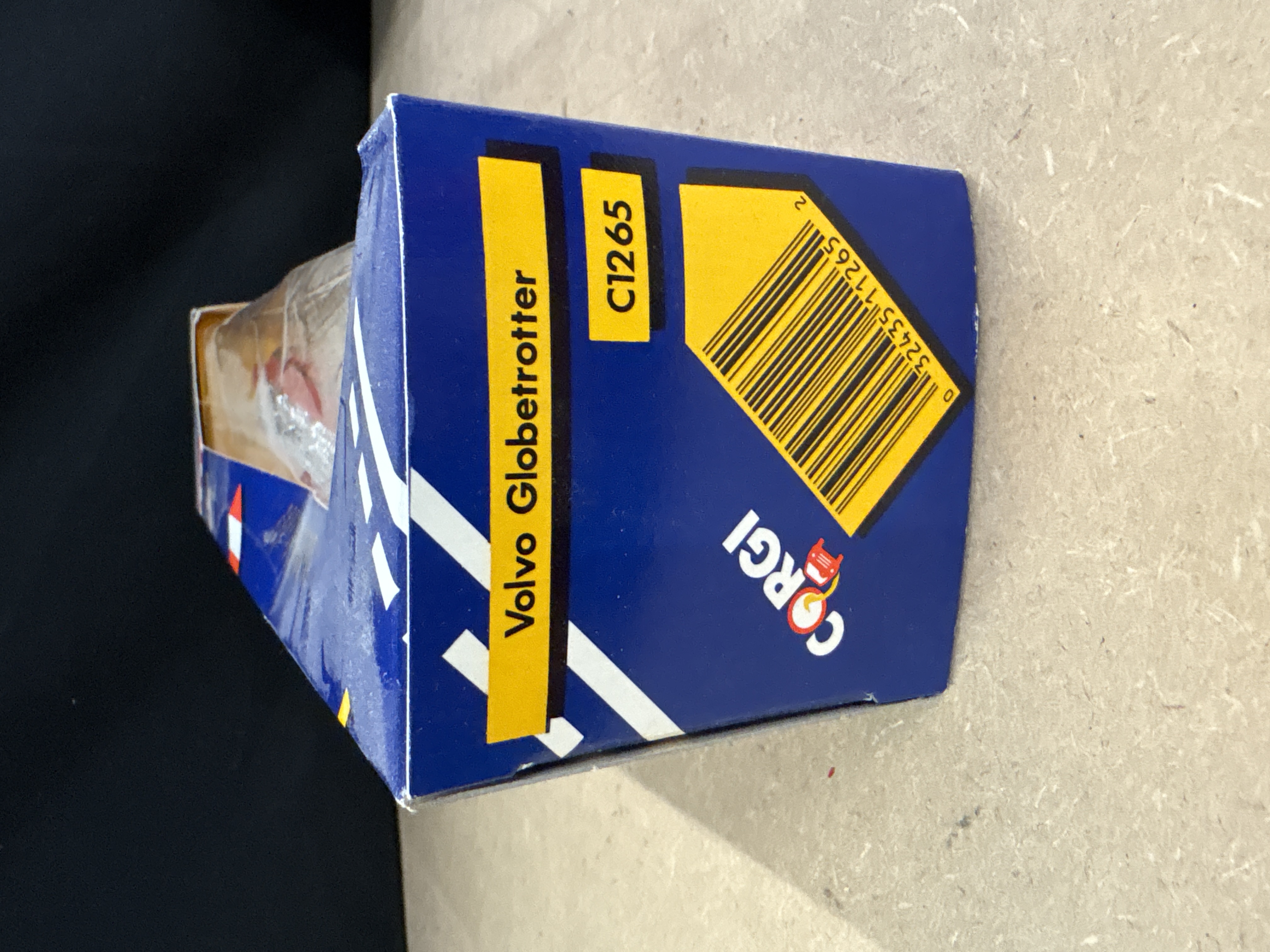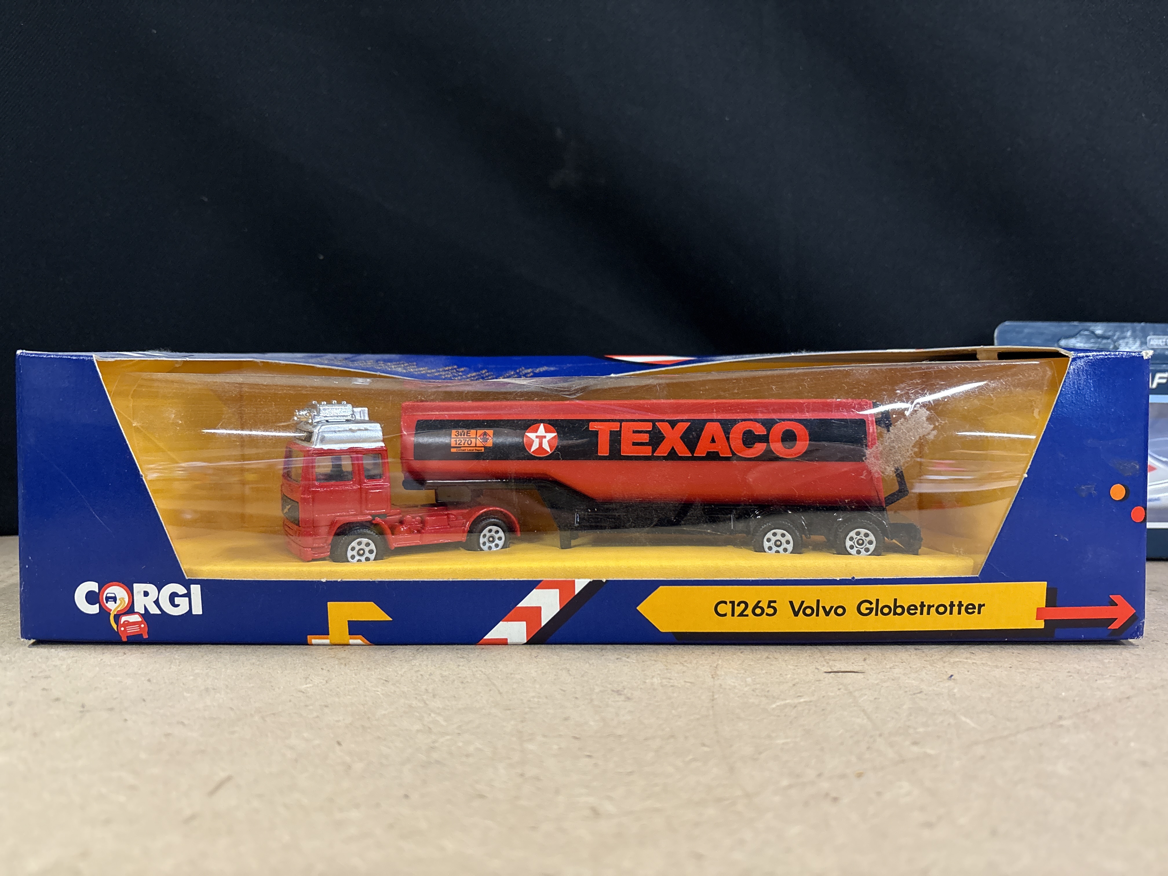 A Corgi die-cast metal Volvo Globetrotter articulated fuel tanker, model number C1265, featuring the iconic Texaco livery. The vehicle consists of a red tractor unit and a black and red trailer. The tanker displays prominent Texaco branding with the signature star logo alongside a detailed hazard placard marked 3YE 1270. The top of the tanker unit is finished with a silver-tone textured surface. This single lot is housed in its original blue and yellow window display box, secured against a yellow interior card insert. Packaging text includes the manufacturer’s name, model details, and a barcode (0 32435 11265 2), with multilingual safety warnings. This model represents a classic example of Corgi’s commercial vehicle range from the late 20th century.