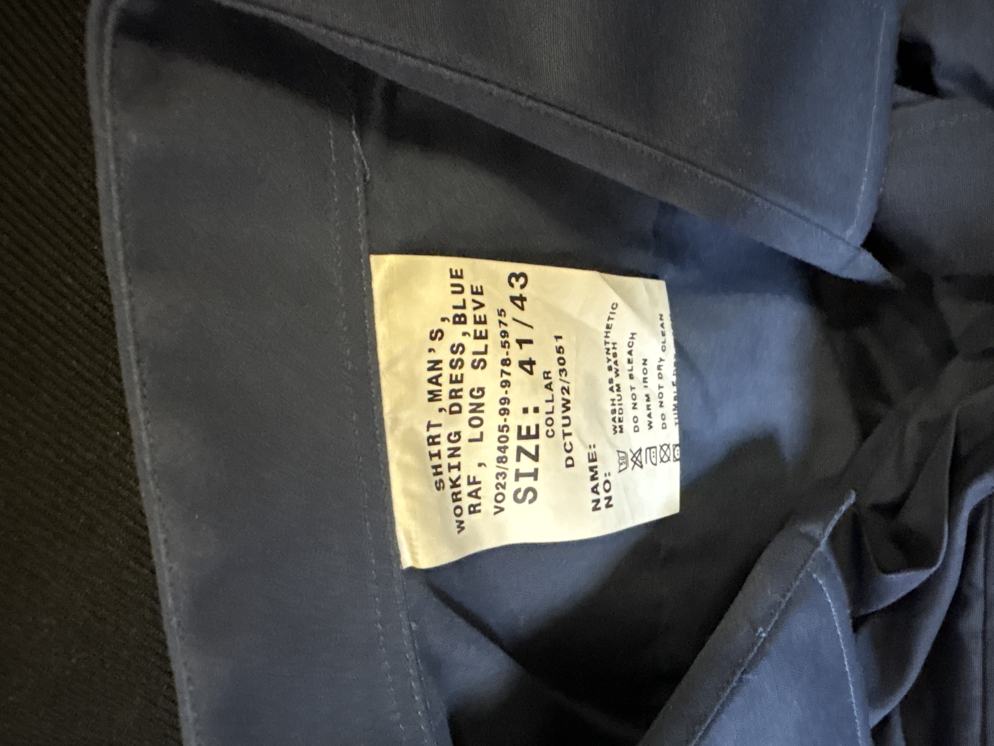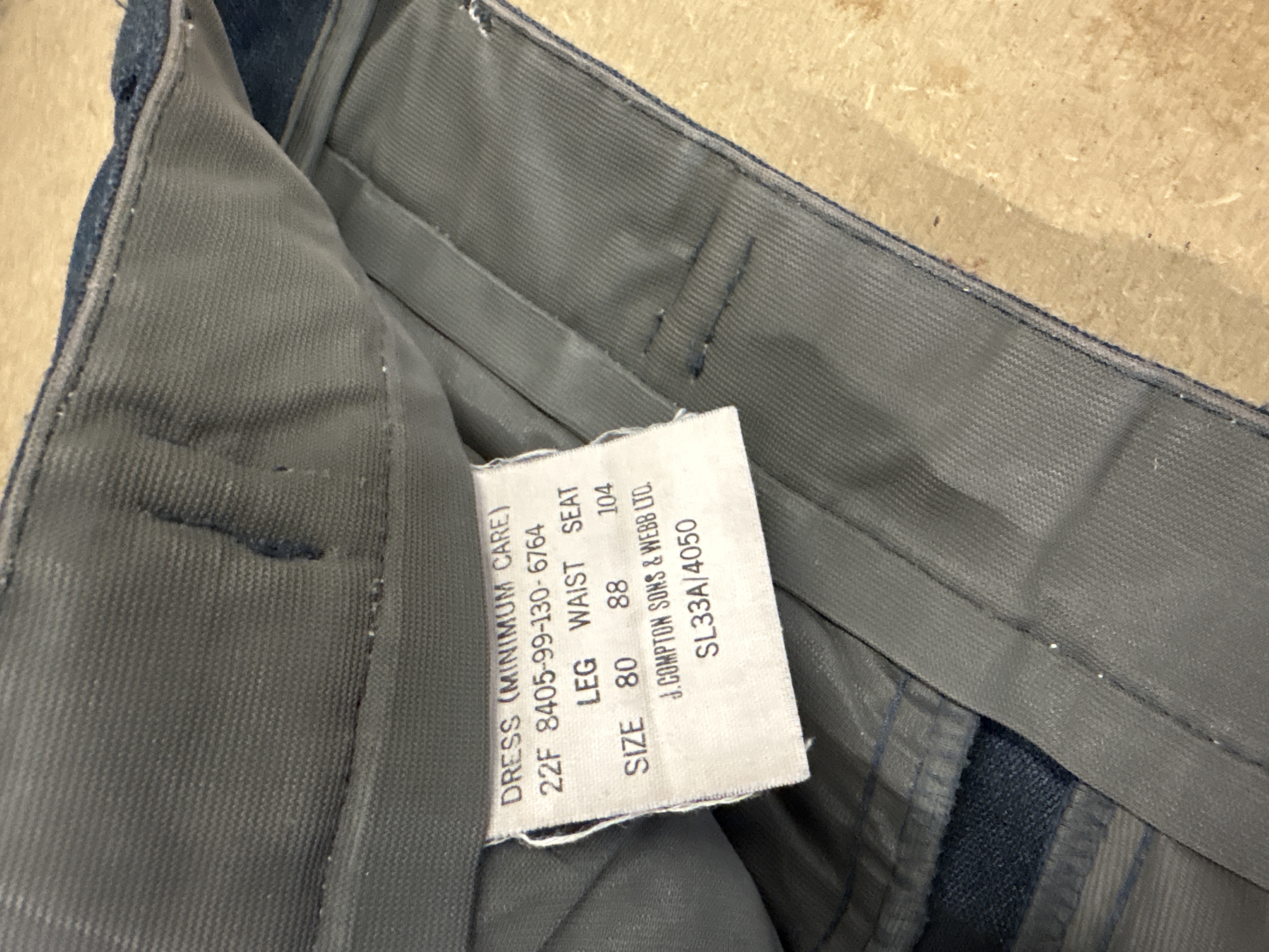 A group lot of three items of modern Royal Air Force (RAF) and Air Training Corps (ATC) interest. The lot comprises a man’s long-sleeve working dress shirt in RAF blue fabric, featuring pleated chest pockets with button-down flaps and epaulettes. The internal collar label identifies the garment as Shirt, Man’s, Working Dress, Blue, RAF, Long Sleeve, size 41/43, with NATO Stock Number 8405-99-978-5975. Accompanying the shirt is a pair of RAF blue-grey fabric dress trousers, labelled as Dress (Minimum Care) and manufactured by J. Compton Sons & Webb Ltd. The trousers are size 80/88/104 (Leg 80cm, Waist 88cm, Seat 104cm) with NSN 8405-99-130-6764, featuring a clasp and button waist closure and pleated front. The final item is an Air Training Corps Cadet Record of Service Book, RAF Form 3822 (Revision 6/00). The blue card cover displays the ATC crest with the motto Venture Adventure. This is the standard issue document used by cadets to record their service history, qualifications, and achievements.