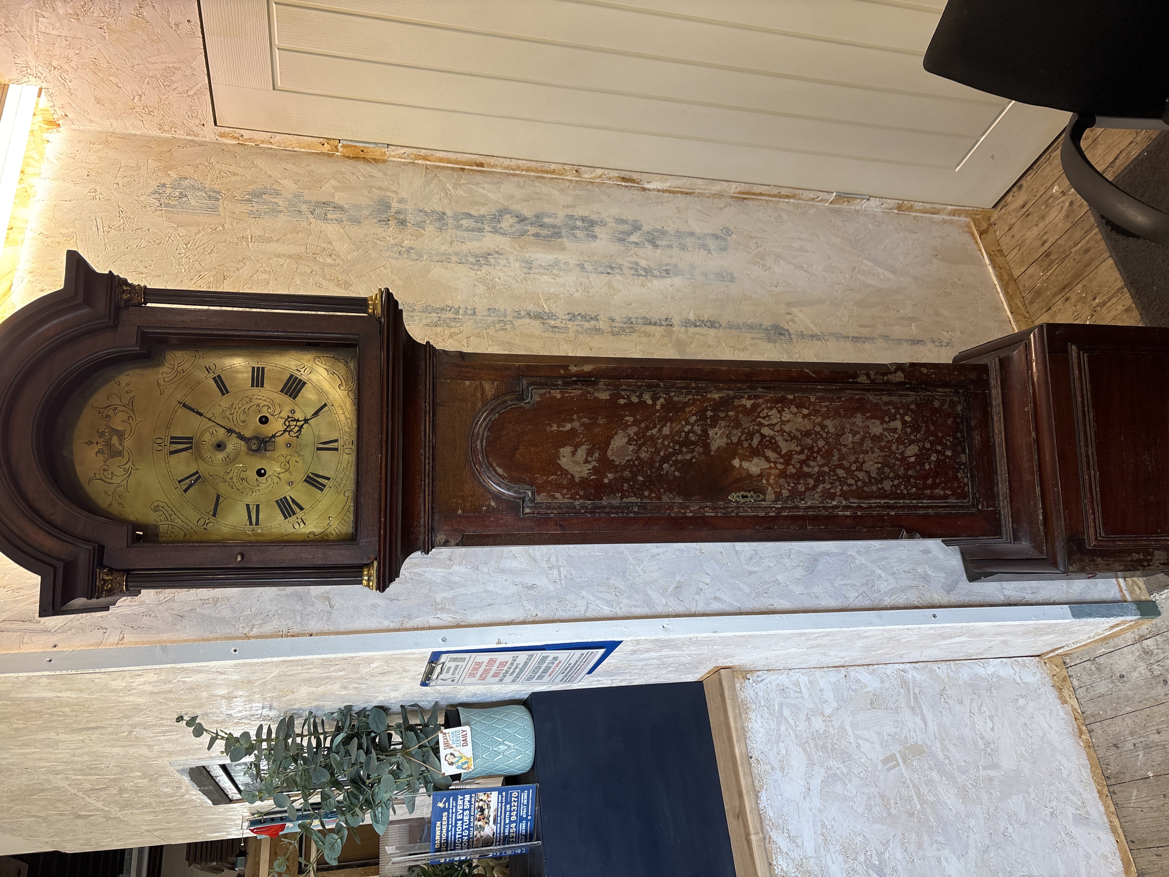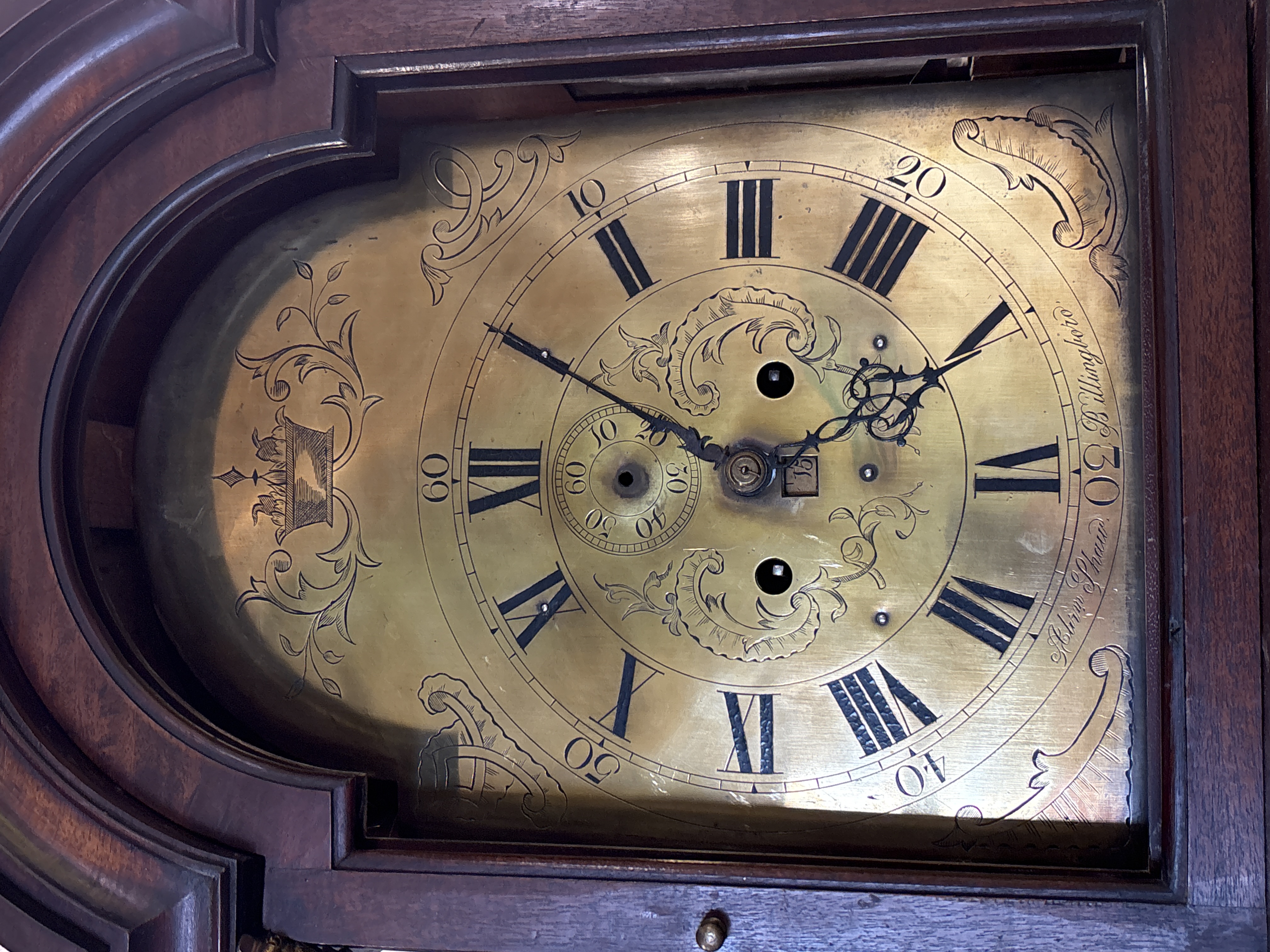 A George III mahogany longcase clock by Arthur Shaw of Billingborough. The arched brass dial features a chapter ring with Roman numeral hour markers and Arabic minute markers, enclosing a finely engraved centre with scrolling foliate motifs, a subsidiary seconds dial, and a date aperture. The dial is signed Arthur Shaw Billingboro along the lower edge of the chapter ring. It is fitted with ornate pierced black steel hands. The 8-day mechanical twin-train movement is weight-driven and strikes on a bell, featuring two winding holes. The mahogany case includes an arched hood with brass-capped fluted columns and a trunk with a long, shaped arched door, showing cross-banding and fine stringing details typical of the period. Quantity: 1. Dimensions: Height 215cm, Width 48cm, Depth 25cm. A/F