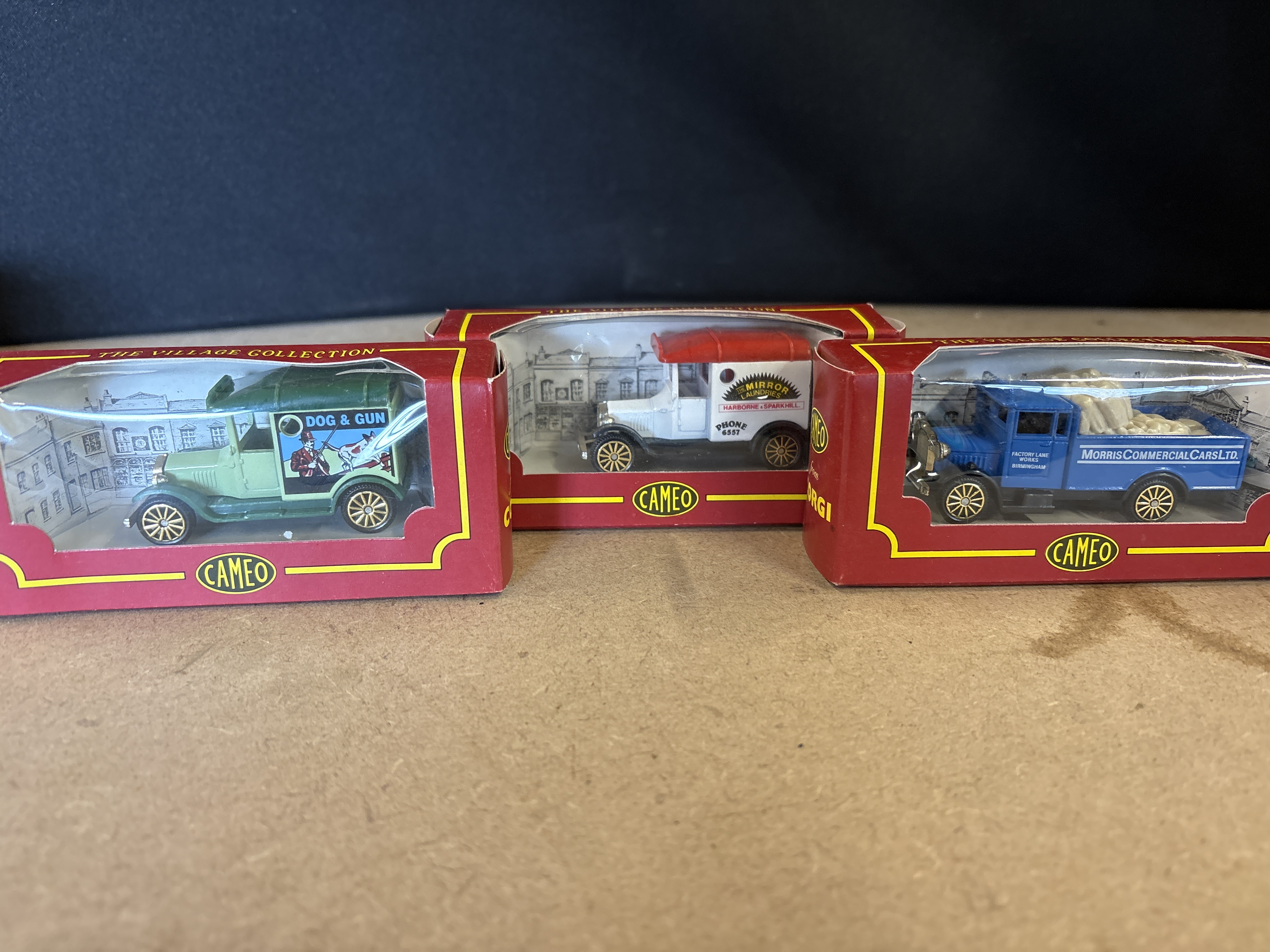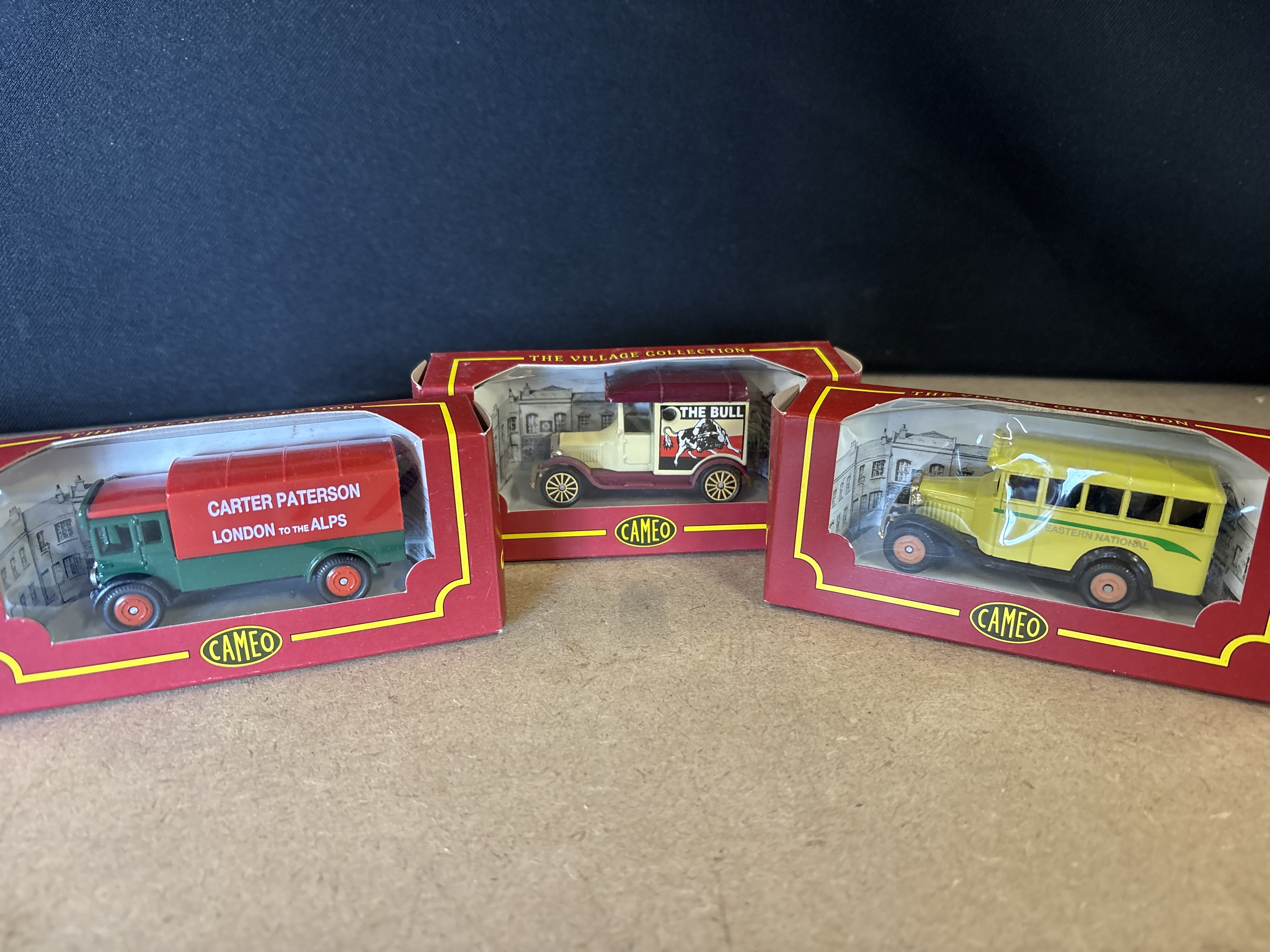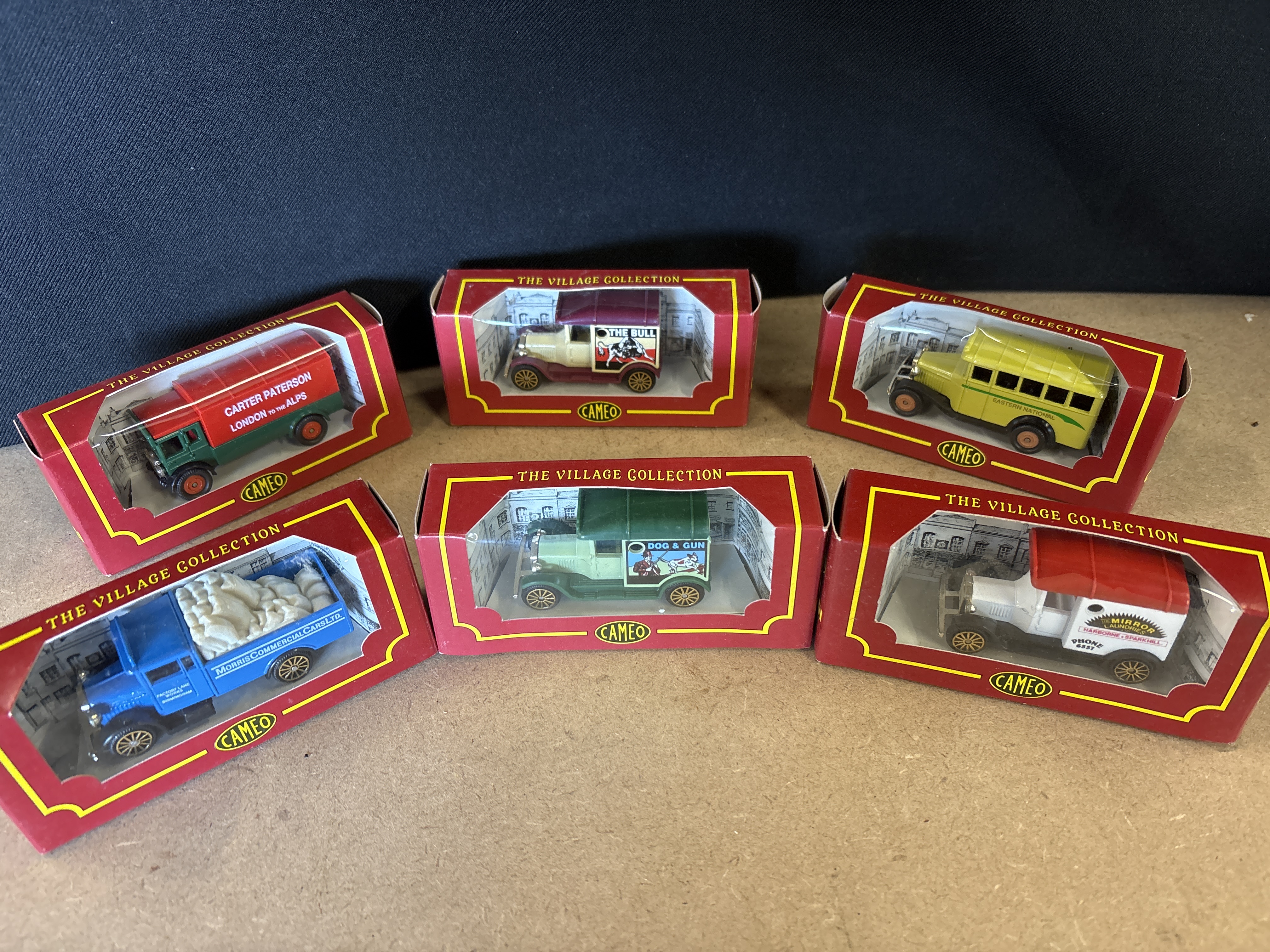 A collection of 6 vintage-style miniature commercial vehicles and buses from The Village Collection, manufactured by Cameo, a brand by Corgi. These models are constructed from metal with plastic components and feature a simple rolling wheel mechanism. Each vehicle is housed in its original red and yellow window display box. The lot includes a Carter Paterson London to the Alps van in red and green livery, The Bull pub delivery van in cream and maroon, an Eastern National bus in yellow and green, a Dog and Gun delivery van in two-tone green, a Mirror Laundries Harborne and Sparkhill van in white and red, and a Morris Commercial Cars Ltd. flatbed truck in blue with a molded sack load. The models feature detailed period-accurate graphics and branding characteristic of early 20th-century British transport.
