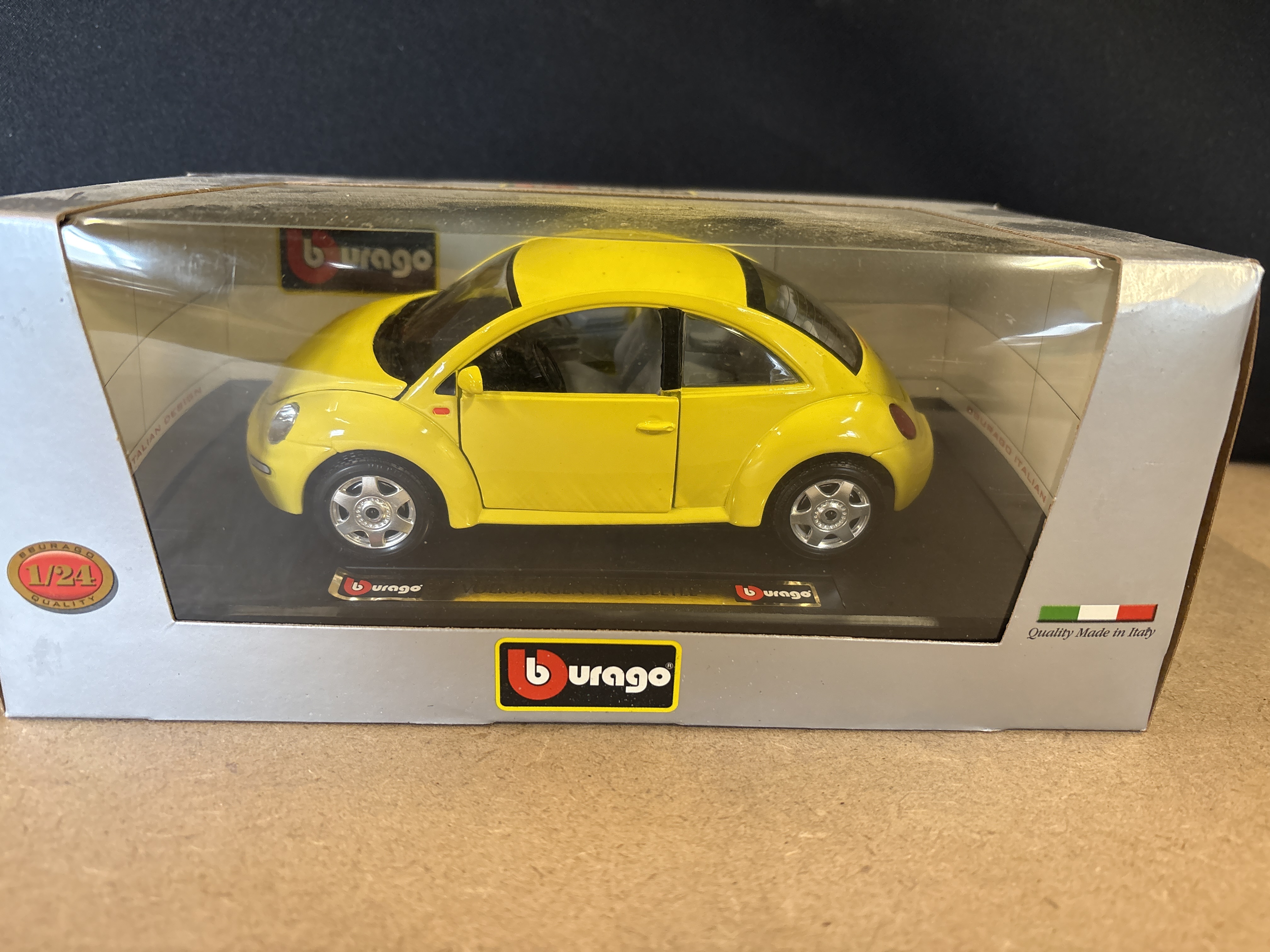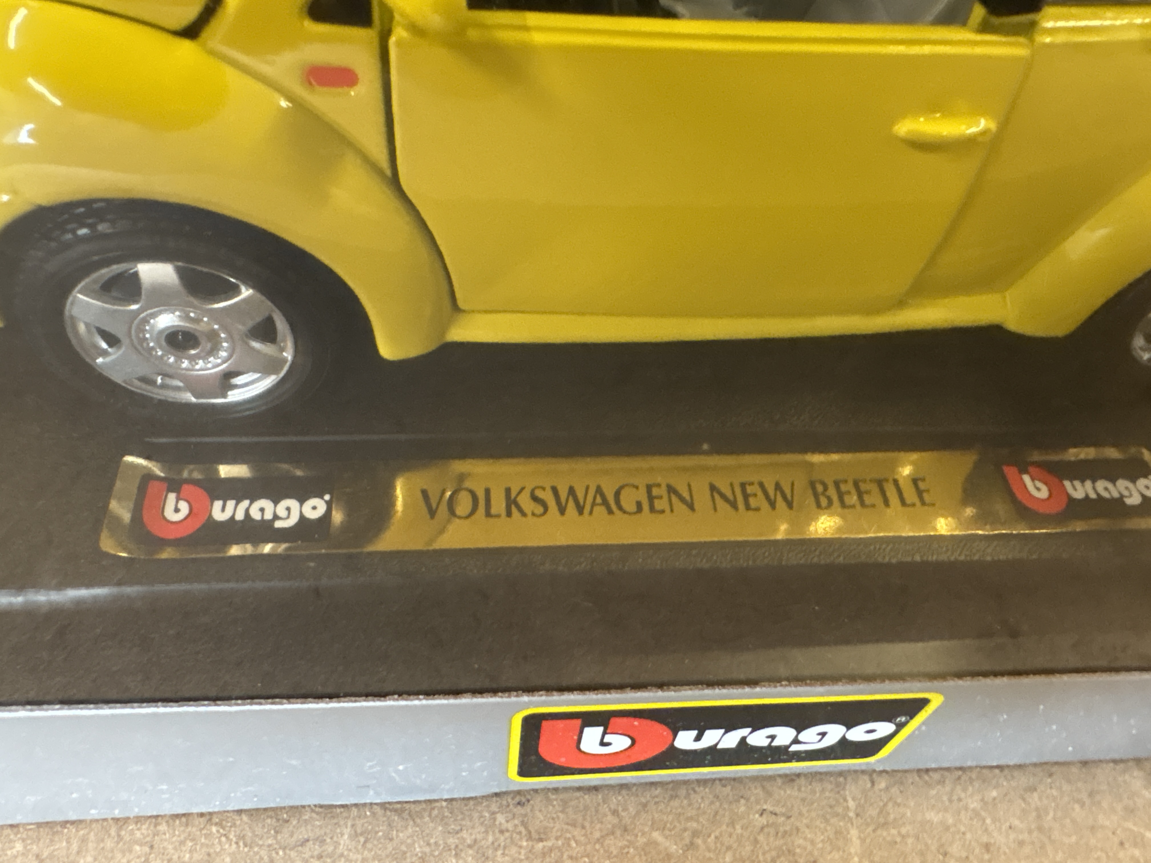 Produced by Bburago, this 1/24 scale model represents the Volkswagen New Beetle. Constructed from metal, the vehicle is finished in a vibrant yellow colour and is part of the BBurago Collection. This Italian-made model features a detailed interior and is mounted on a black plastic display plinth which features a gold-toned nameplate flanked by the manufacturer’s logo. The item is housed in its original silver-coloured retail window box. Markings on the packaging include the Bburago brand name and the Quality Made in Italy seal.