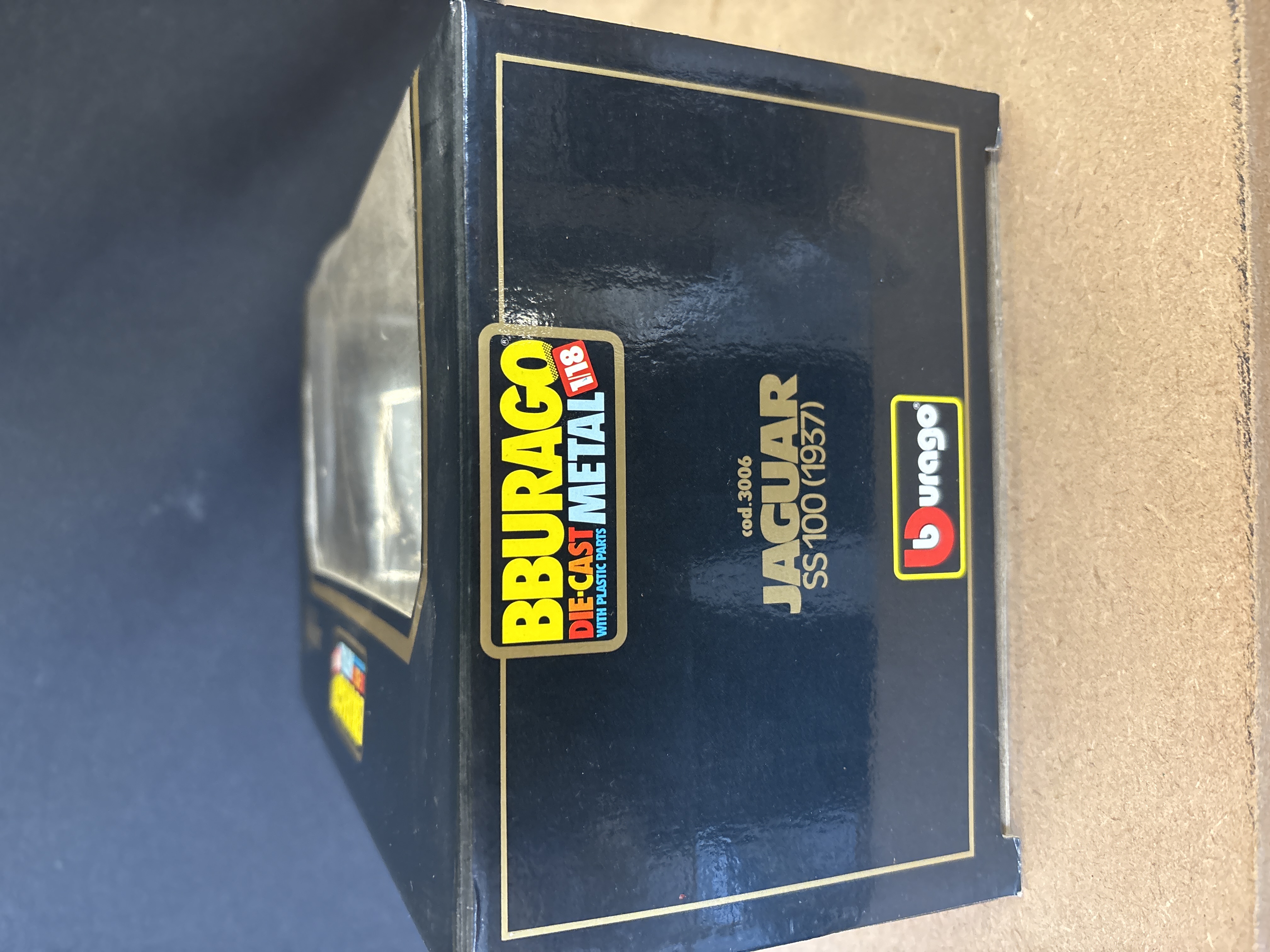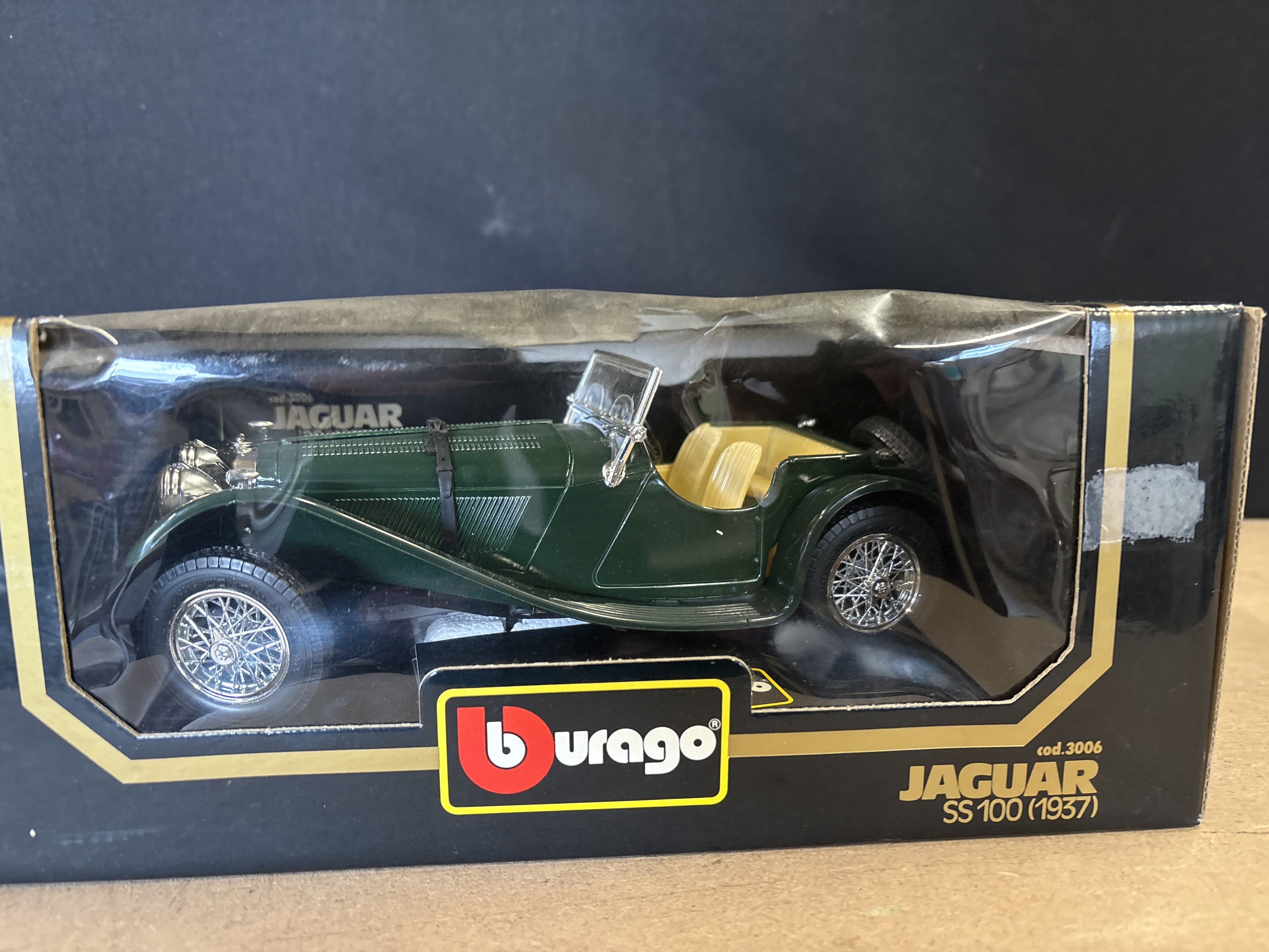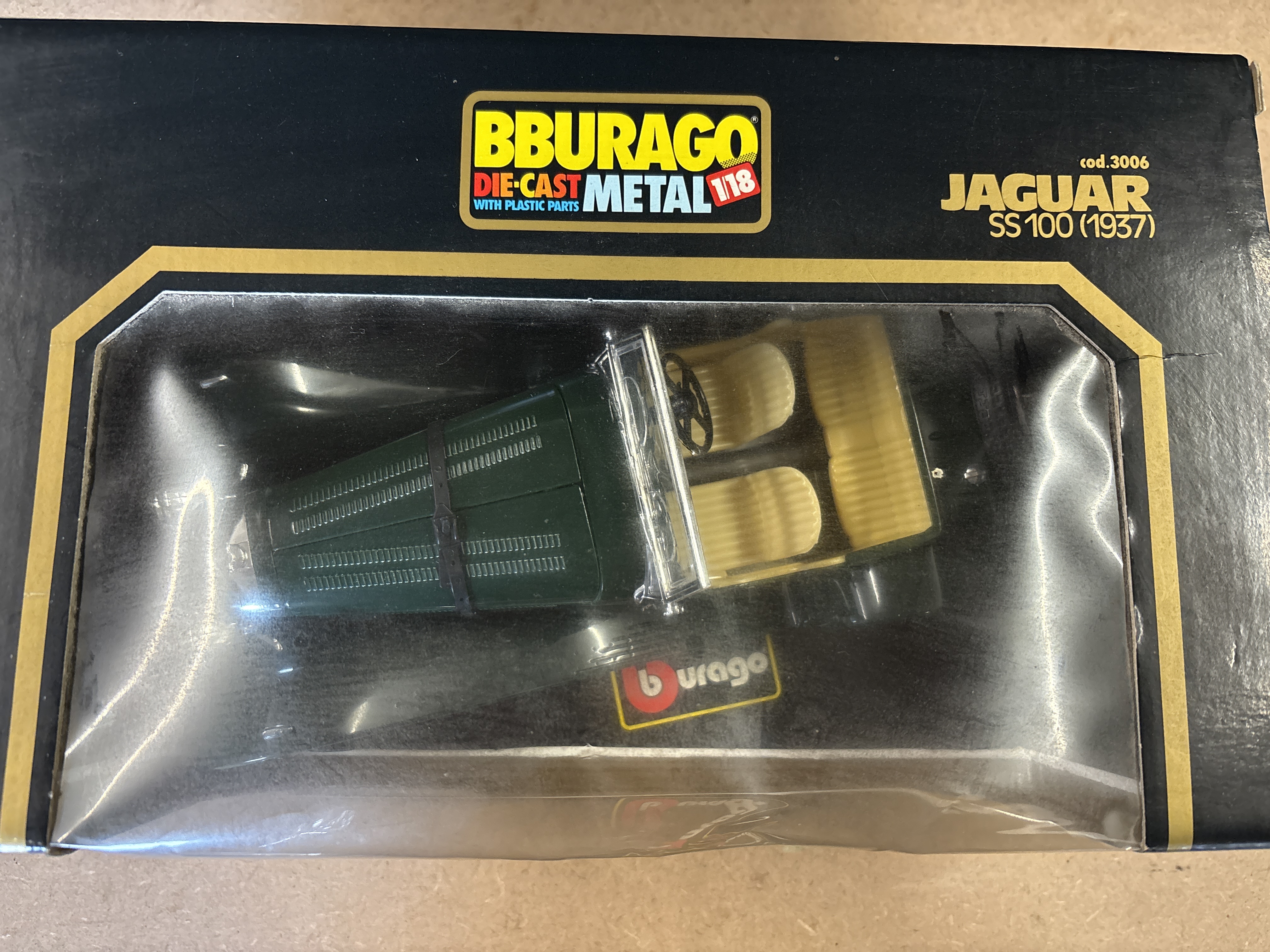 A 1/18 scale model of a 1937 Jaguar SS100 roadster produced by Bburago. This Burago model is constructed from metal and finished in traditional British Racing Green with a contrasting tan interior. The vehicle features intricate detailing including spoked wheels, a front-mounted spare tyre, a detailed cockpit, and a louvered bonnet with simulated leather security straps. The item is housed in its original black and gold window box, labelled as cod.3006 JAGUAR SS100 (1937). The model remains factory-secured to the internal cardboard display plinth. Dimensions: Approximately 23 to 25 cm in length.