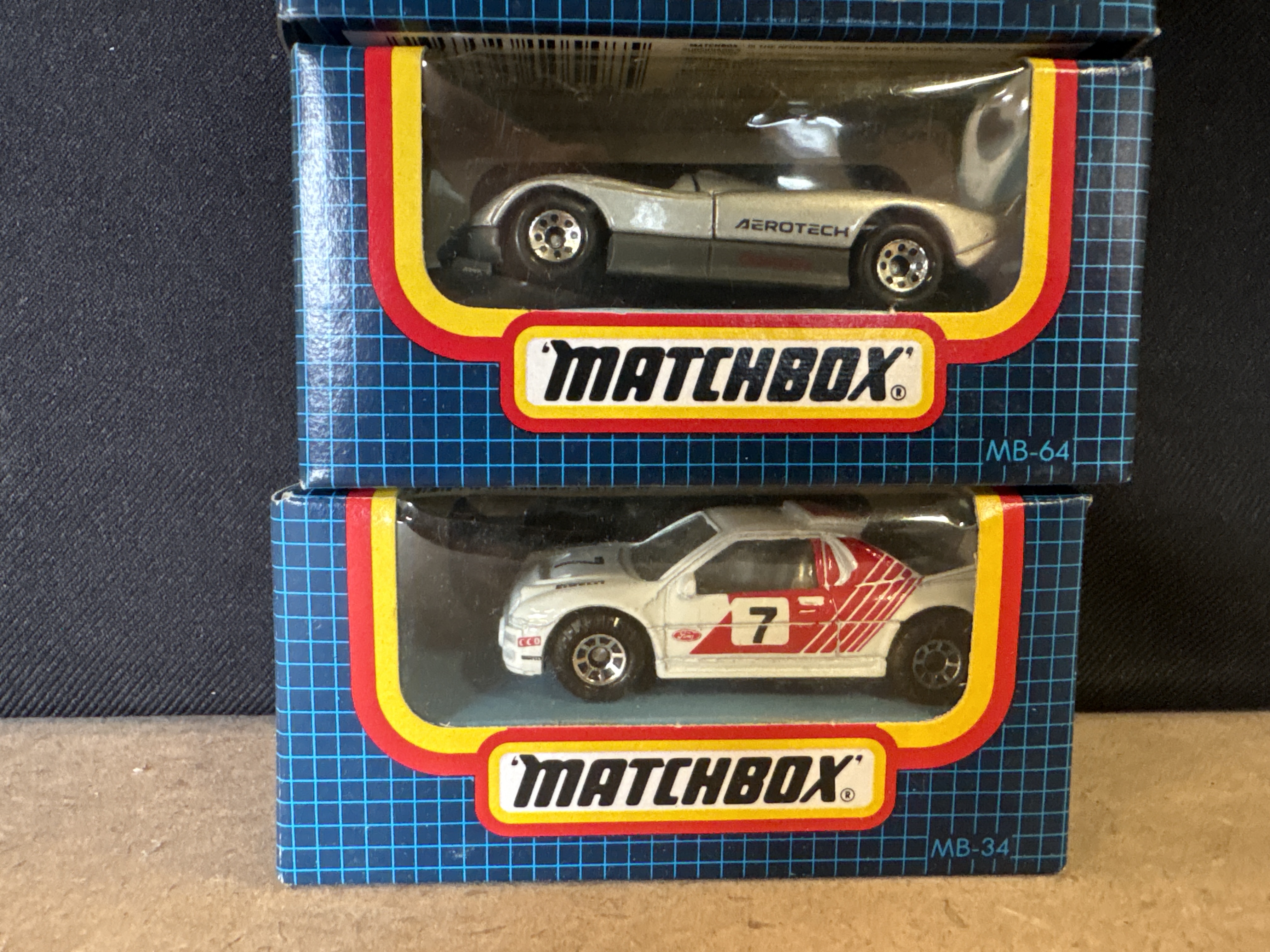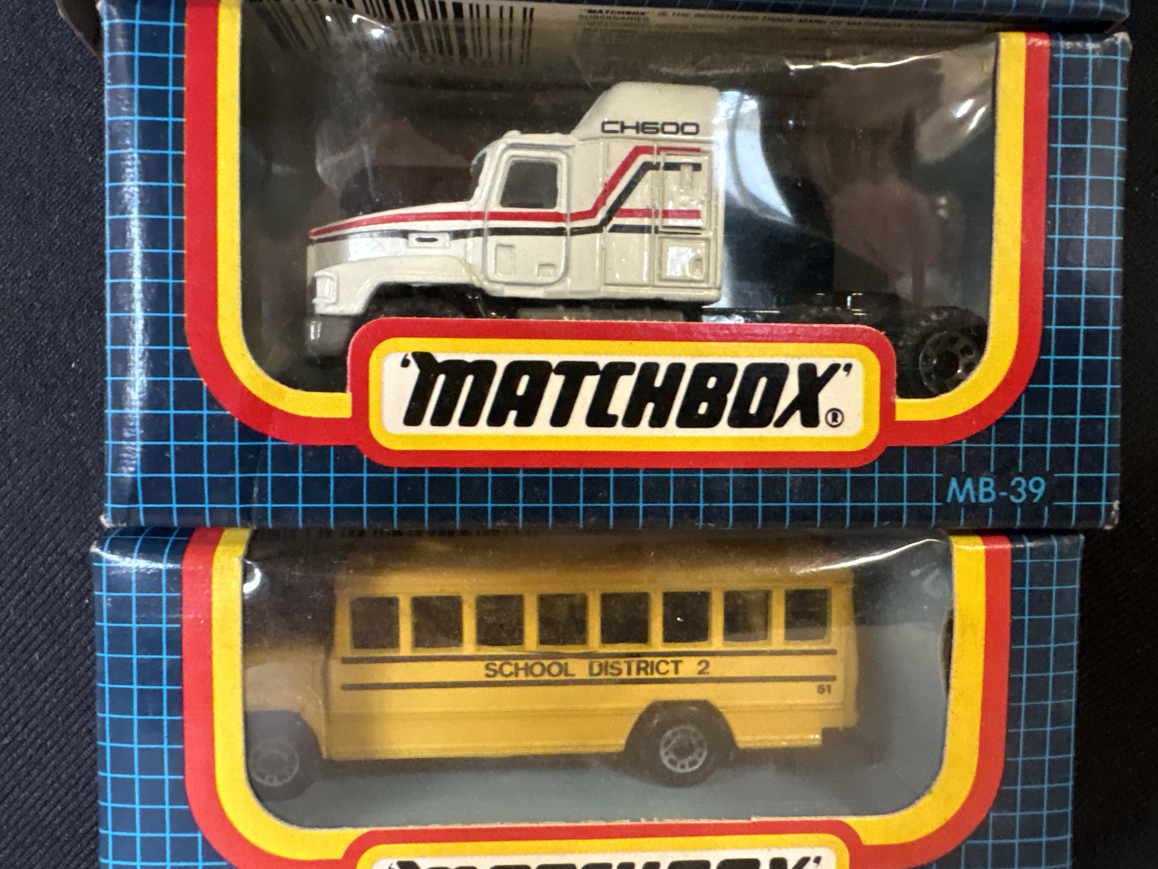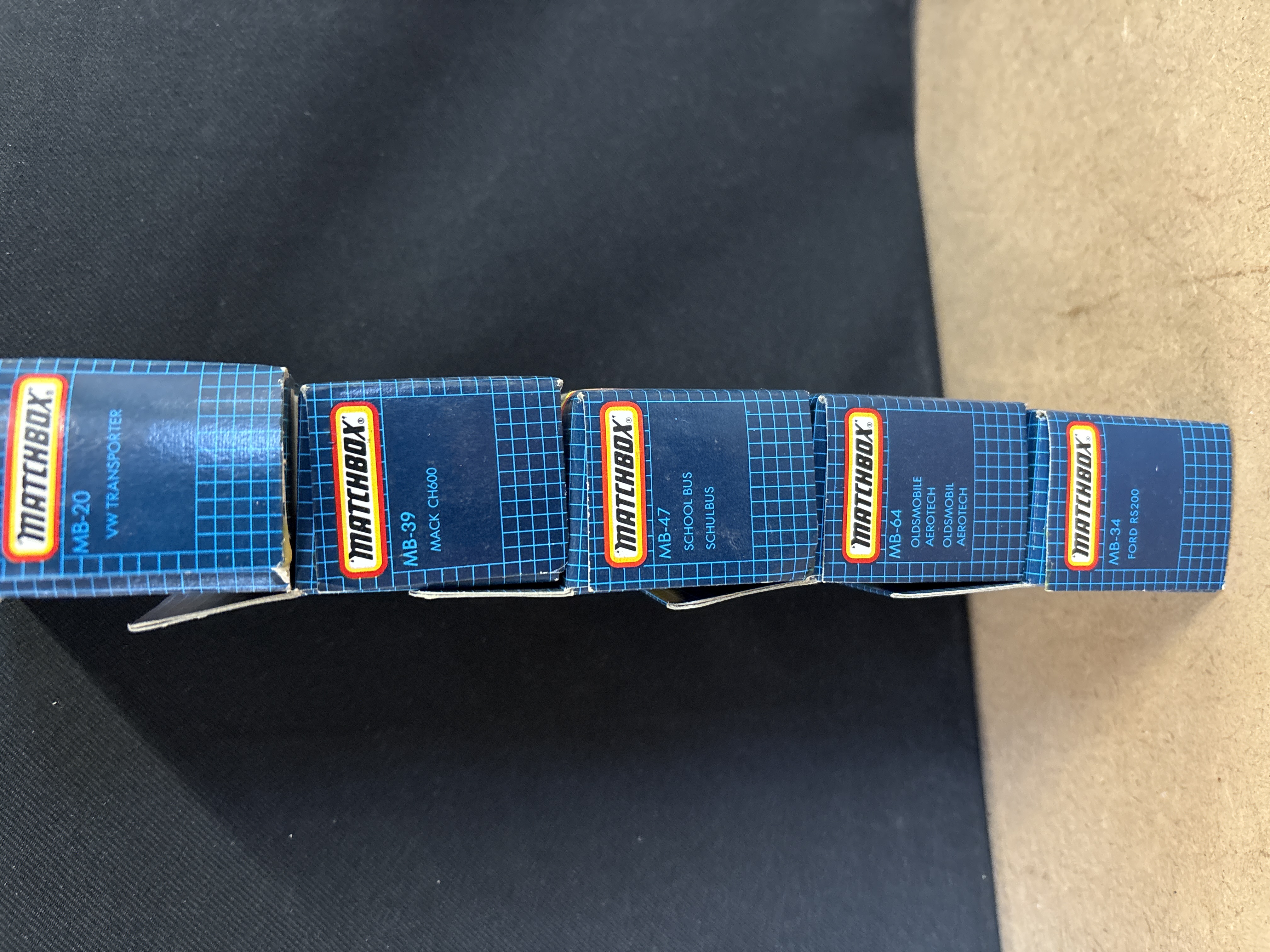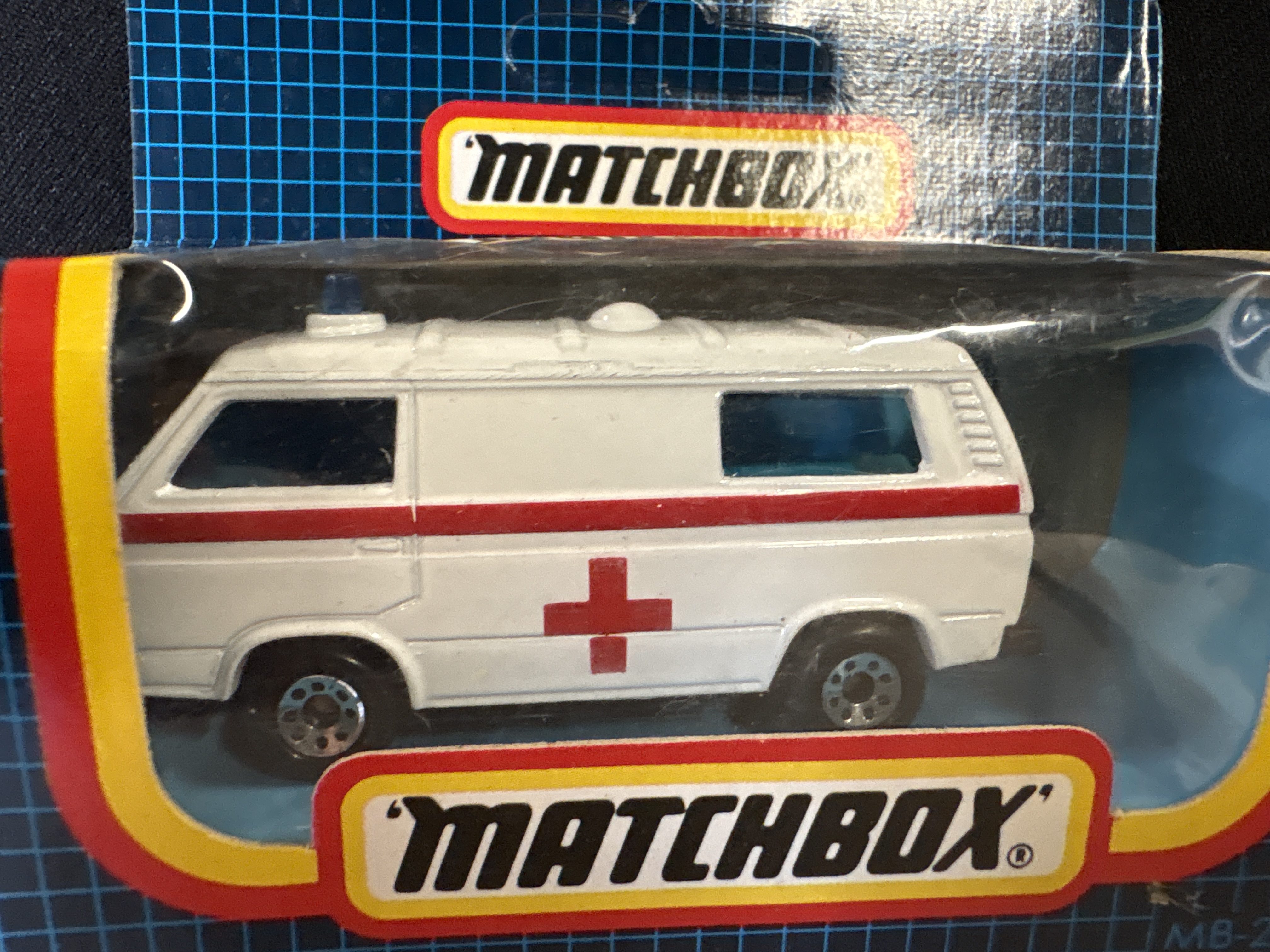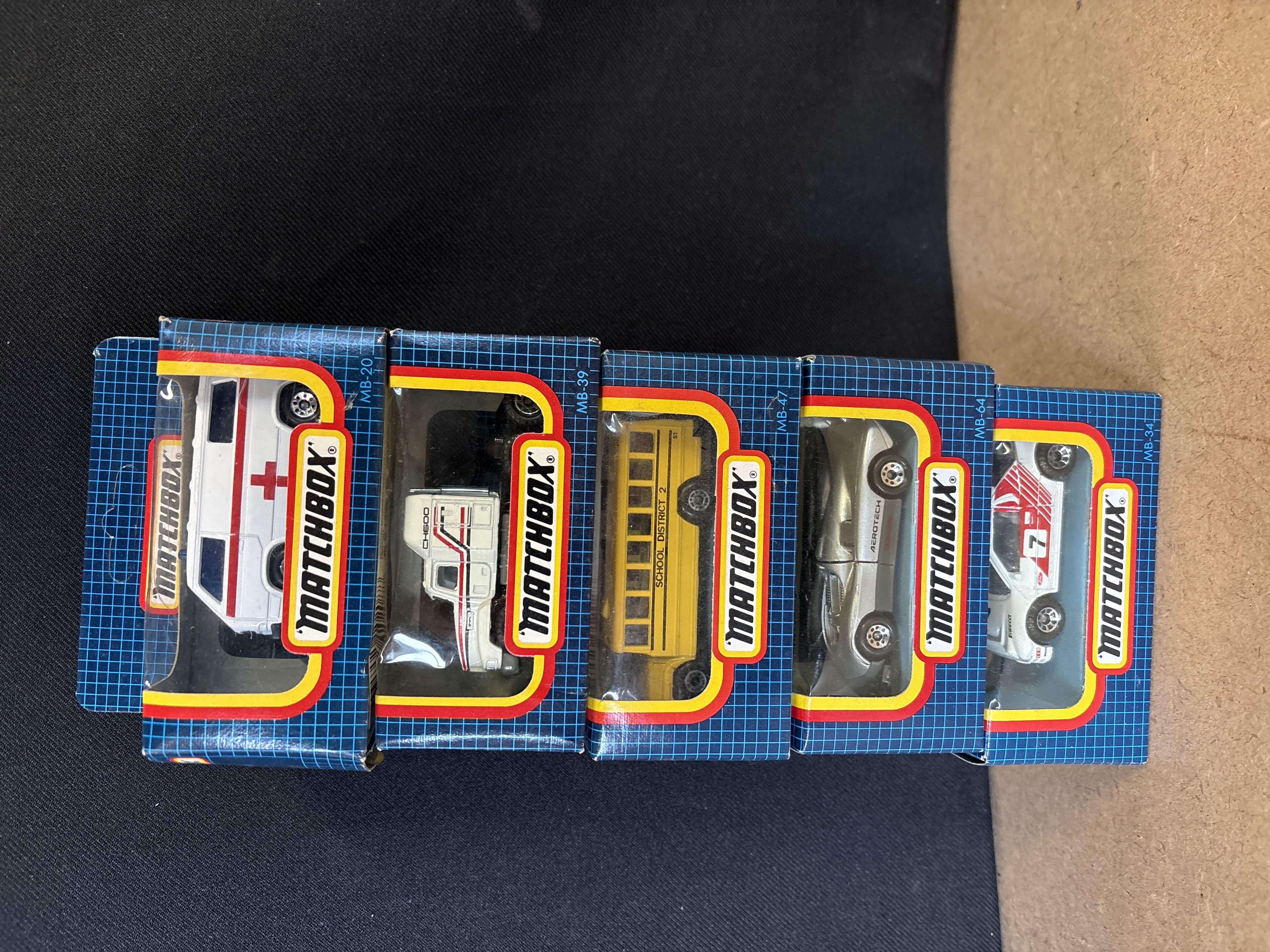 A collection of 5 Matchbox die-cast vehicles. This group features metal bodies with plastic chassis and interior components. Each model is housed in its original early 1990s blue-grid window display box. The collection includes: MB-20 VW Transporter Ambulance in white with red cross graphics and blue emergency light; MB-39 Mack CH600 semi-truck cab in white with red and black stripes; MB-47 School Bus in yellow with School District 2 markings; MB-64 Oldsmobile Aerotech concept car in silver and grey; and MB-34 Ford RS200 rally car in white with red racing livery and number 7 decals. All vehicles feature standard free-rolling wheel mechanisms.