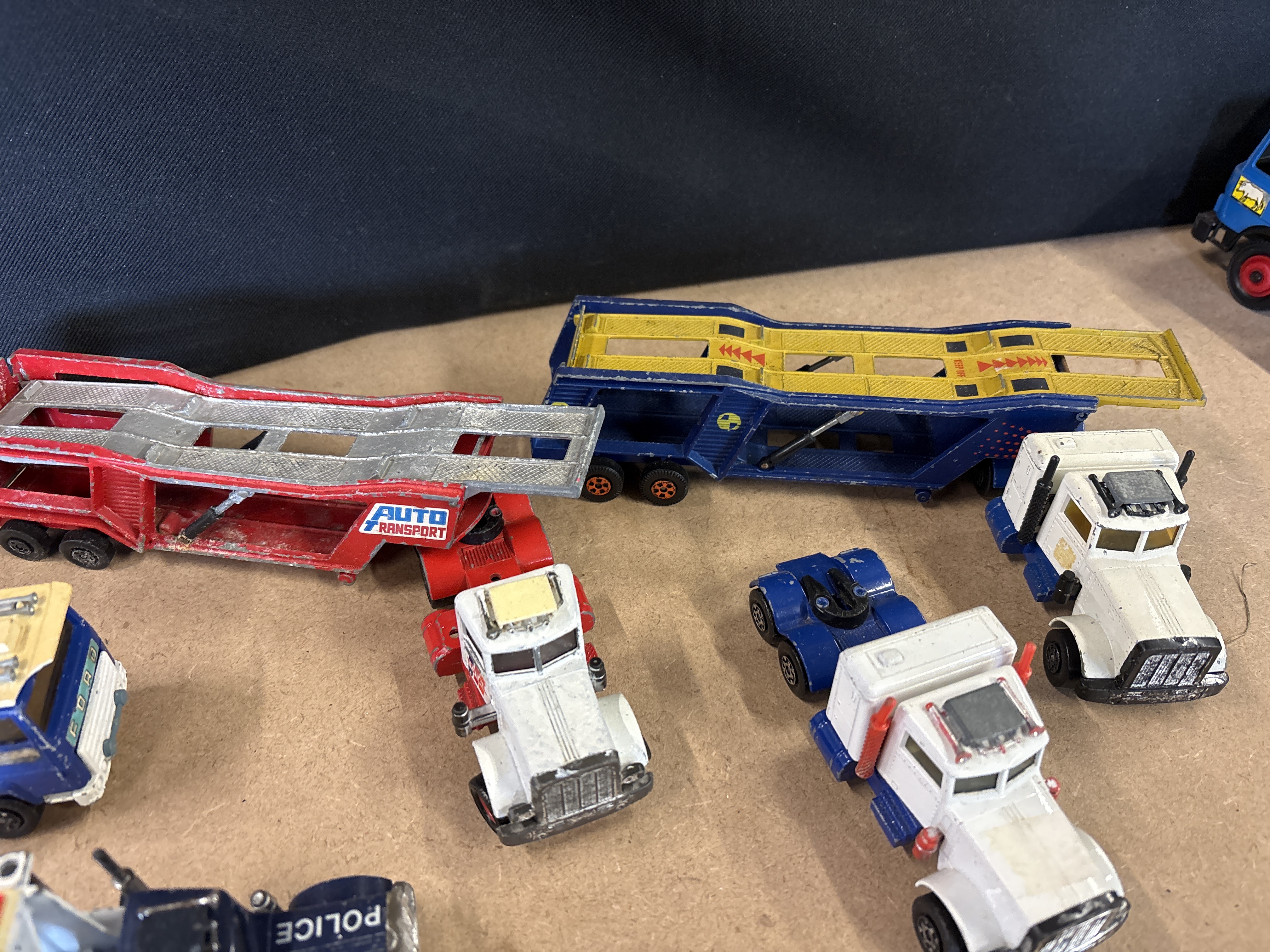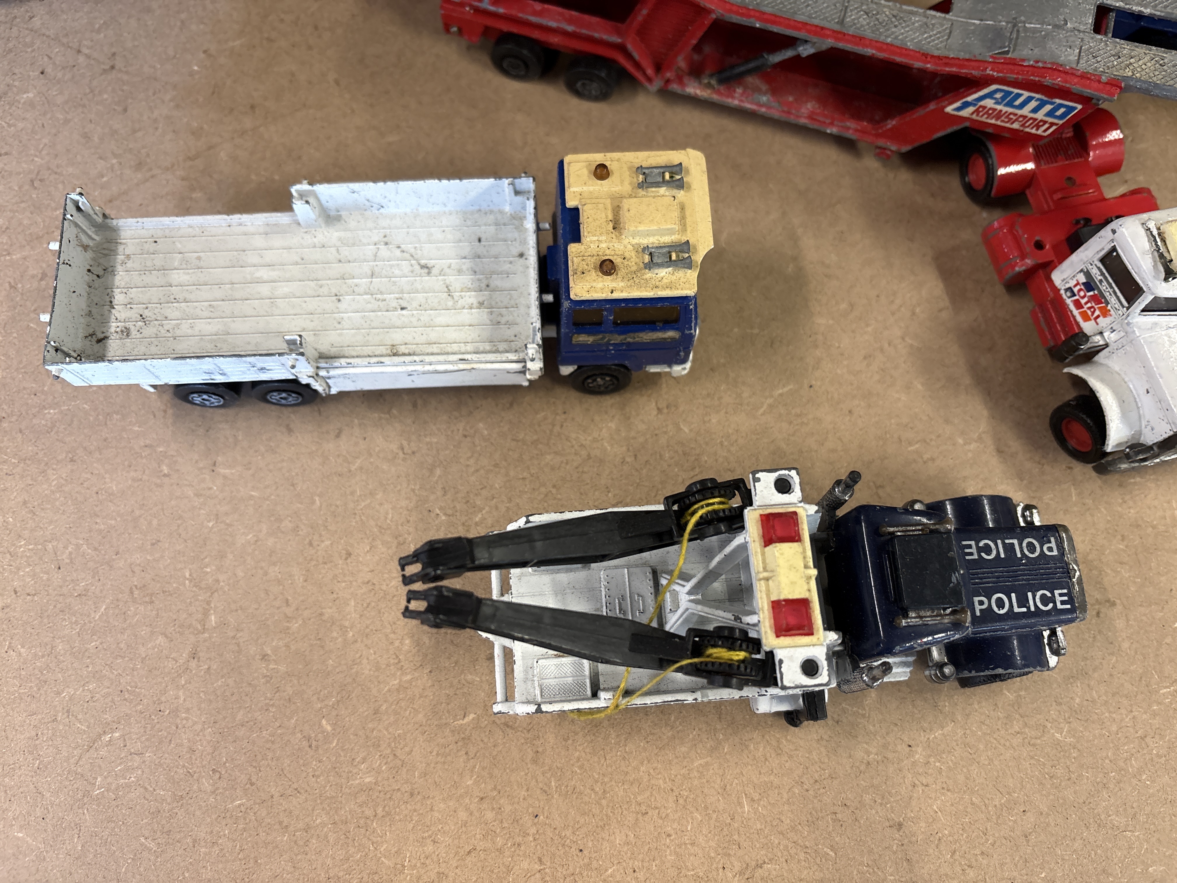 A group of five vintage Matchbox commercial and emergency vehicles. Constructed from metal with integrated plastic components, this collection features a variety of heavy-duty haulers and service vehicles. The lot includes a large Peterbilt-style twin-boom tow truck finished in a blue and white “City Police Highway Patrol” livery, complete with plastic light bar and movable booms. Also present is a Ford flatbed truck with a blue cab and tan roof, alongside two double-deck “Auto Transport” trailers in red/silver and blue/yellow colourways. The group is completed by a white Peterbilt-style semi-tractor cab featuring “TOTAL” decals. These models are classic examples of Matchbox die-cast engineering from the late 20th century and are offered without original packaging.