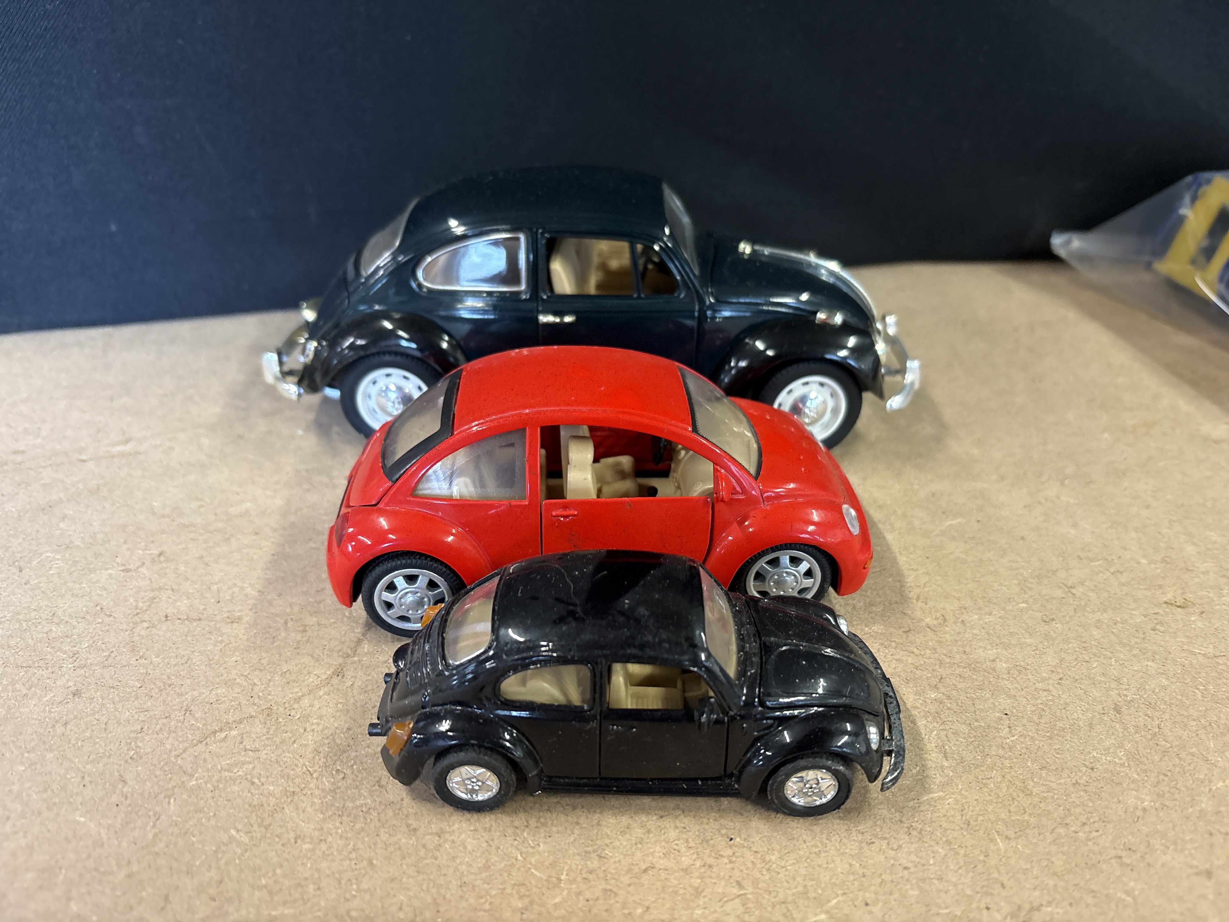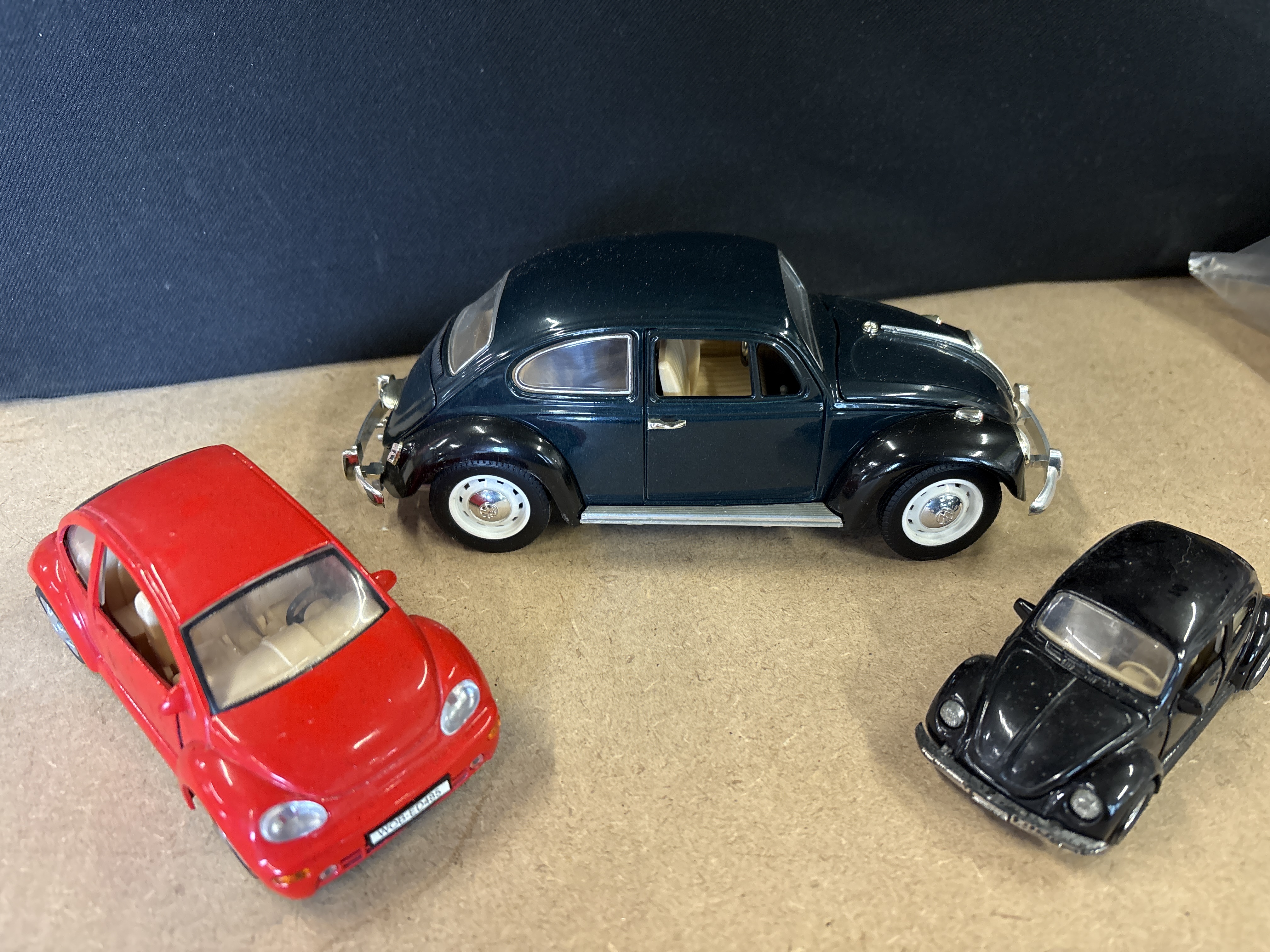 A collection of three Volkswagen Beetle model cars by KiNSMART and Bburago, representing the evolution of the vehicle through the years. These models are constructed from metal with plastic interior components and windows. The set includes a 1:24 scale 1967 Classic Beetle in a deep hunter green colour with black wings, featuring chrome-finished bumpers and white hubcaps with the VW emblem. The second item is a modern New Beetle in red, featuring a tan interior and a front license plate reading WOB CP 485, characteristic of Bburago or Maisto productions. The third item is a smaller scale classic Beetle finished in black with a tan interior and silver-toned wheels. All models are unboxed and feature free-rolling or pull-back wheel mechanisms.
