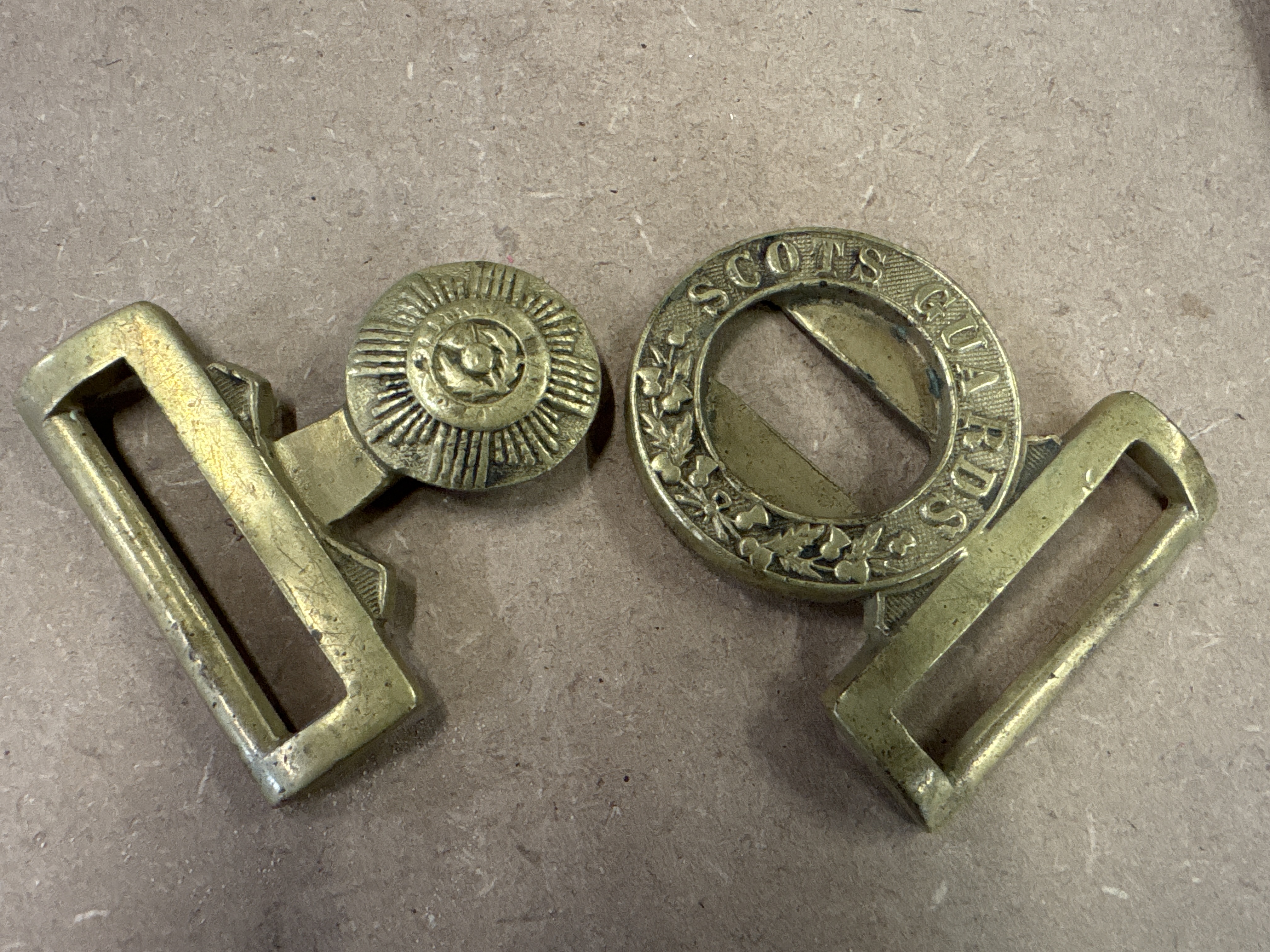 A standard pattern British Army Other Ranks (OR) two-piece brass waist belt buckle for the Scots Guards. This service item features a female outer ring embossed with the regimental title SCOTS GUARDS and a decorative wreath of thistles at the base. The male central circular boss depicts the Star of the Order of the Thistle, featuring a central thistle motif surrounded by the motto Nemo Me Impune Lacessit (No one provokes me with impunity). The reverse is fitted with a standard hook-and-loop fastening mechanism. This style of locket clasp was a staple of the Guards Division dress uniform throughout the late 19th and early 20th centuries. Identification is confirmed by the specific thistle iconography unique to the regiment.