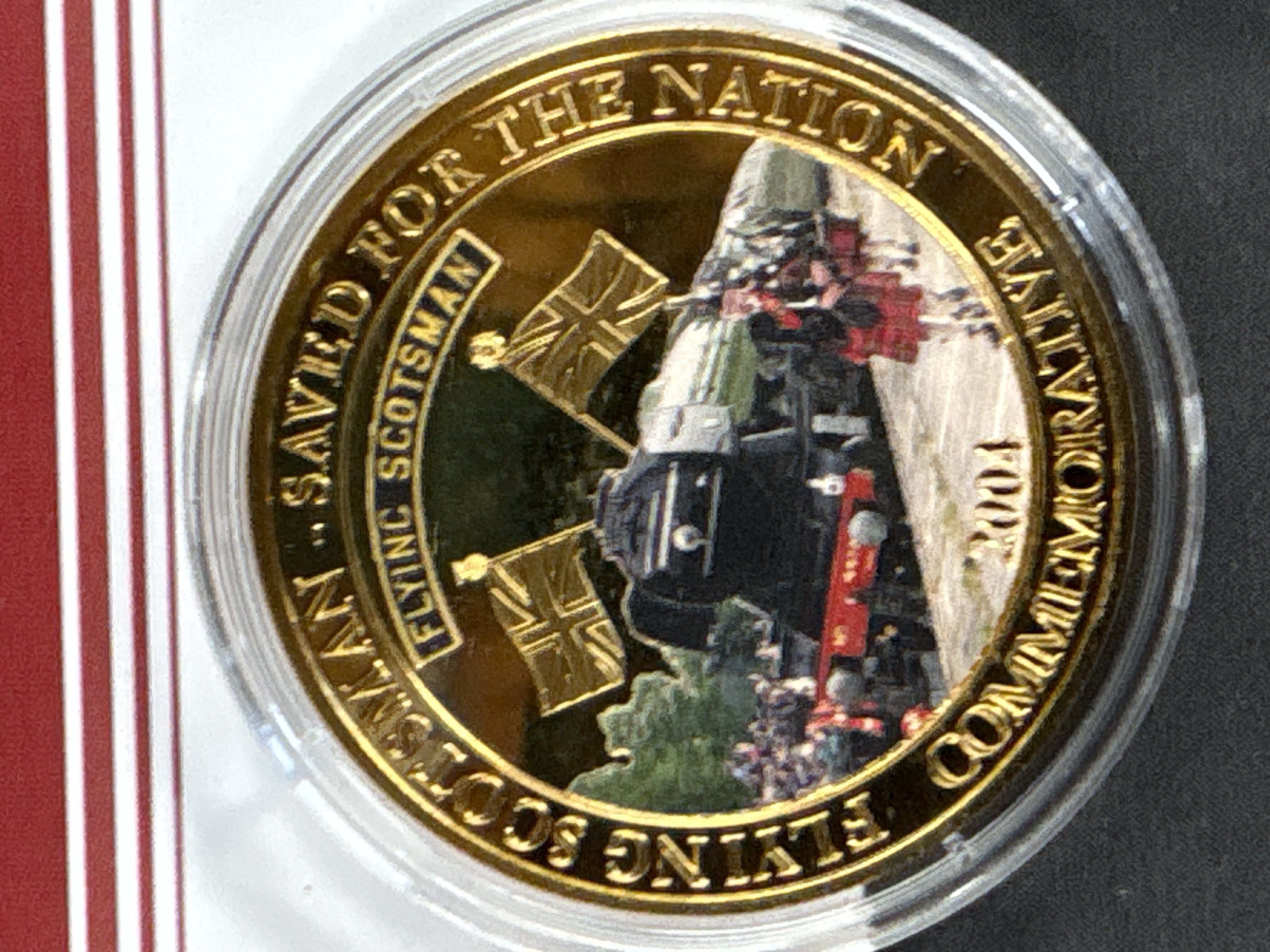 Private commemorative issue produced by The Bradford Exchange as part of the Flying Scotsman Kings of Steam Commemorative Collection. This specific issue is designated as The Film Star. The medal features a colourised obverse vignette and is struck with a proof-like finish. The item is accompanied by a certificate of authenticity and a blue fabric presentation pouch featuring a gold-embossed logo.