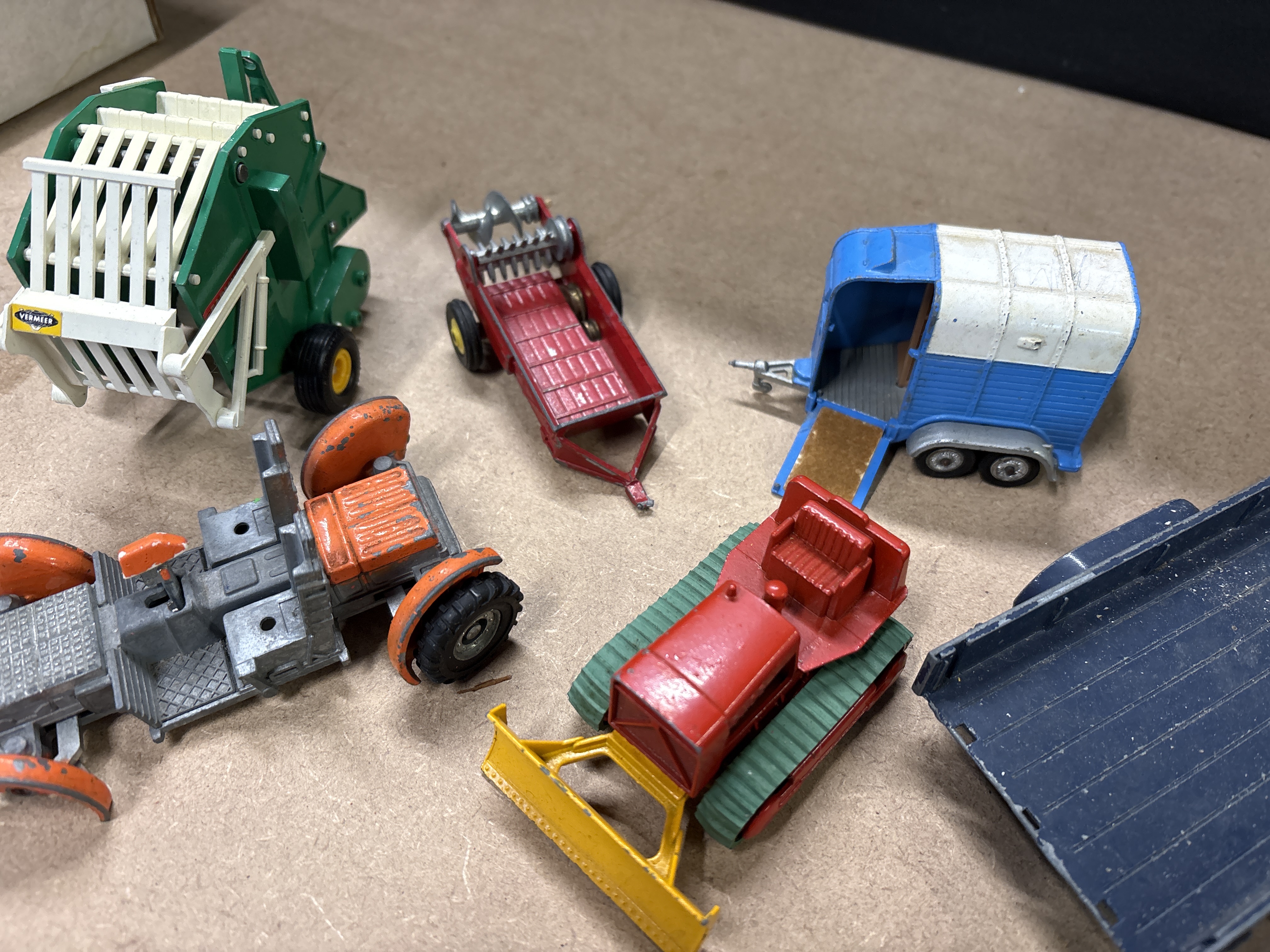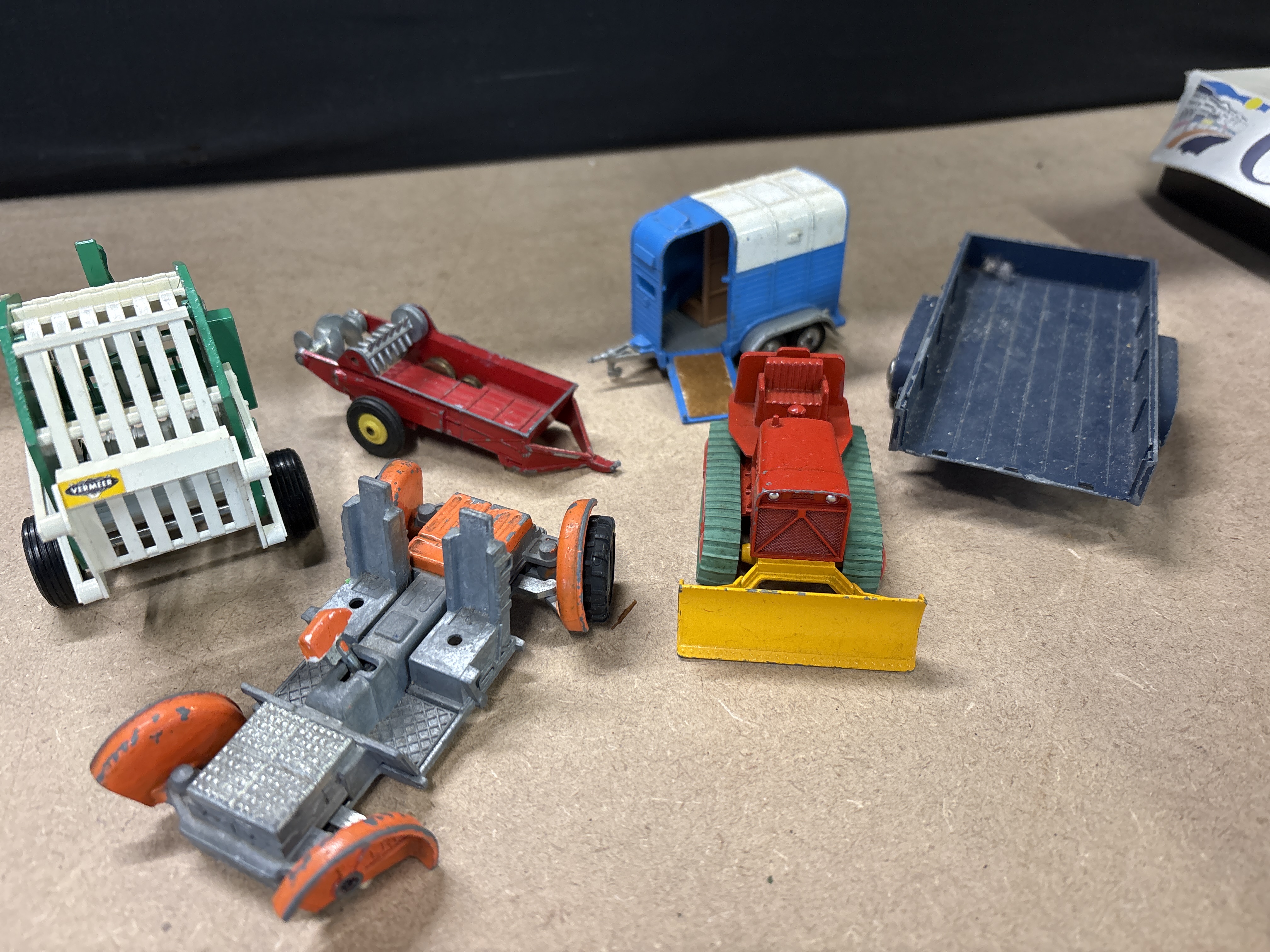 A collection of 6 vintage metal farm and construction models primarily manufactured by Britains Ltd and Matchbox (Lesney). This lot includes a Vermeer / Farmhand round baler featuring an opening rear section and authentic decals, a Britains manure spreader with a rotating drum mechanism linked to the wheels, and a Britains horse trailer finished in blue with a white roof and a functional fold-down loading ramp. The set also features a Matchbox Lesney No. 8 Caterpillar crawler tractor with an adjustable front blade and green rubber tracks, a Britains blue low-loader flatbed trailer, and an incomplete orange and grey tractor chassis. All items are constructed from metal, consistent with mid-century die-cast production. This group represents a diverse range of agricultural equipment and machinery from leading British toy manufacturers. No original packaging is included.