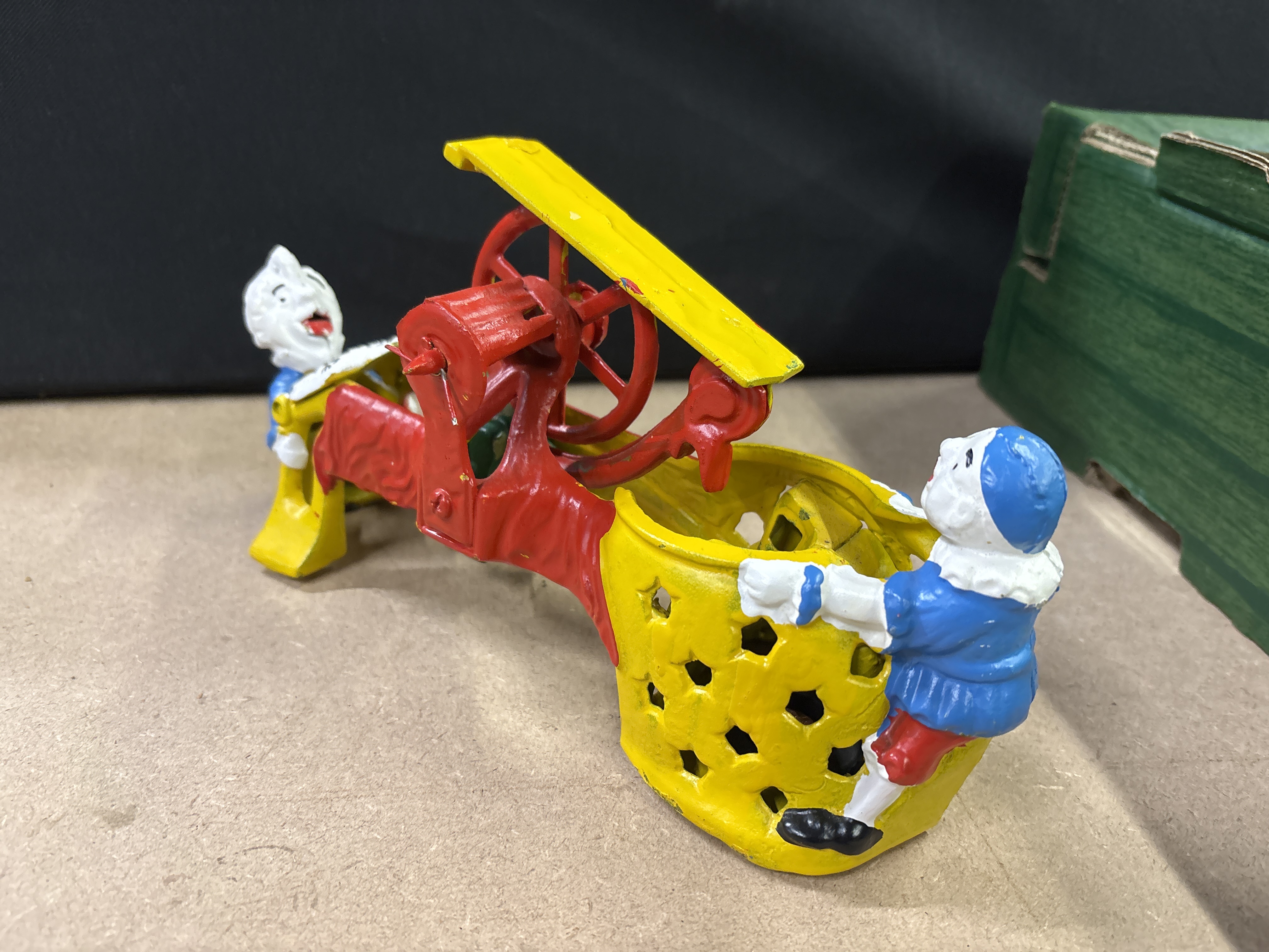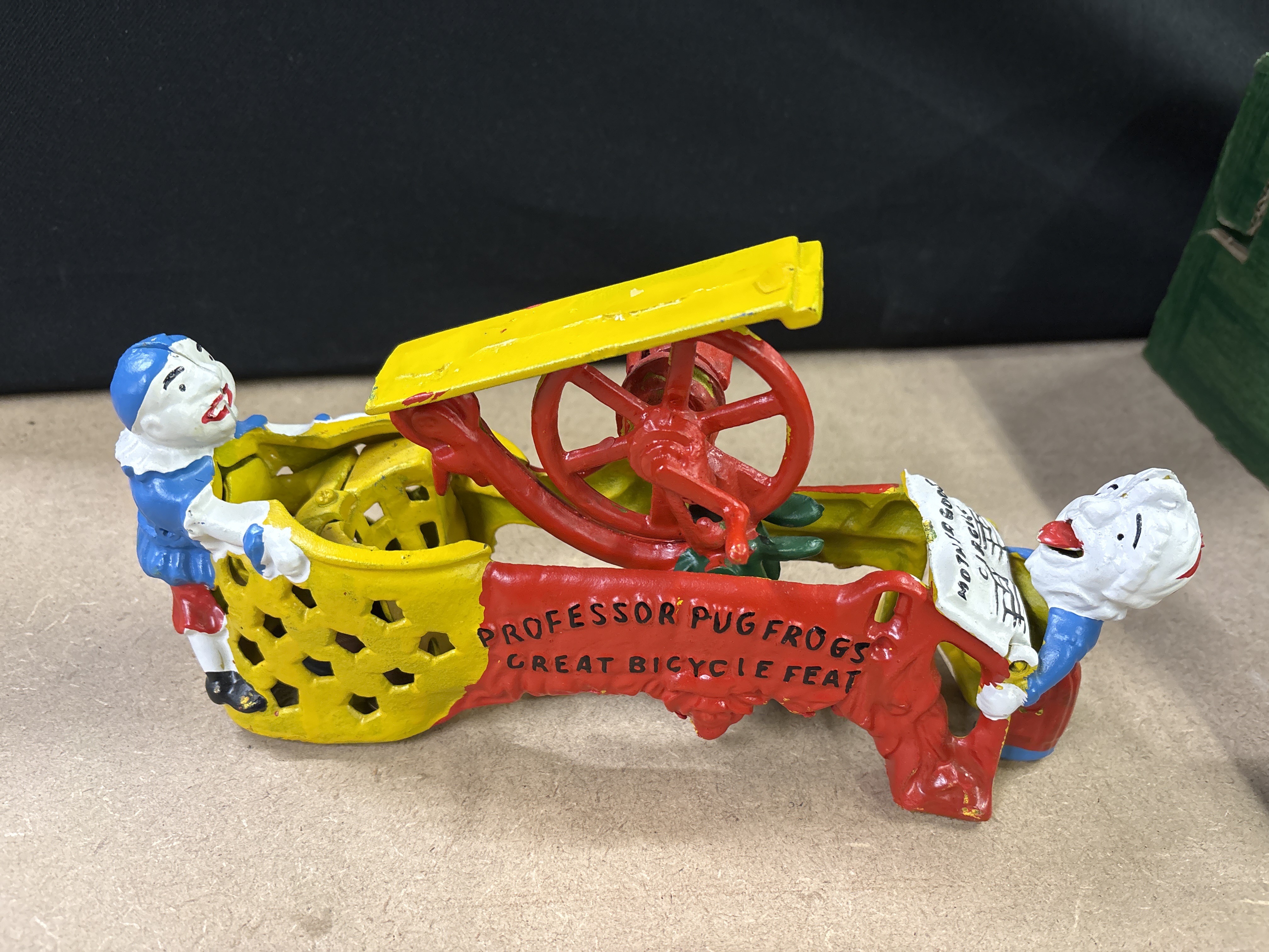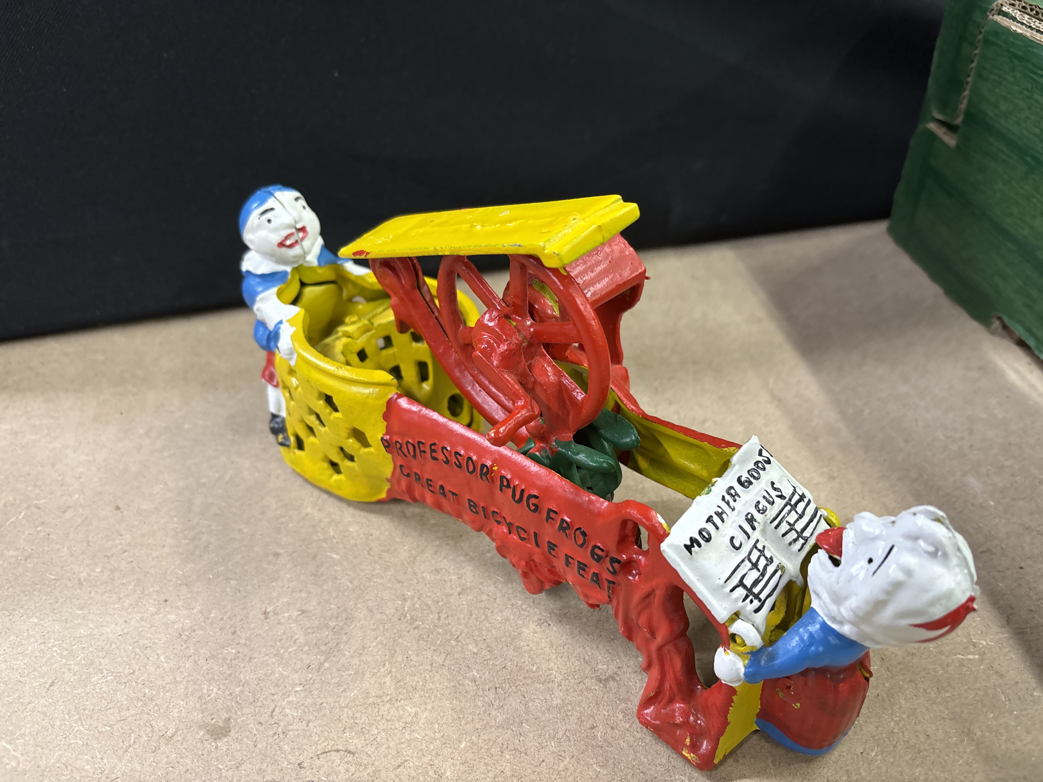 A cast iron mechanical Mother Goose Circus money bank featuring Professor Pug Frog’s Great Bicycle Feat in multi-coloured paint.