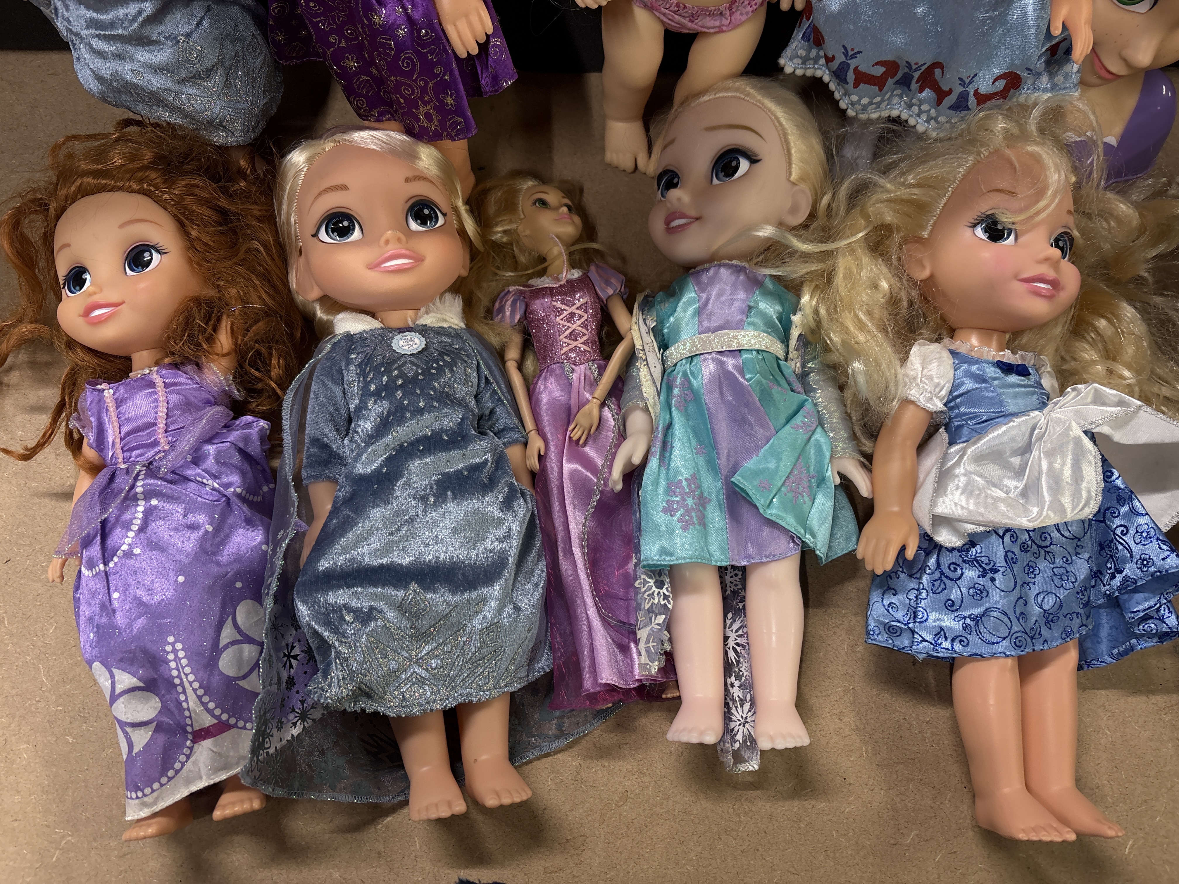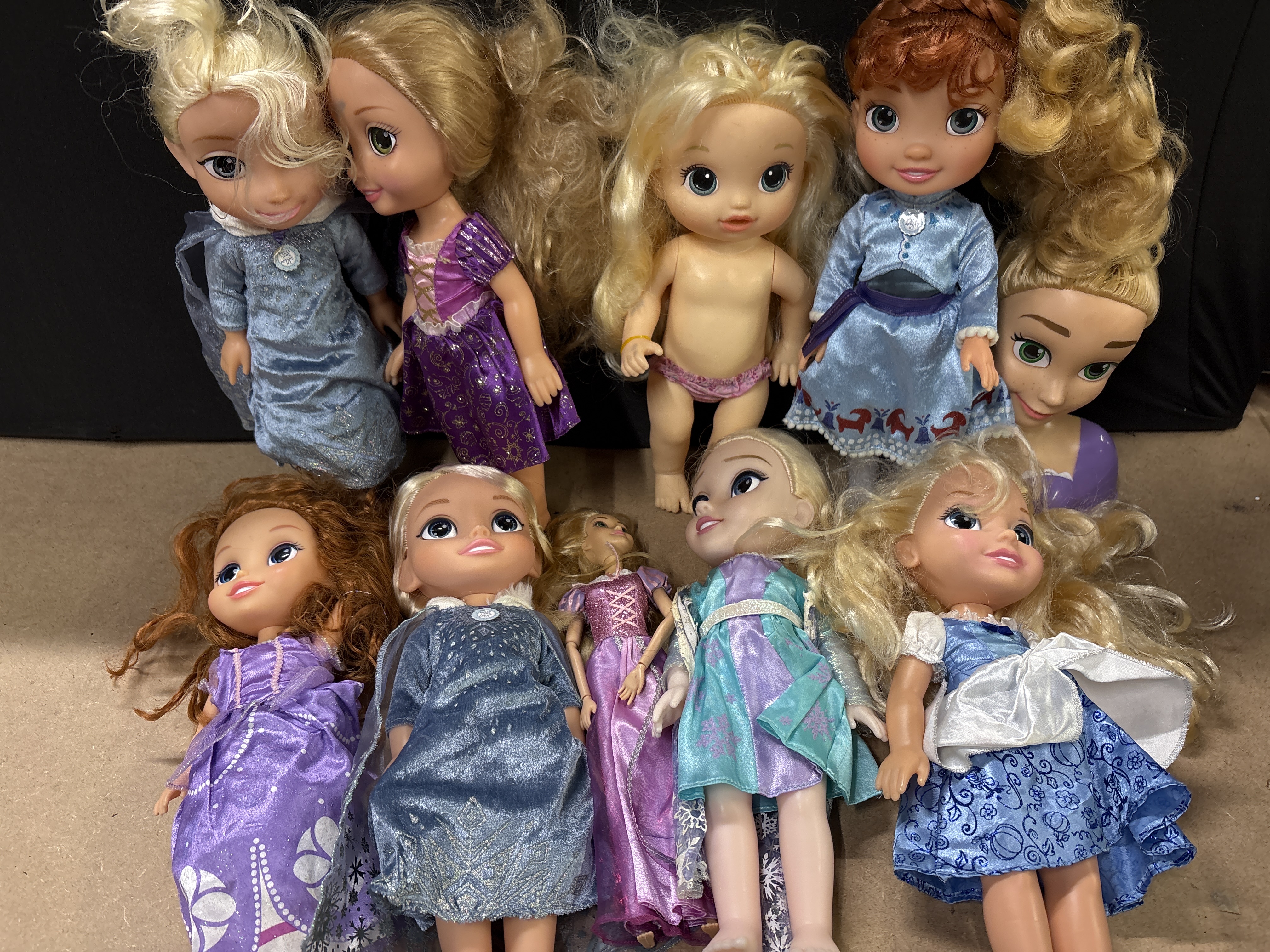 A collection of 10 character dolls and a styling head featuring Disney characters such as Elsa, Anna, and Rapunzel in various colourful outfits.