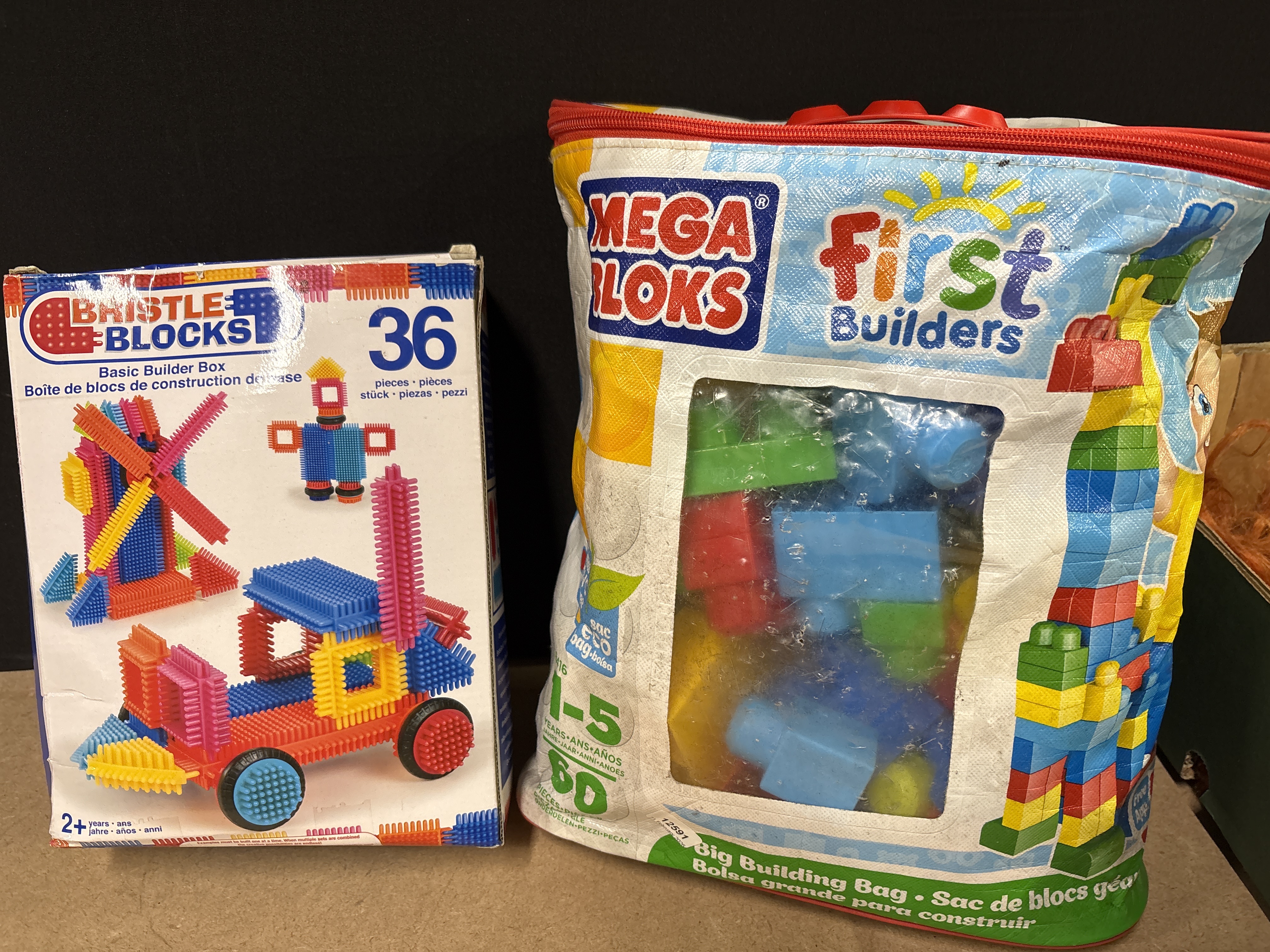 A boxed set of thirty-six Bristle Blocks Basic Builder pieces and a Mega Bloks First Builders bag containing eighty multi-coloured building blocks.