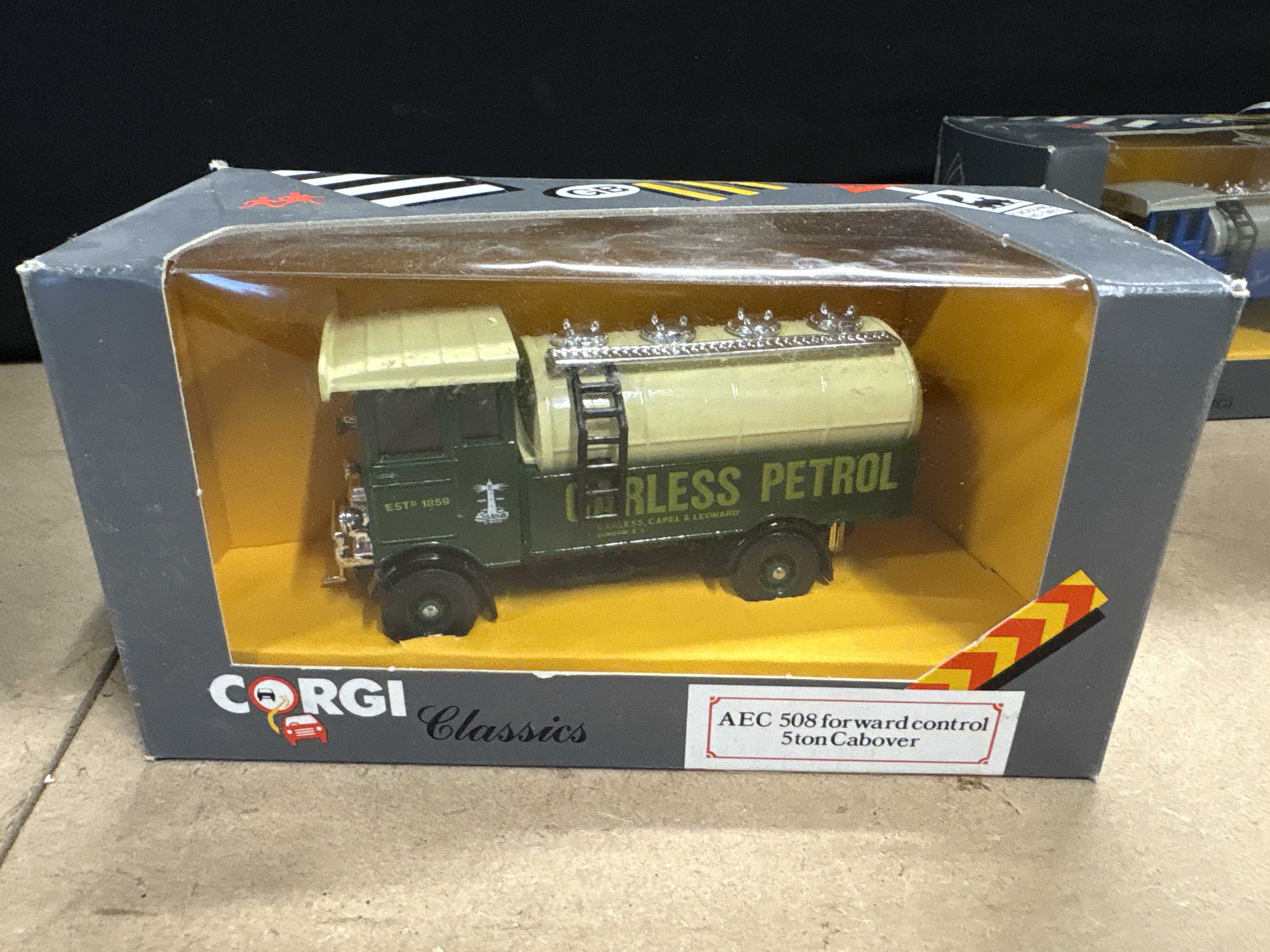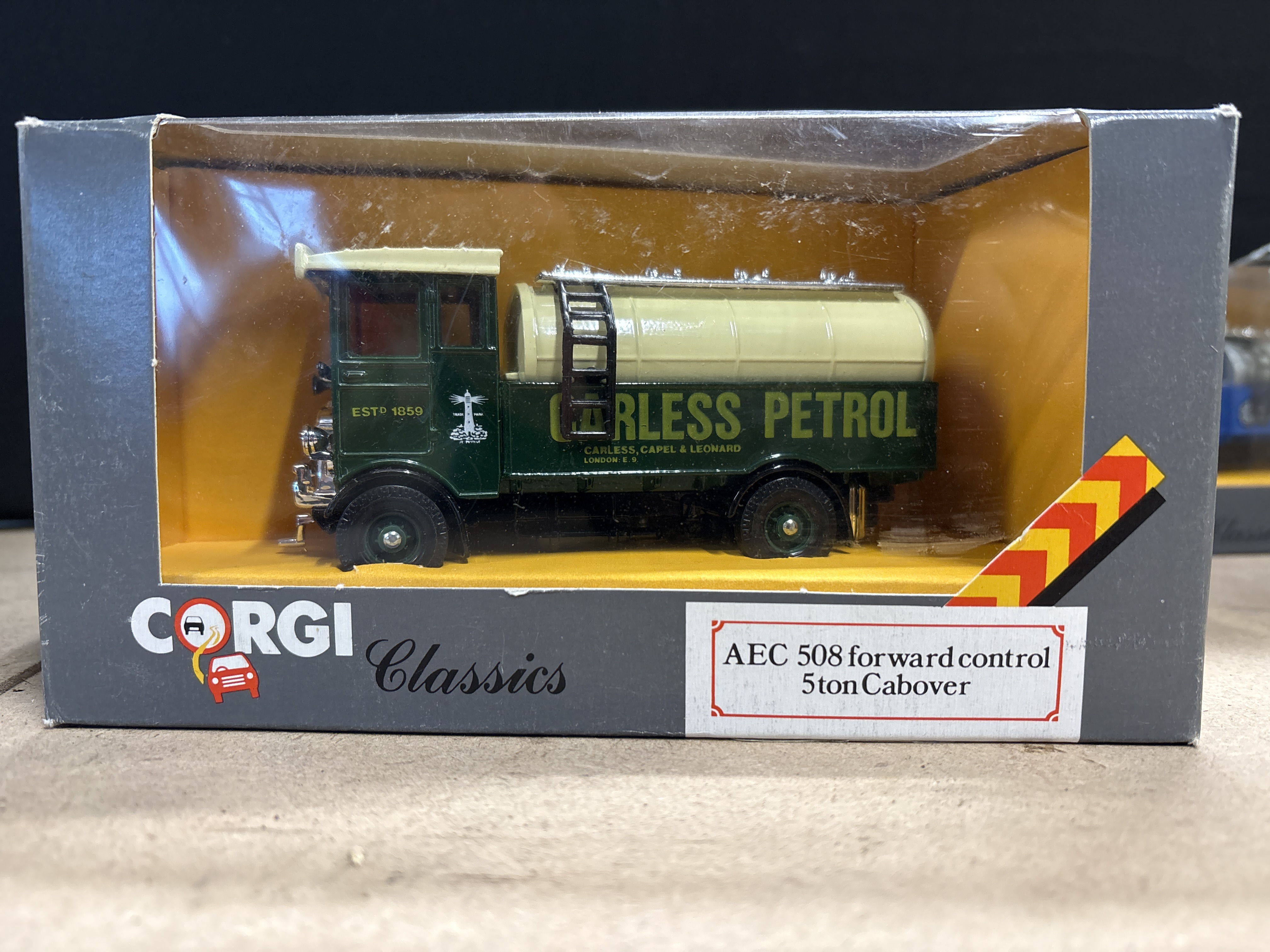 A metal Corgi Classics AEC 508 forward control 5 ton cabover petrol tanker in green and cream livery for Carless Petrol.