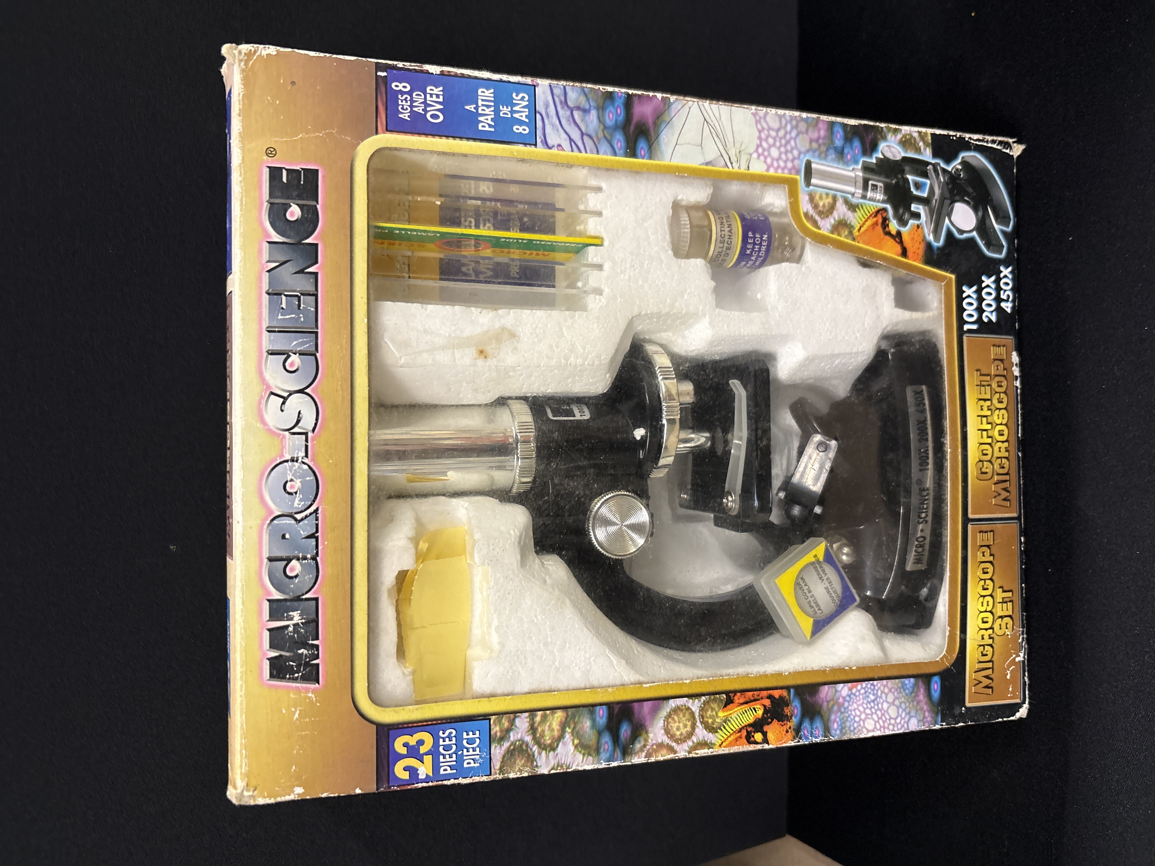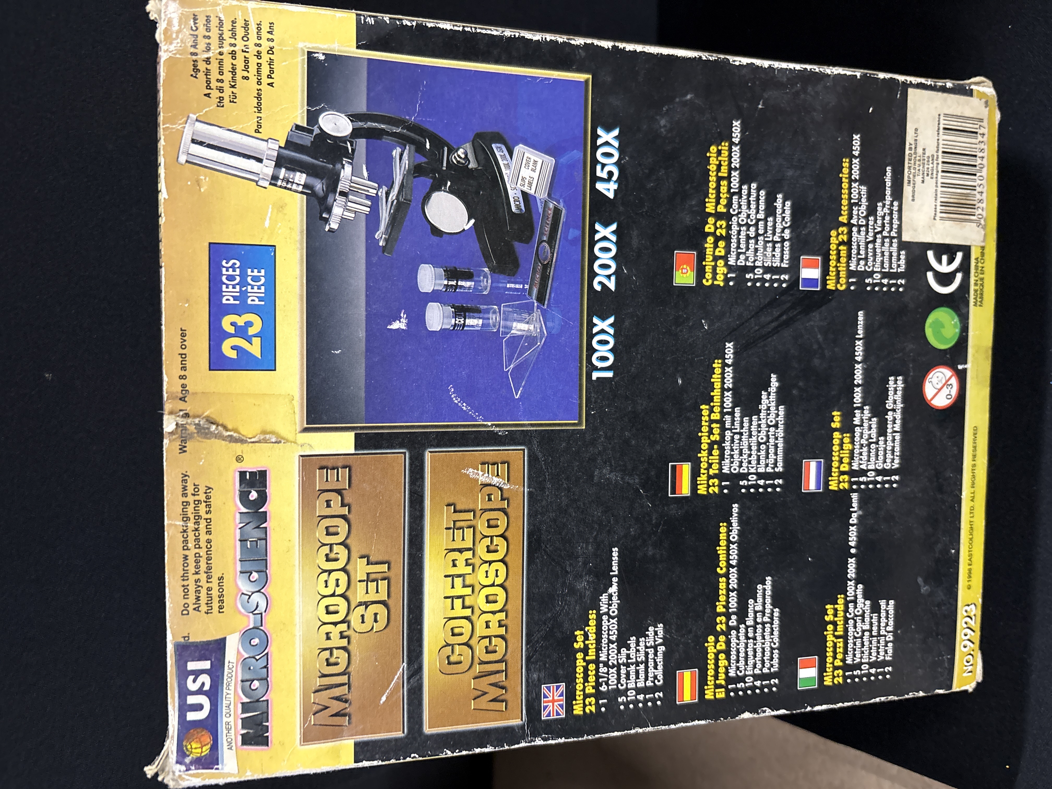 A vintage Micro-Science educational microscop set, model number 9923, manufactured by Eastcolight Ltd. and distributed under the USI brand. This set features a monocular compound microscope with a black-finished body and chrome-toned adjustment hardware. The rotating objective turret provides three levels of magnification: 100X, 200X, and 450X. The instrument is presented in its original multi-lingual retail box featuring a moulded polystyrene inner tray. The 23-piece set includes the 6-1/8 inch microscope, specimen collecting vials, cover slips, blank labels, and slides.