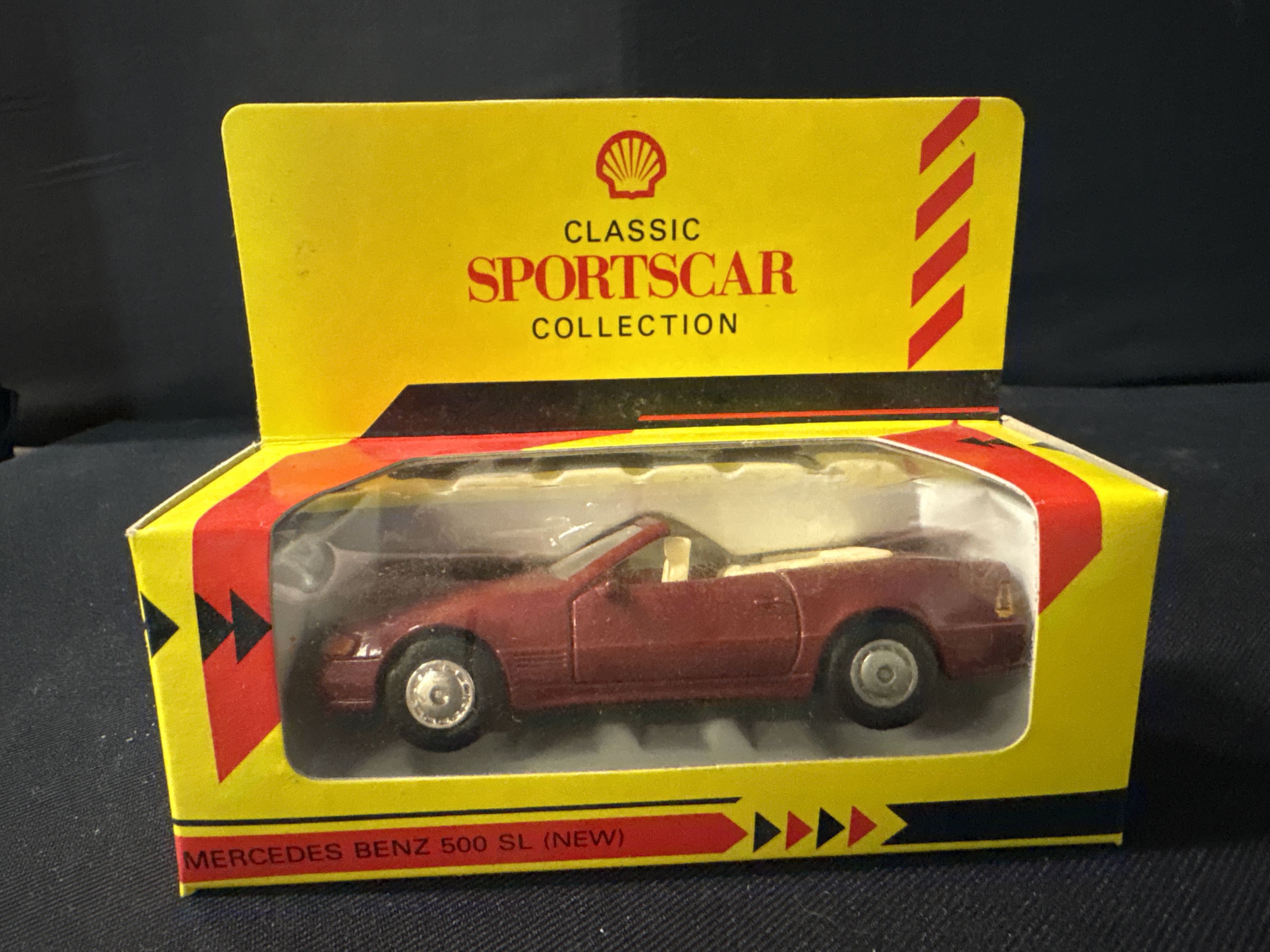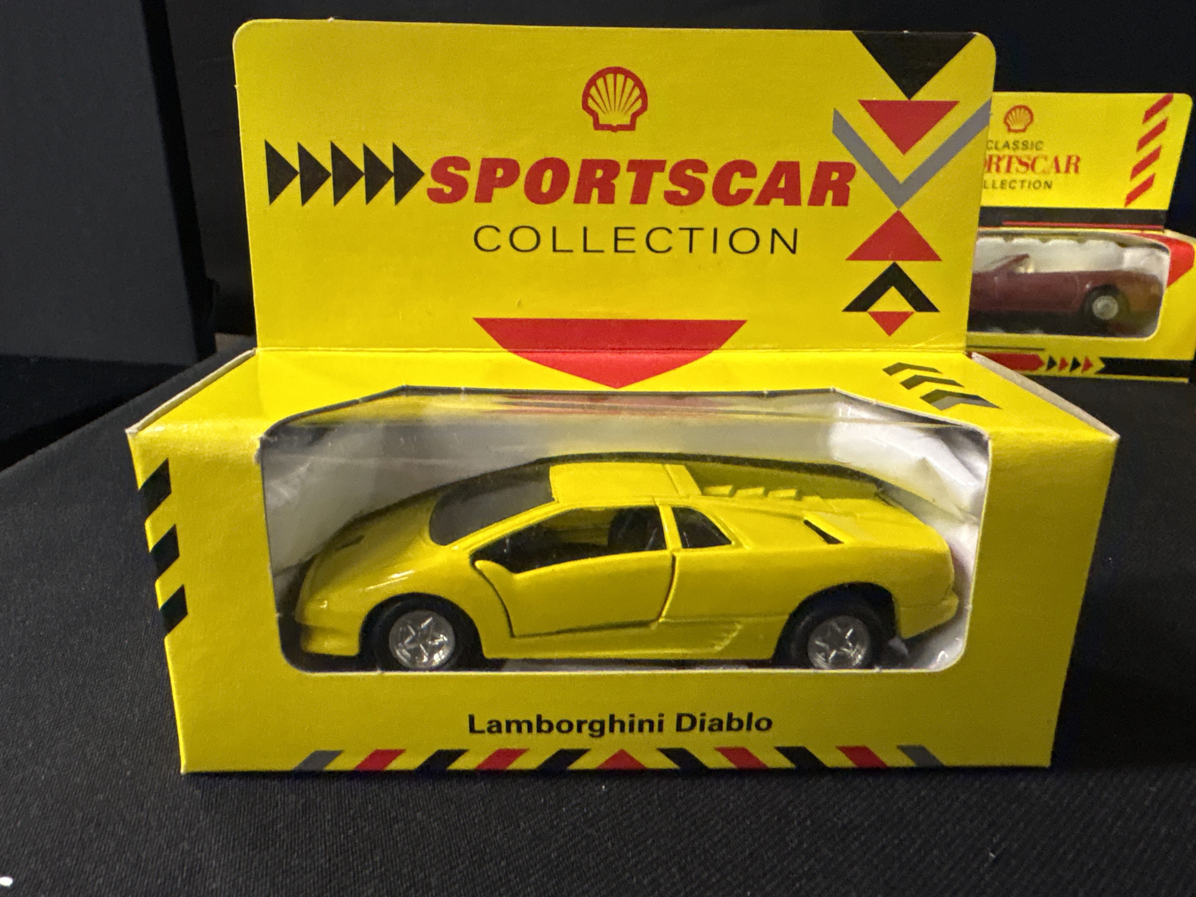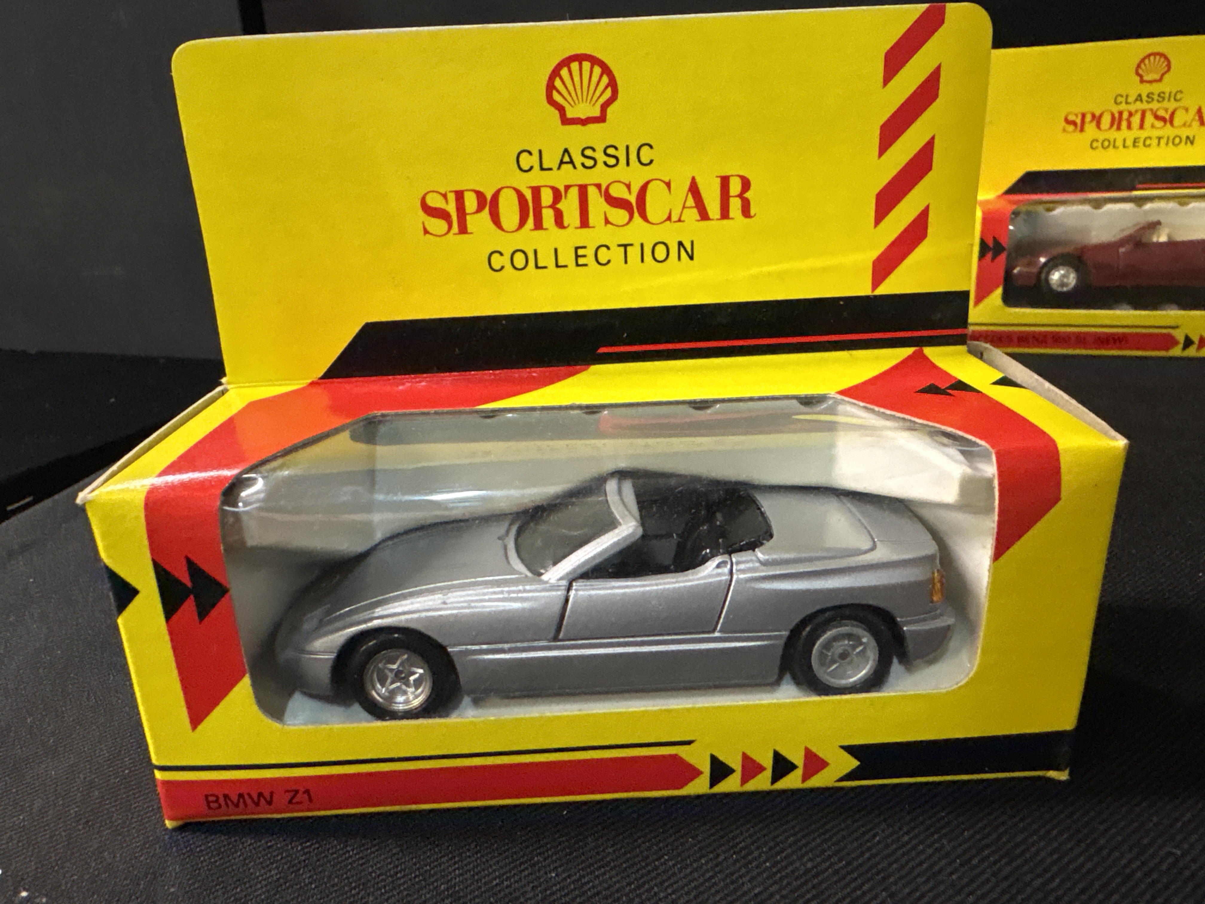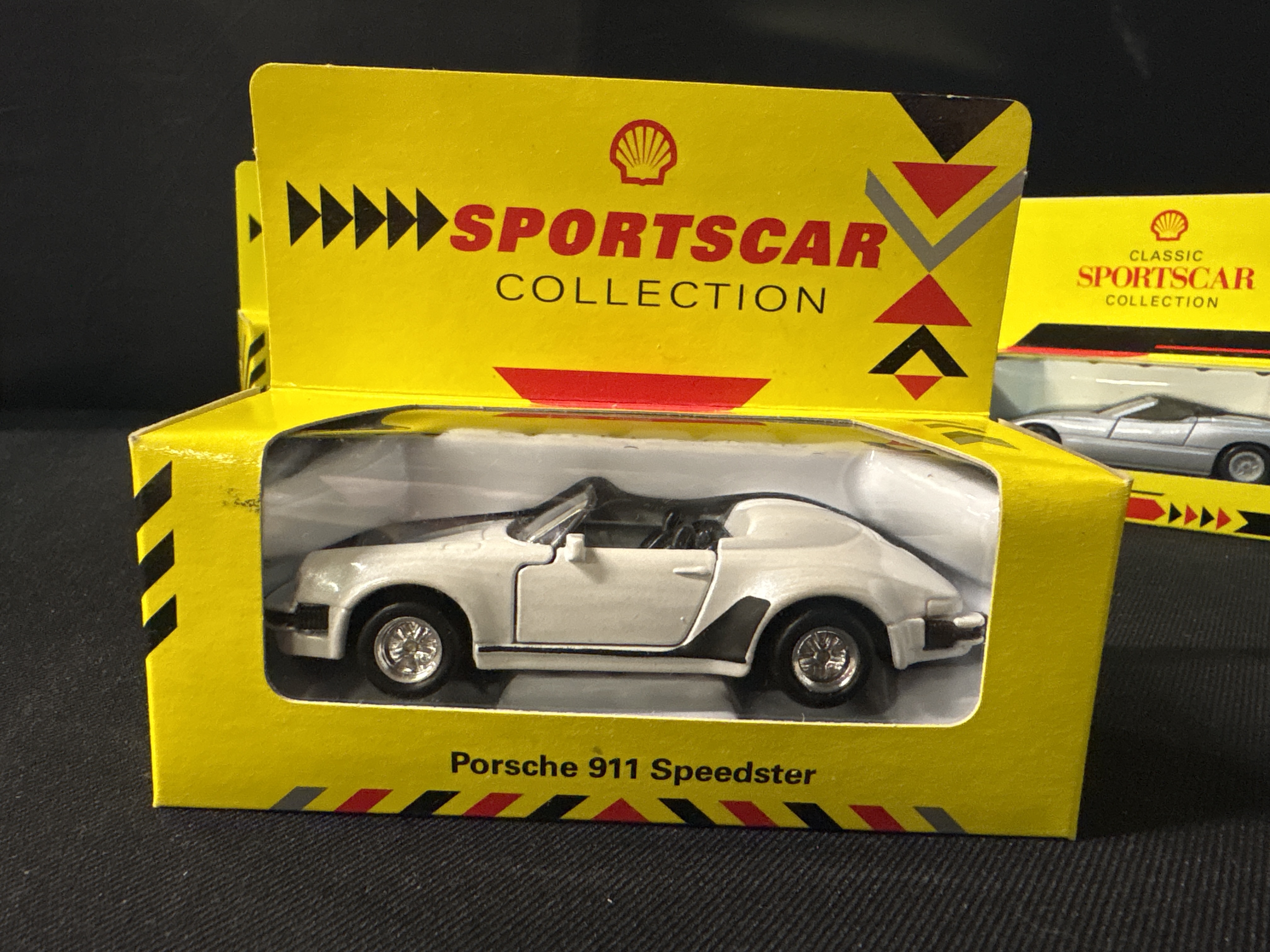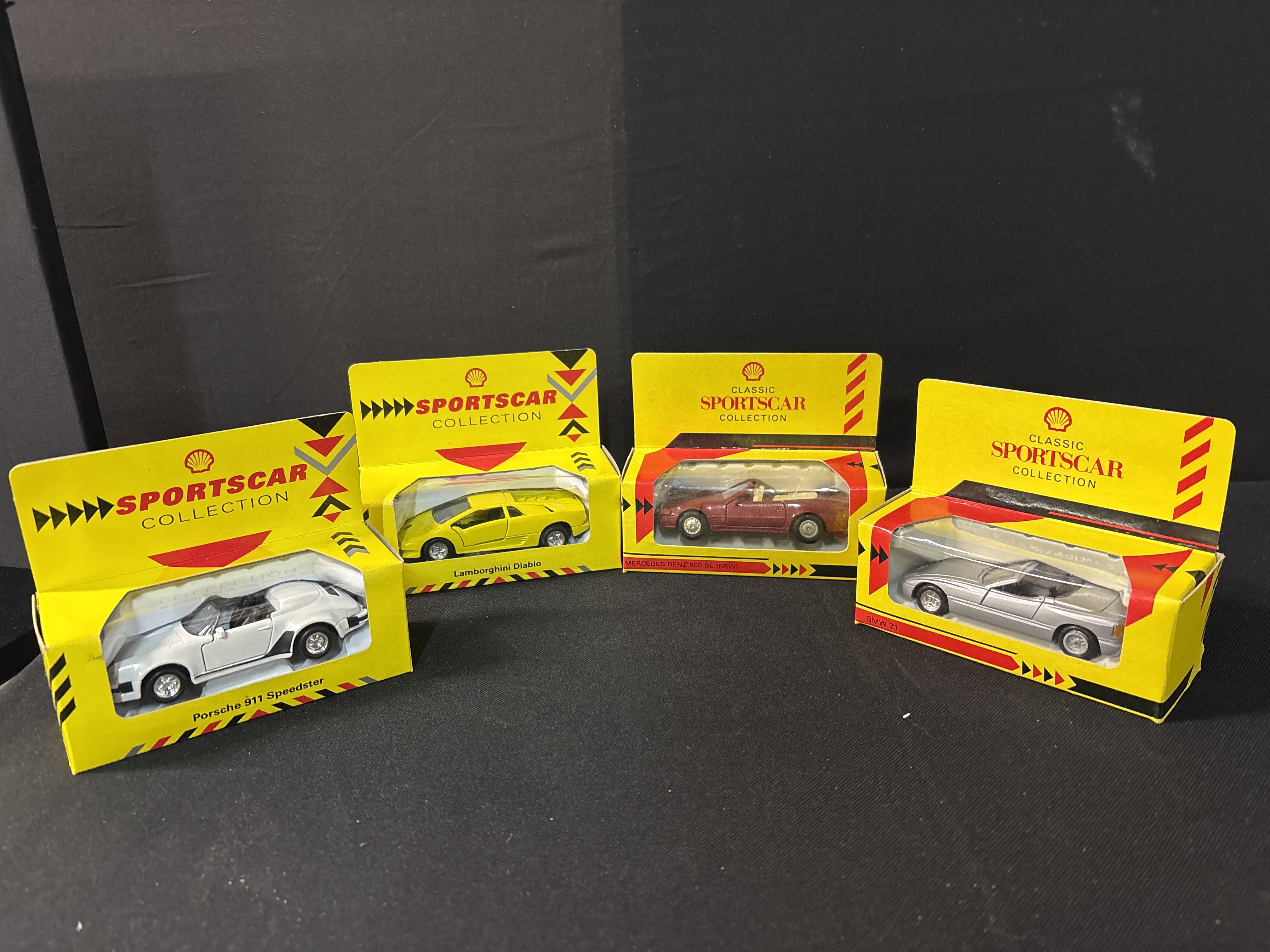 A group of 4 promotional die-cast models manufactured by Maisto for the Shell Sportscar Collection and Classic Sportscar Collection. Each vehicle is constructed from Netal with plastic wheels, interiors, and baseplates. The lot consists of a Porsche 911 Speedster finished in white with black side graphics, a Lamborghini Diablo in bright yellow, a BMW Z1 in silver, and a Mercedes-Benz 500 SL finished in maroon with a tan interior. All vehicles feature standard free-rolling wheel mechanisms and are housed in their original yellow window display boxes featuring the red Shell pecten logo. These models were originally released as part of a popular petrol station promotional series during the early 1990s.