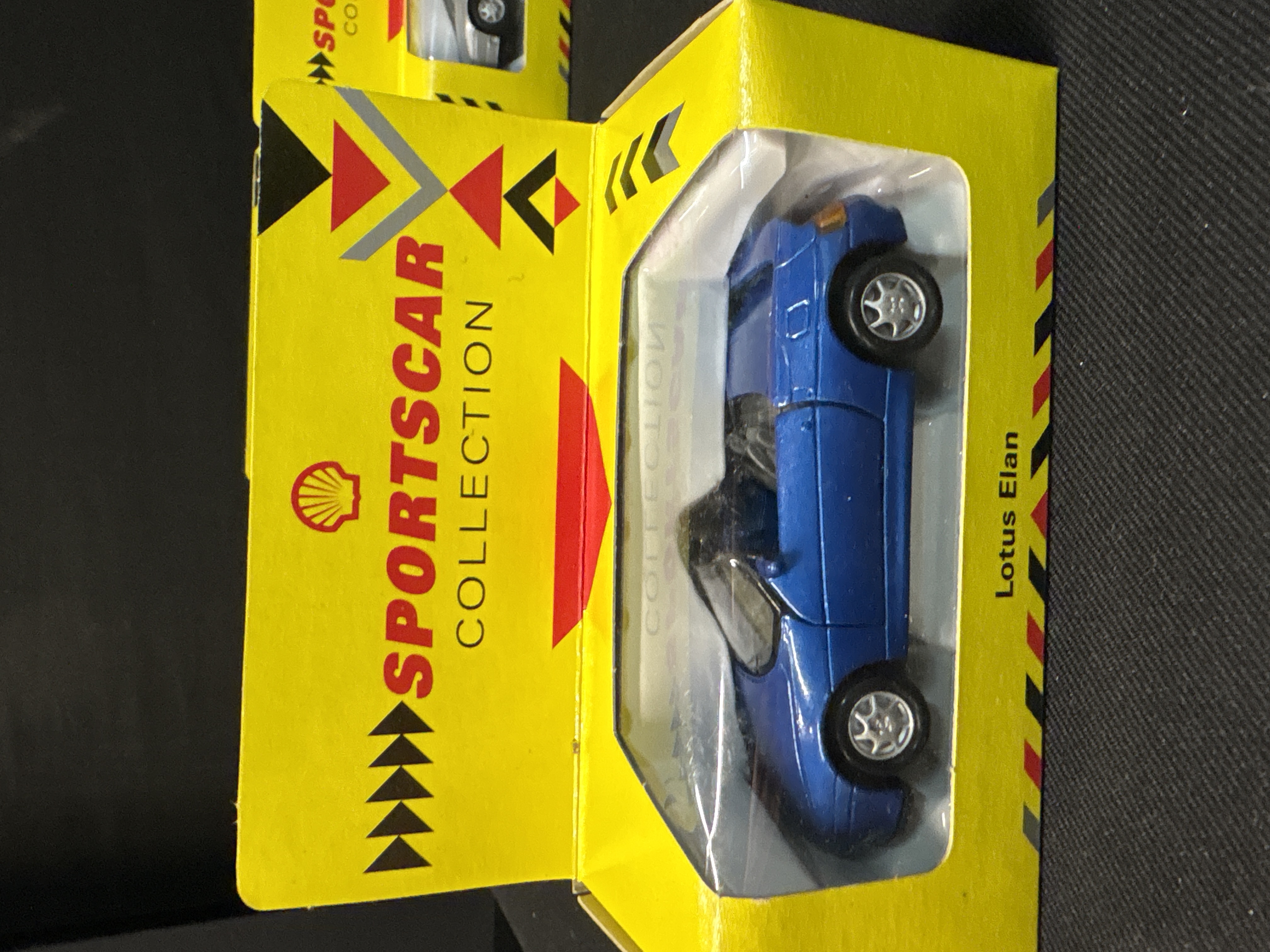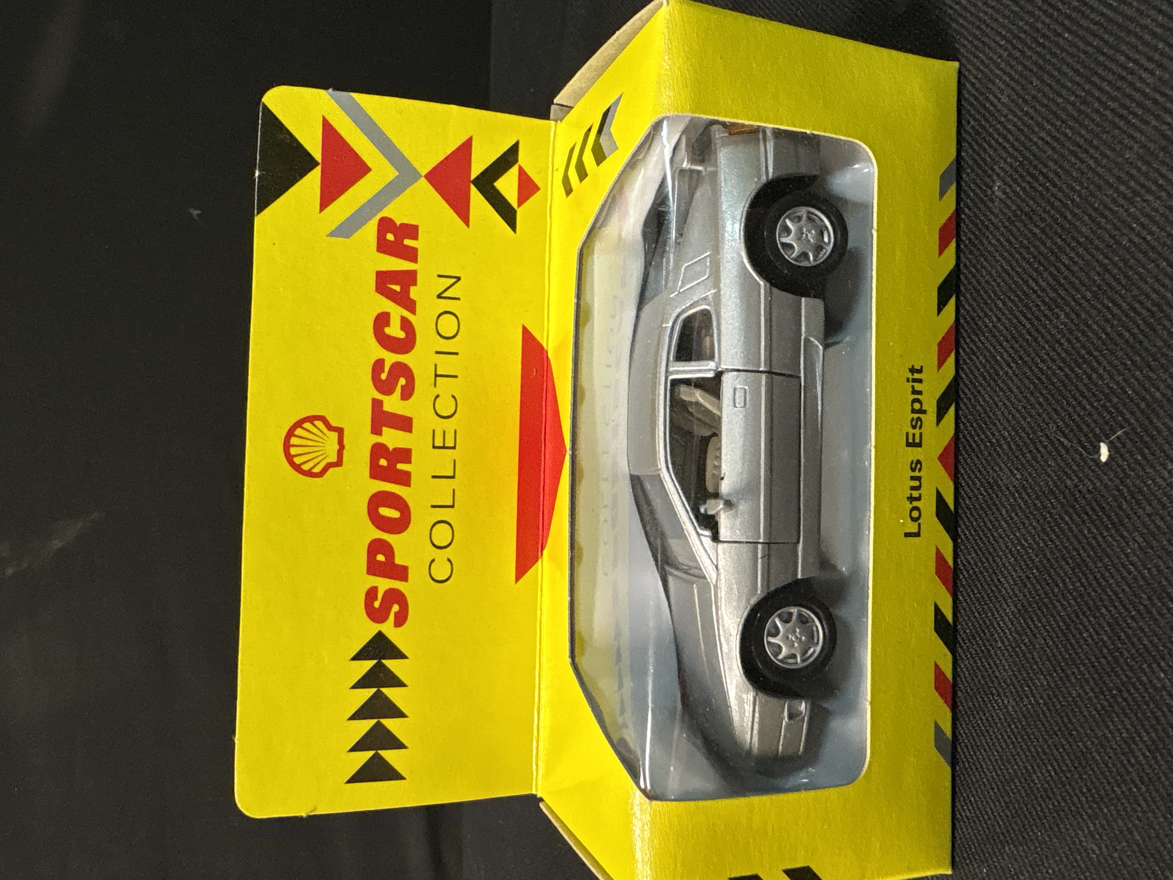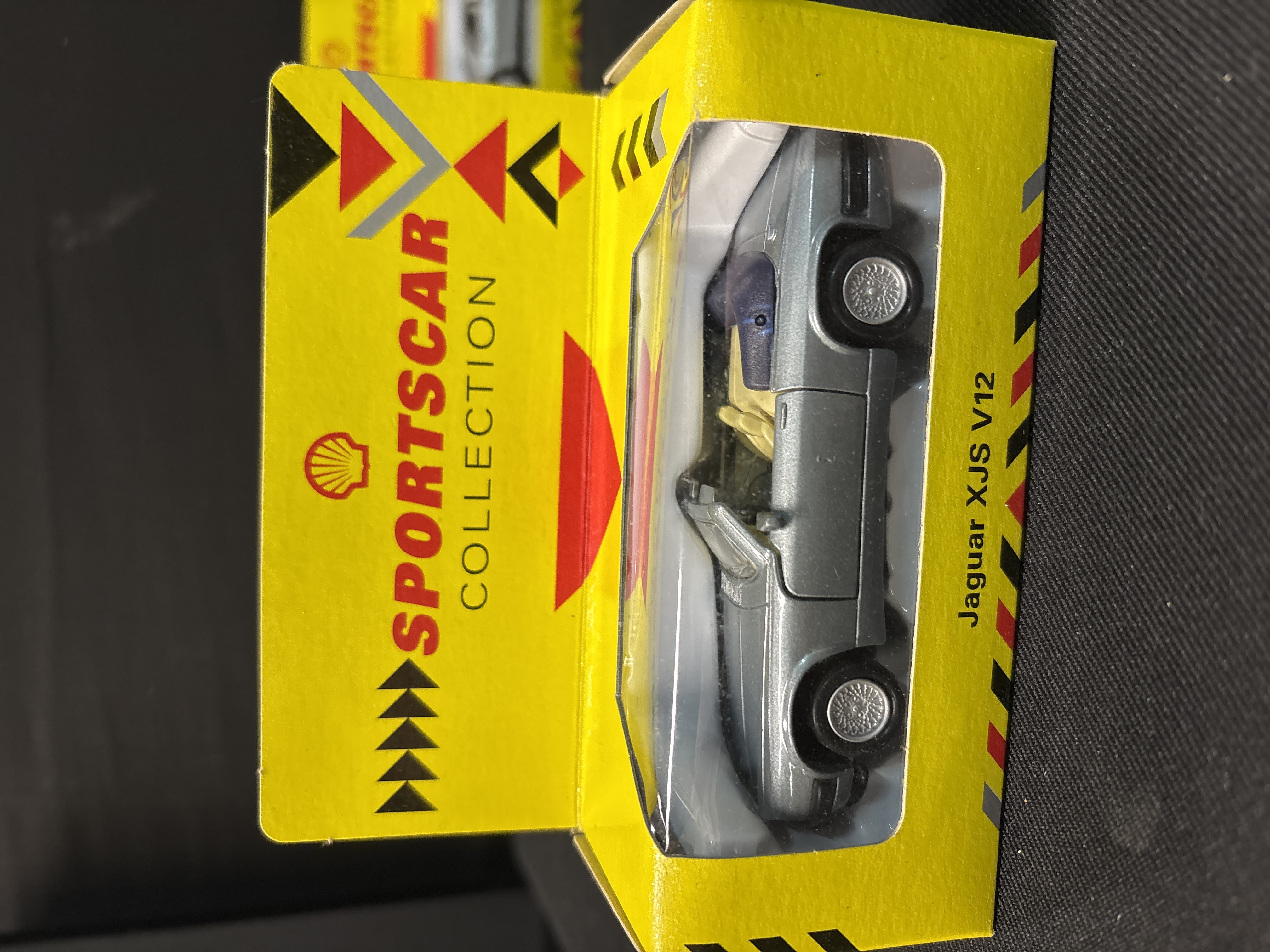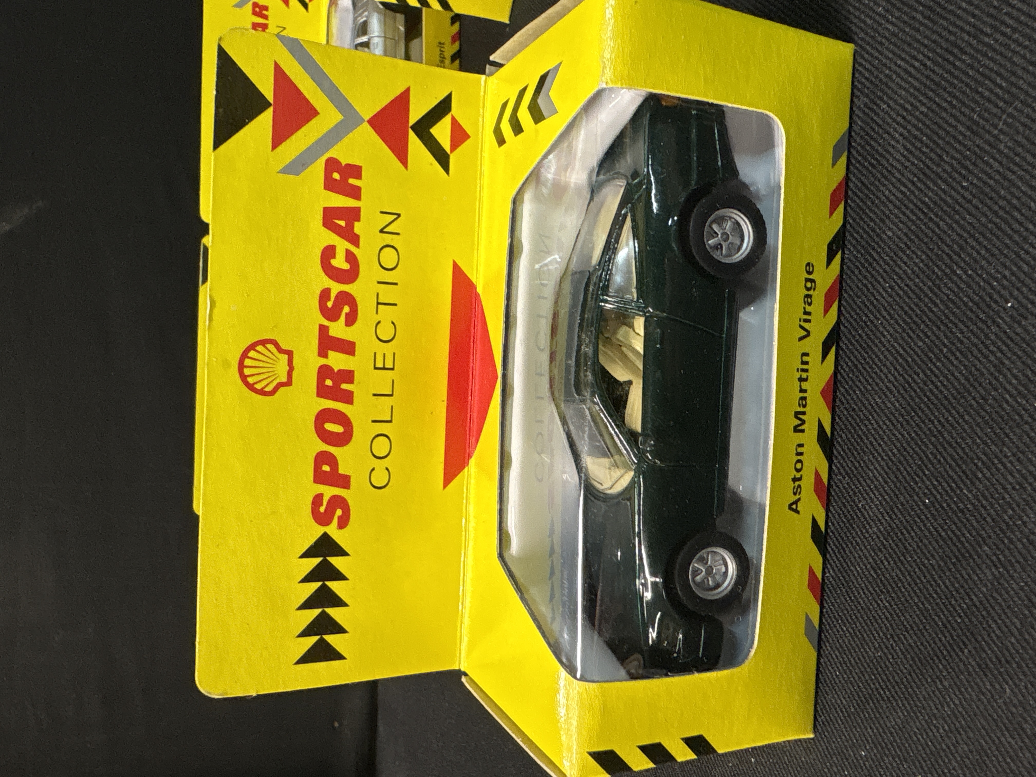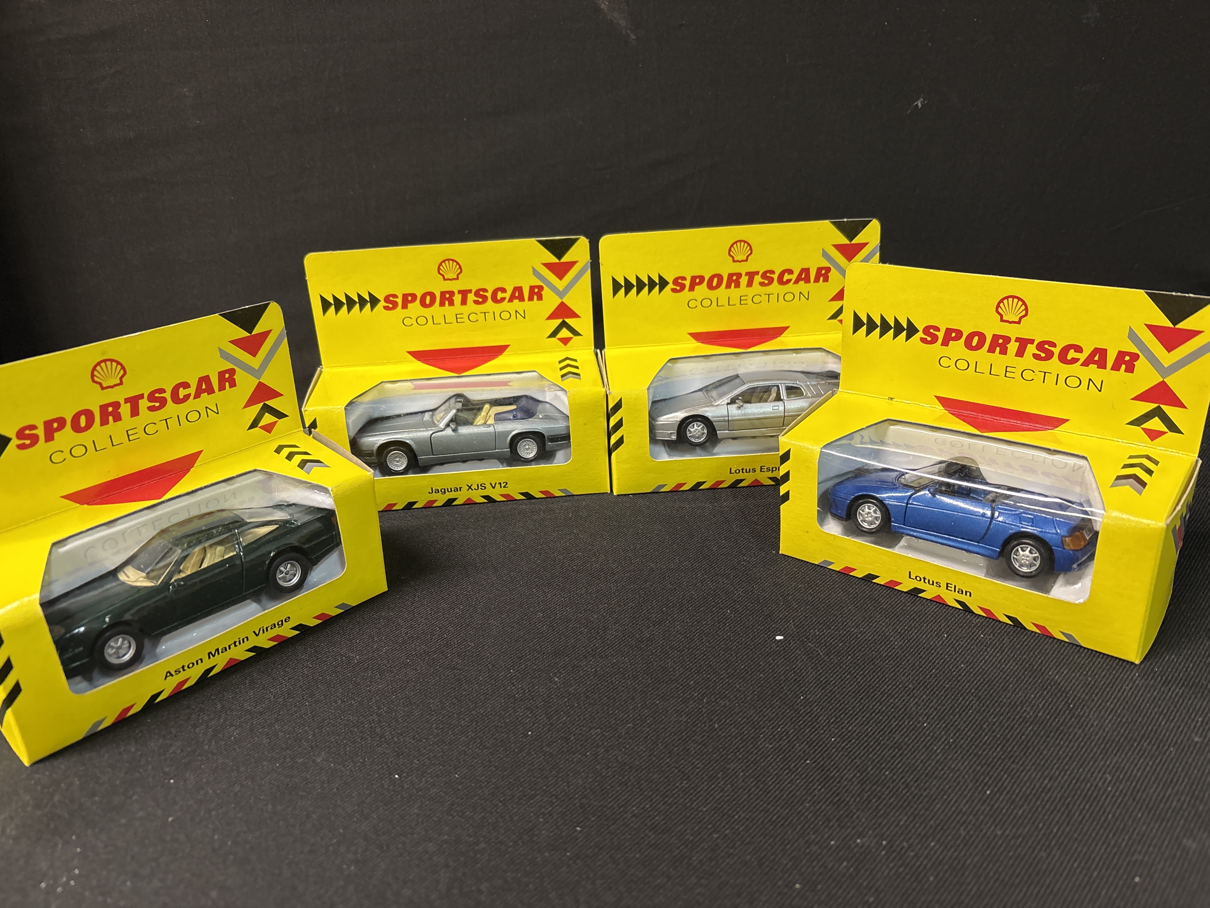 This lot features four promotional die-cast model cars from the Shell Sportscar Collection, manufactured by Maisto. Each model is constructed from metal with plastic interior components and glazing. The set includes an Aston Martin Virage in dark green, a silver Jaguar XJS V12 convertible with a blue top boot, a silver Lotus Esprit, and a blue Lotus Elan convertible. These items were originally distributed through Shell petrol stations as part of a popular 1991 marketing campaign. The packaging consists of the original bright yellow window boxes featuring the red and yellow Shell pecten logo and the text SPORTSCAR COLLECTION. Each box identifies the specific vehicle on the lower front edge. Dimensions approximately 110mm x 45mm x 45mm per box.
