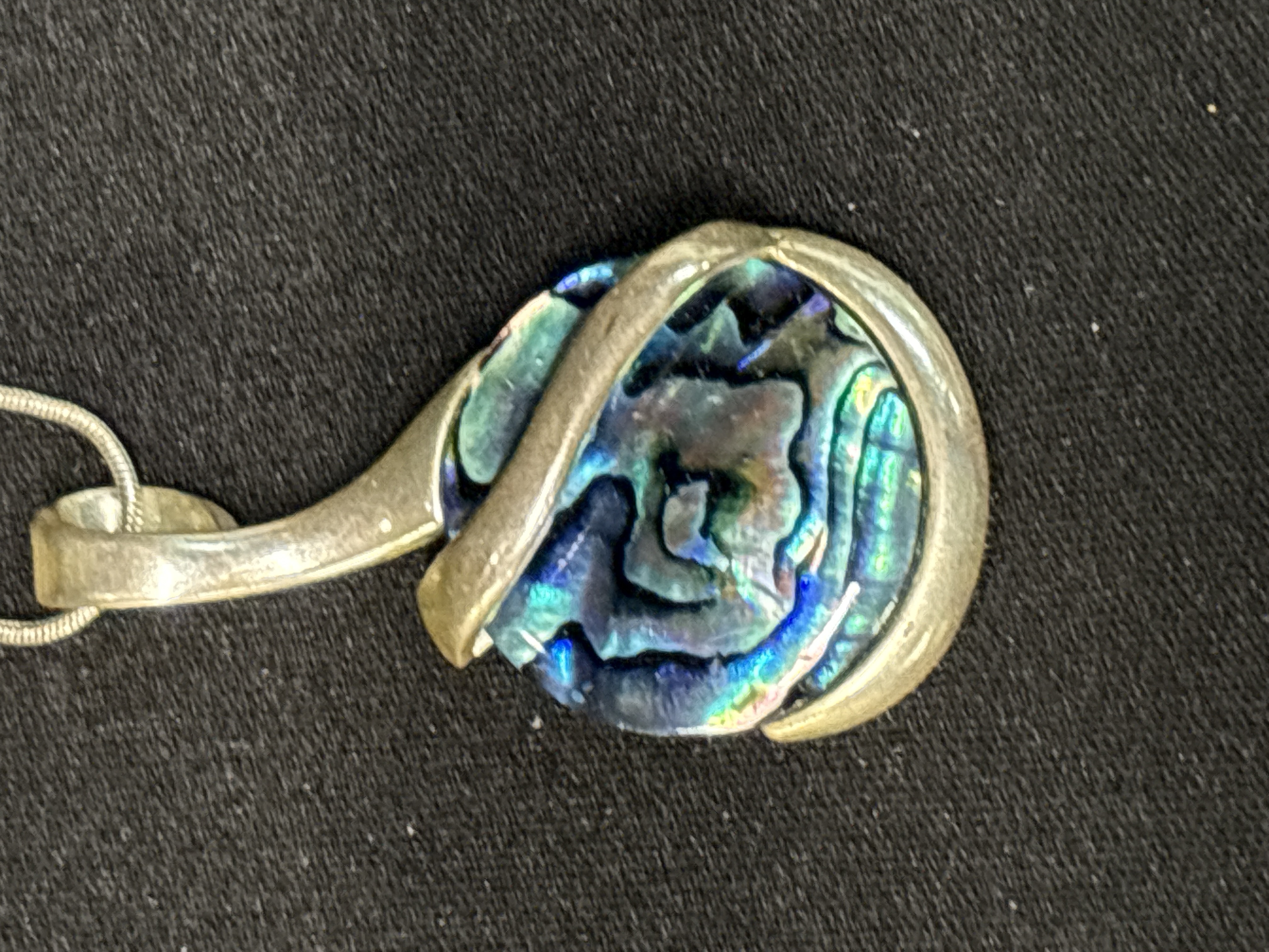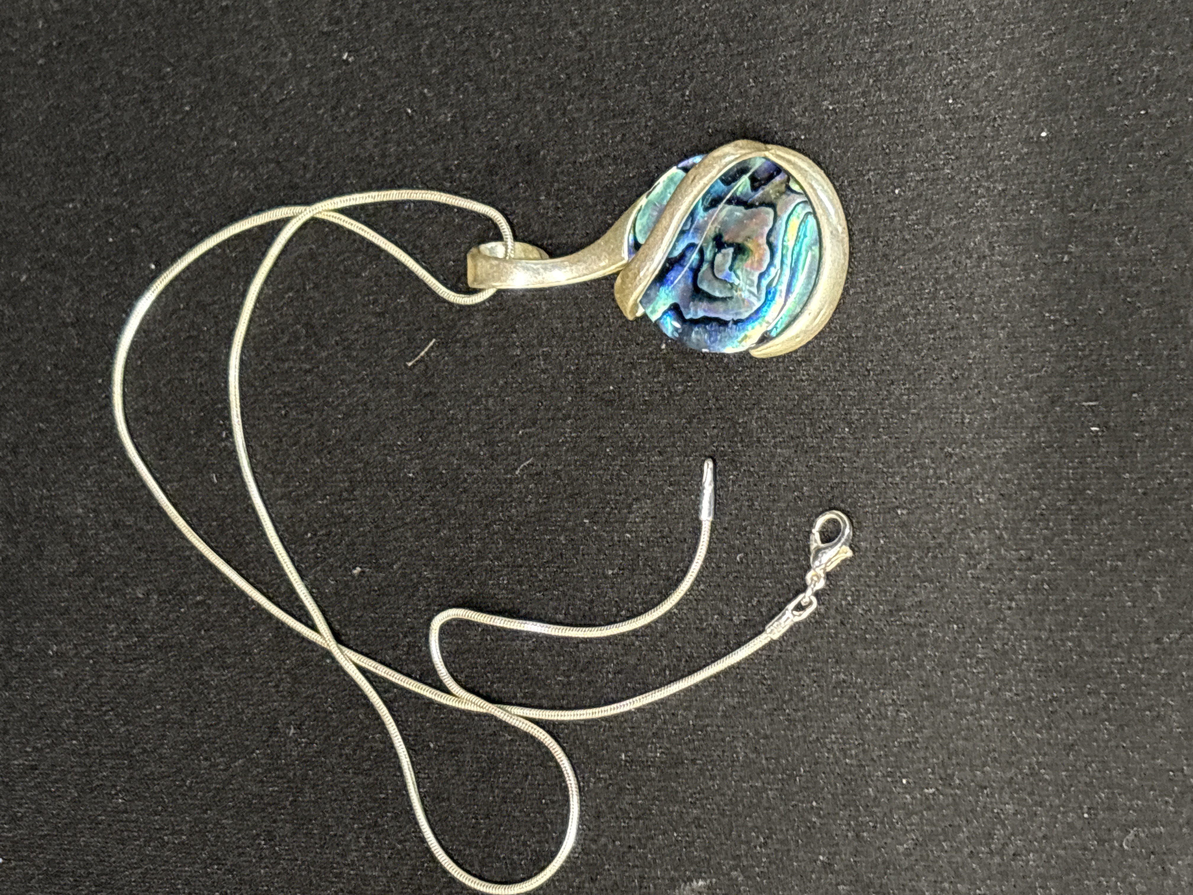This silver tone necklace features a circular pendant set with what appears to be an iridescent abalone shell cabochon, displaying a vibrant play of colour including blue, green, and purple tones. The shell is held within a contemporary open-back silver tone frame. The pendant is suspended from a silver tone snake chain which is secured by a lobster claw clasp. A 925 purity mark is stamped on the end tab of the chain.