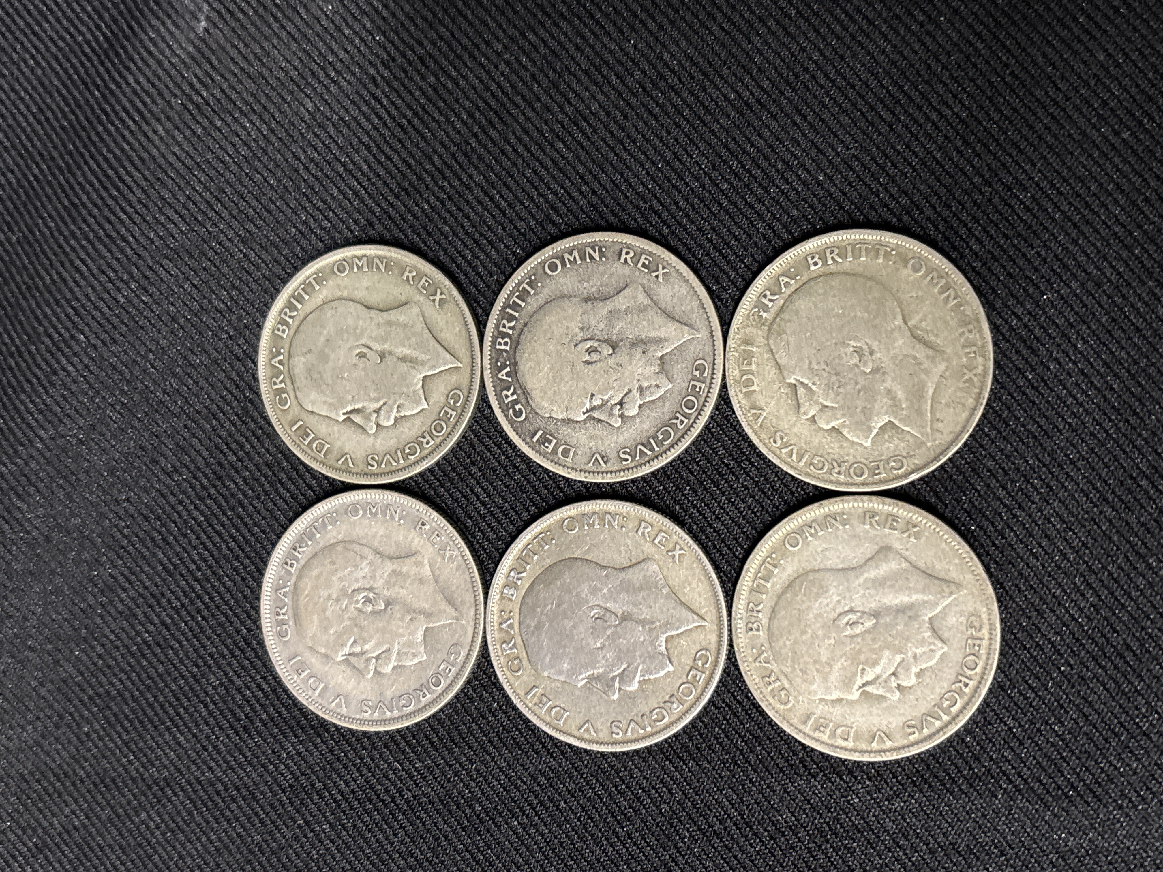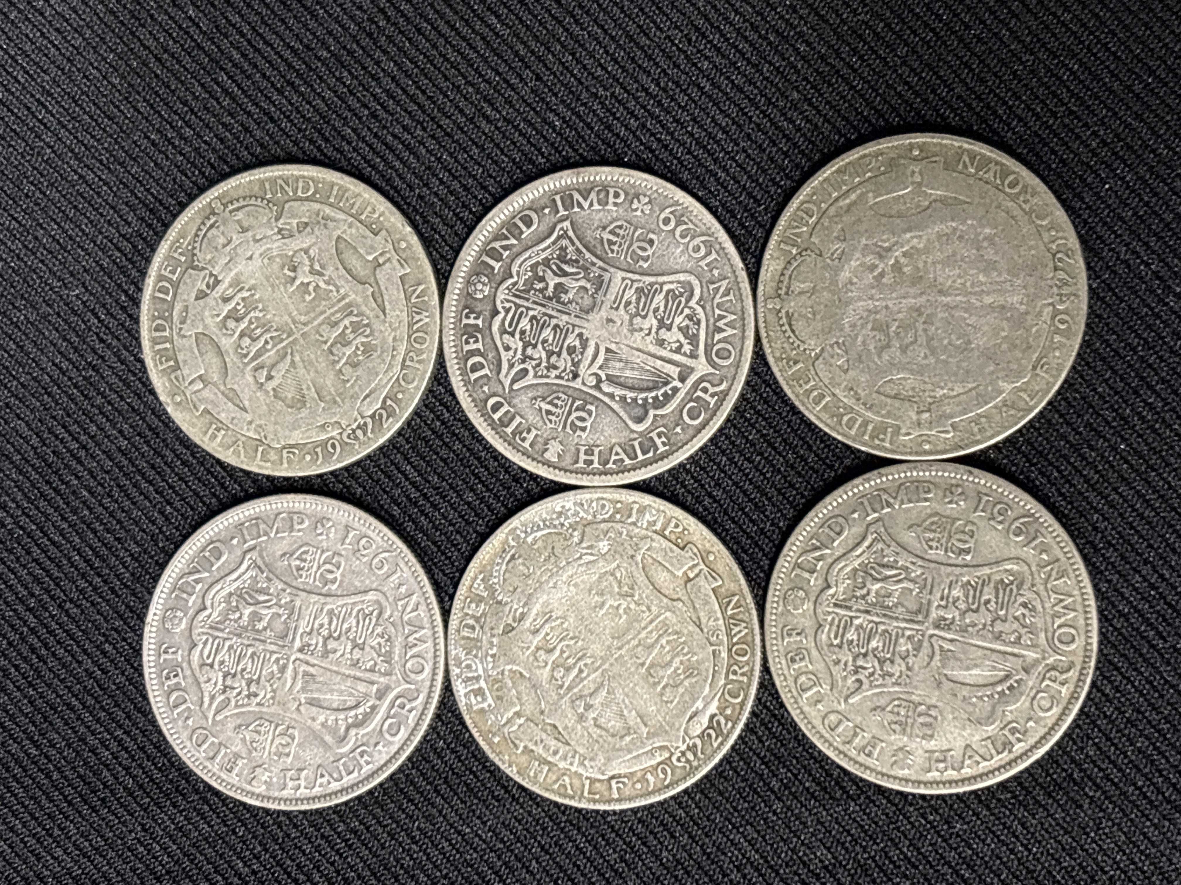 A collection of six United Kingdom half crowns from the reign of George V. Catalog numbers KM-818.2 and KM-835. Designer: Bertram Mackennal. Design type: Bare head / Crowned shield. Key identifiers: Dates include 1921, 1922, 1923, 1929, and two specimens dated 1931. The transition to 50% silver composition in 1920 followed the rise in bullion prices after the First World War.