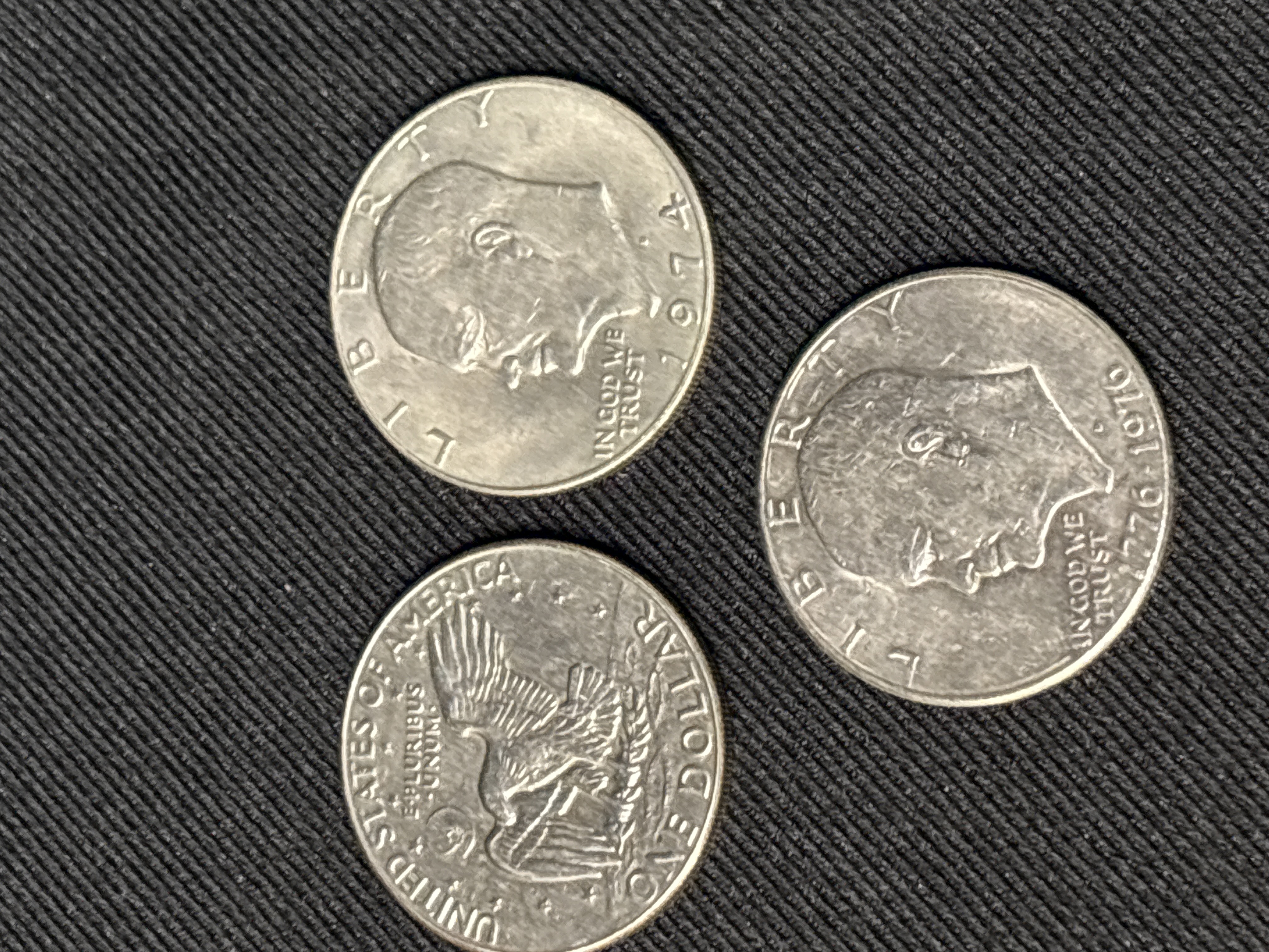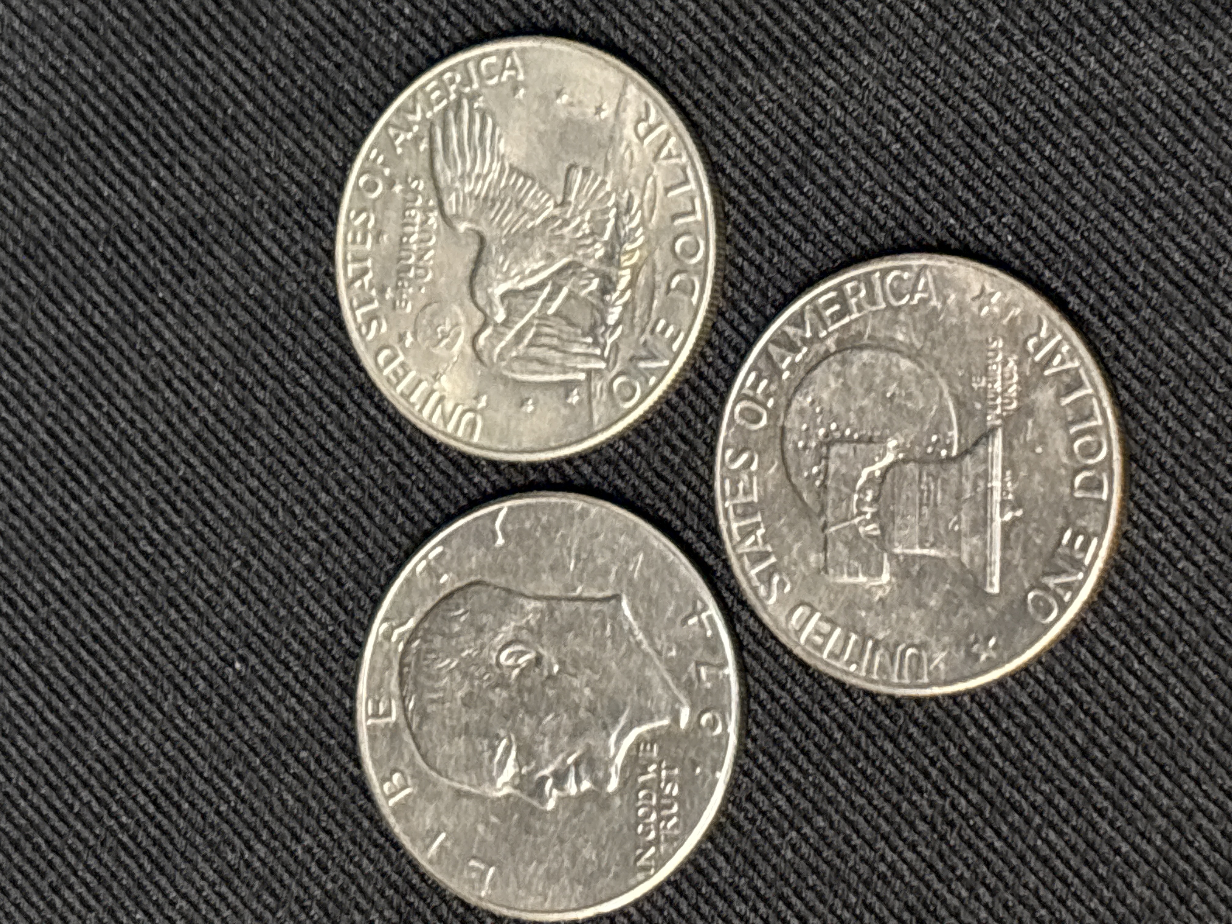 A trio of US American Dollar coins comprising two 1974 specimens and one 1776-1976 Bicentennial issue.