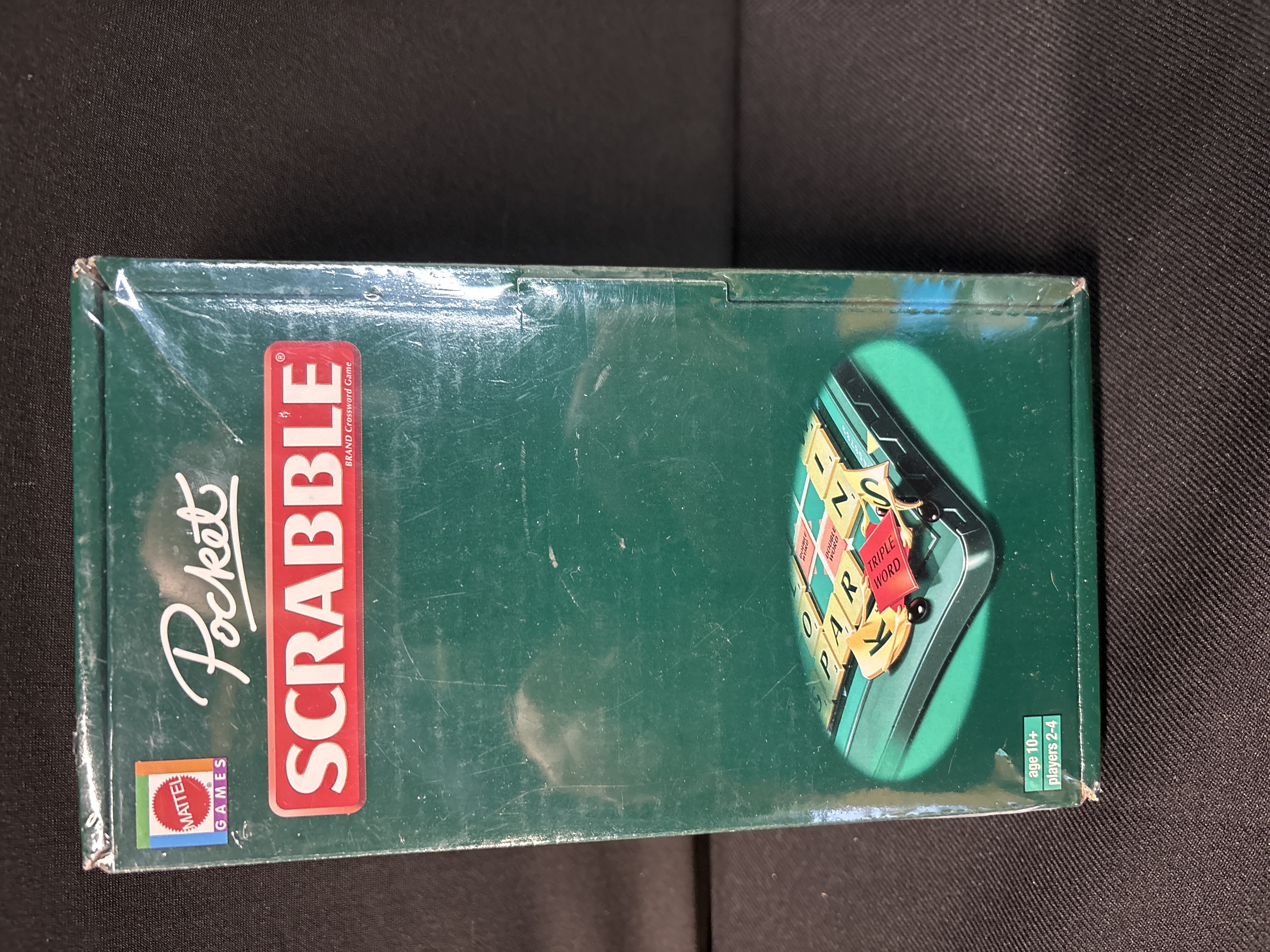 A 2006 production of the world-renowned crossword game, Scrabble, manufactured by Mattel Games under model number M3795. This specific iteration is the Pocket Scrabble travel edition, designed for portability with magnetic tiles and a compact playing surface. The set is contained within its original green cardboard box, which remains factory sealed in its protective plastic film. The reverse of the packaging features the 2006 copyright date and confirms the item was manufactured in China. It includes various international distribution addresses for Mattel U.K. Ltd., Mattel Australia, and Mattel Canada. Key identification marks present are the barcode 027084580358, the CE mark, and the Lion Mark toy safety symbol.