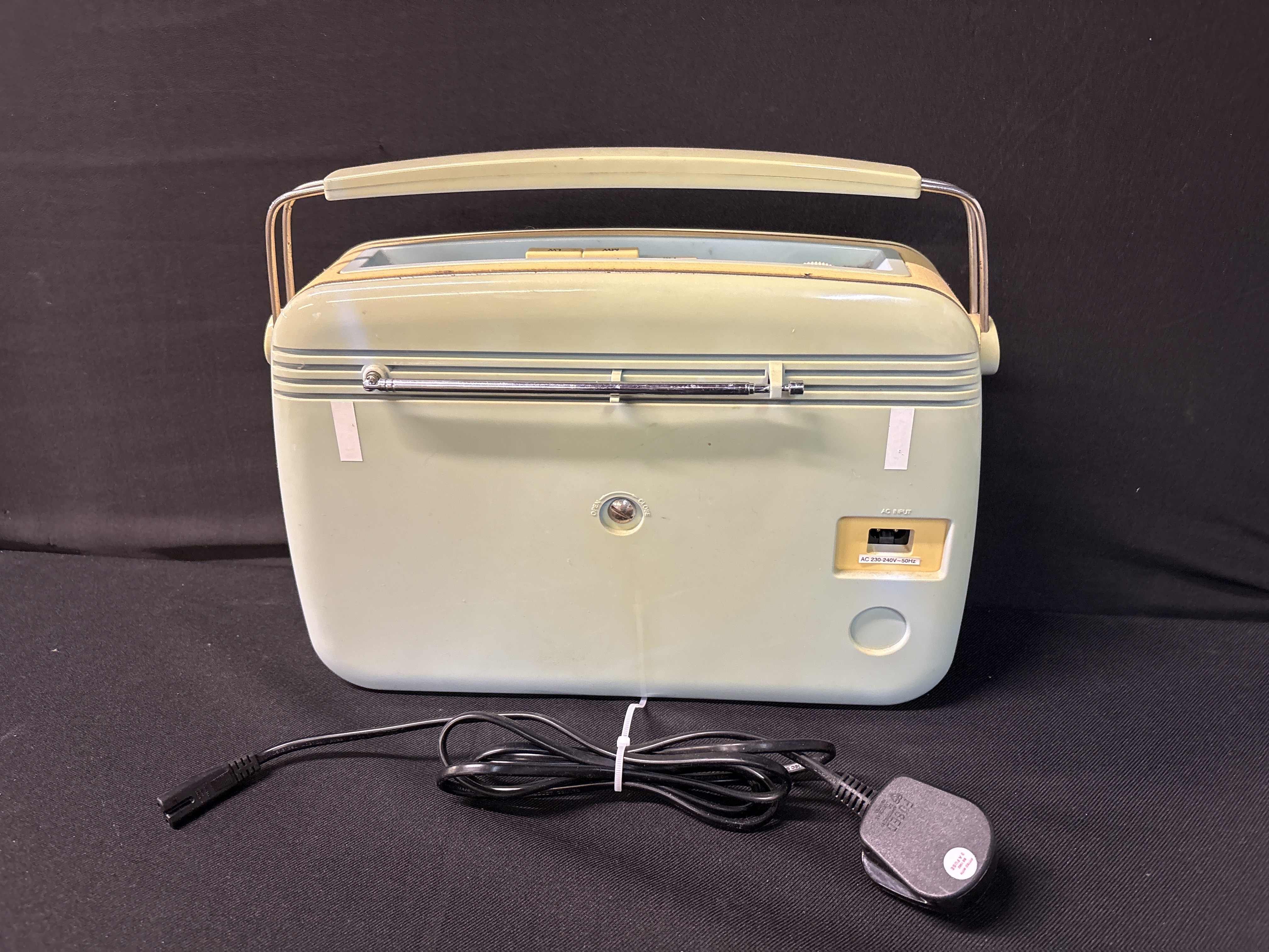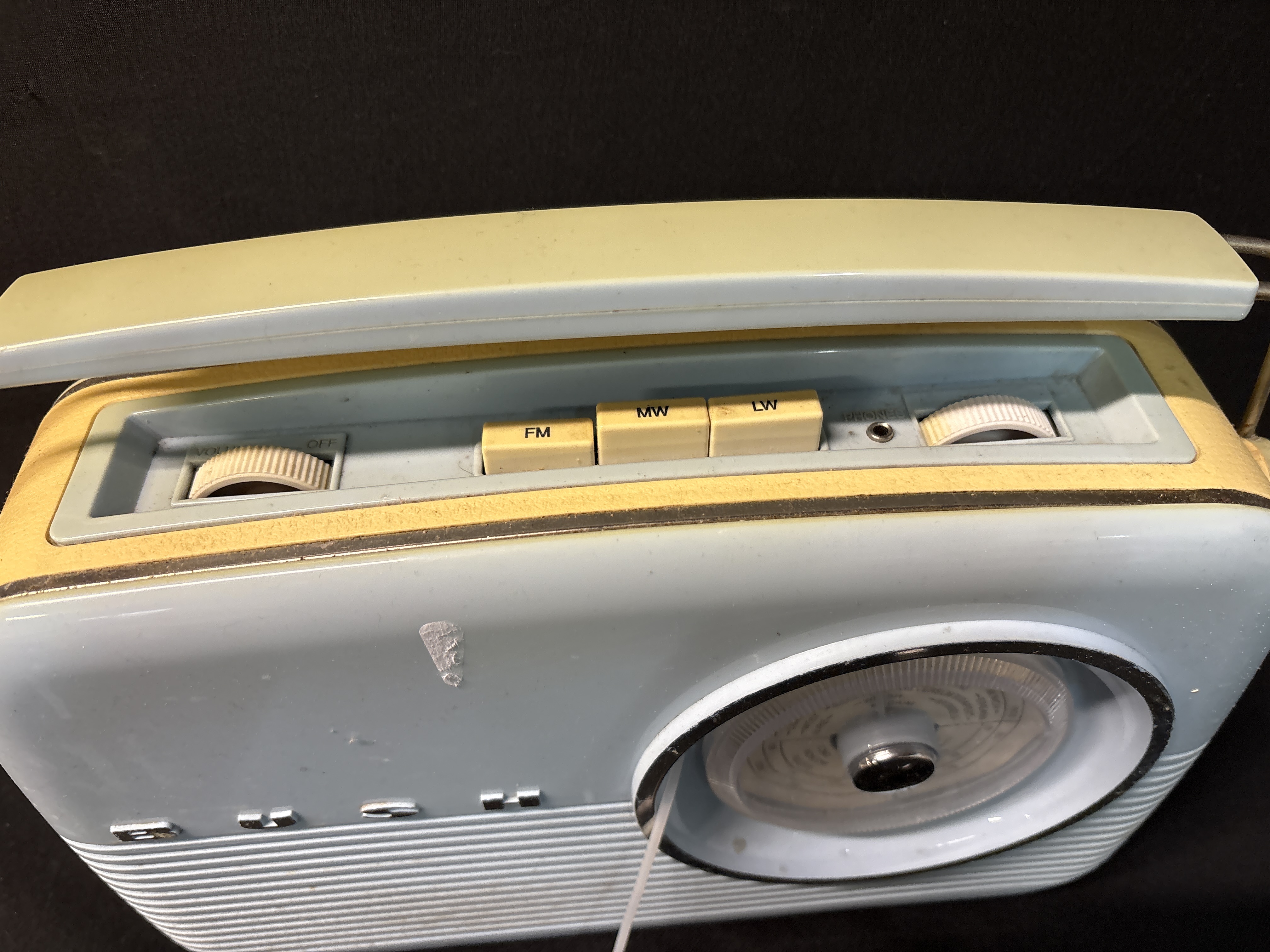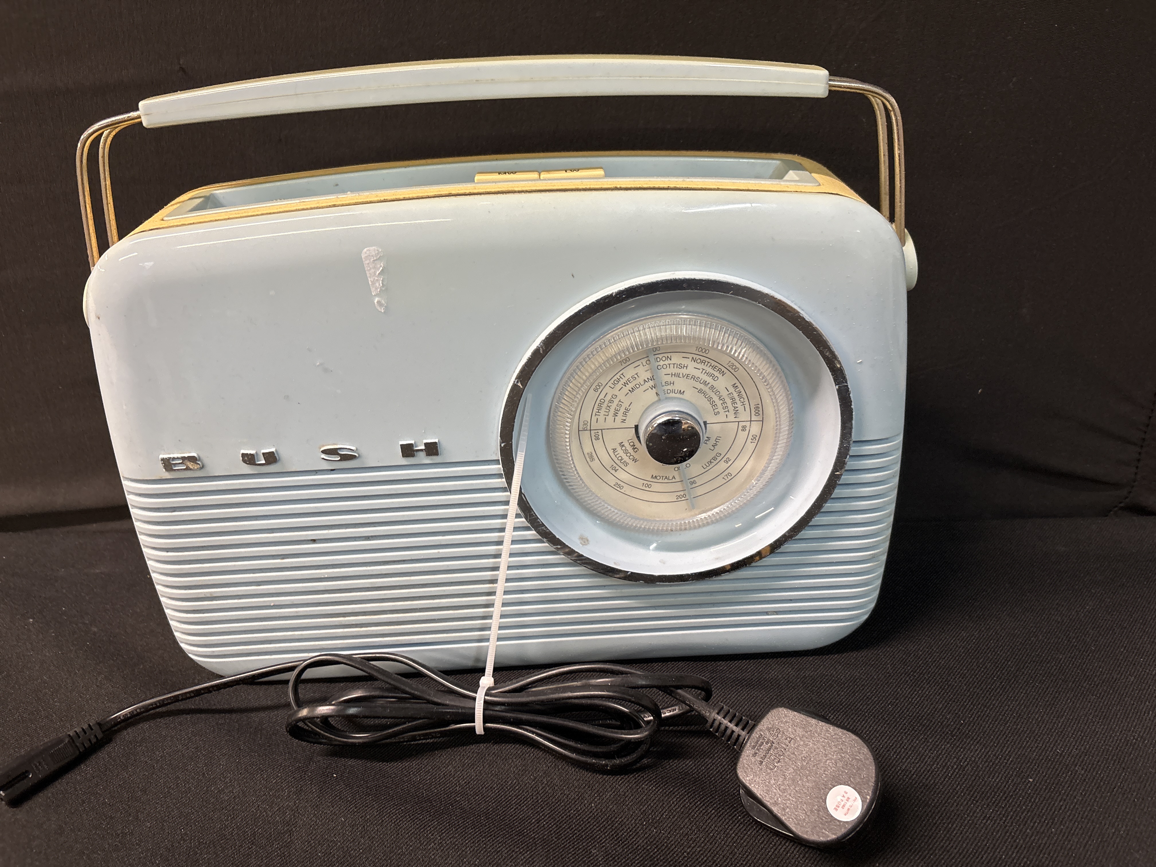 A vintage Bush radio, model TR82/97, being a modern retro-styled reproduction of the iconic 1950s TR82 design. This portable transistor radio features a classic two-tone moulded plastic cabinet in light blue and cream with chrome-effect hardware and lettering. The unit provides three-band reception across FM, MW (Medium Wave), and LW (Long Wave) frequencies. The front is fitted with a large circular analogue tuning dial featuring station names and frequencies. Controls include a top-mounted volume/on-off thumbwheel, push-button band selectors, and a headphone jack. The rear panel houses an integrated telescopic aerial and an AC mains input socket. This lot comprises one radio and includes a detachable power lead with a standard UK 3-pin plug.