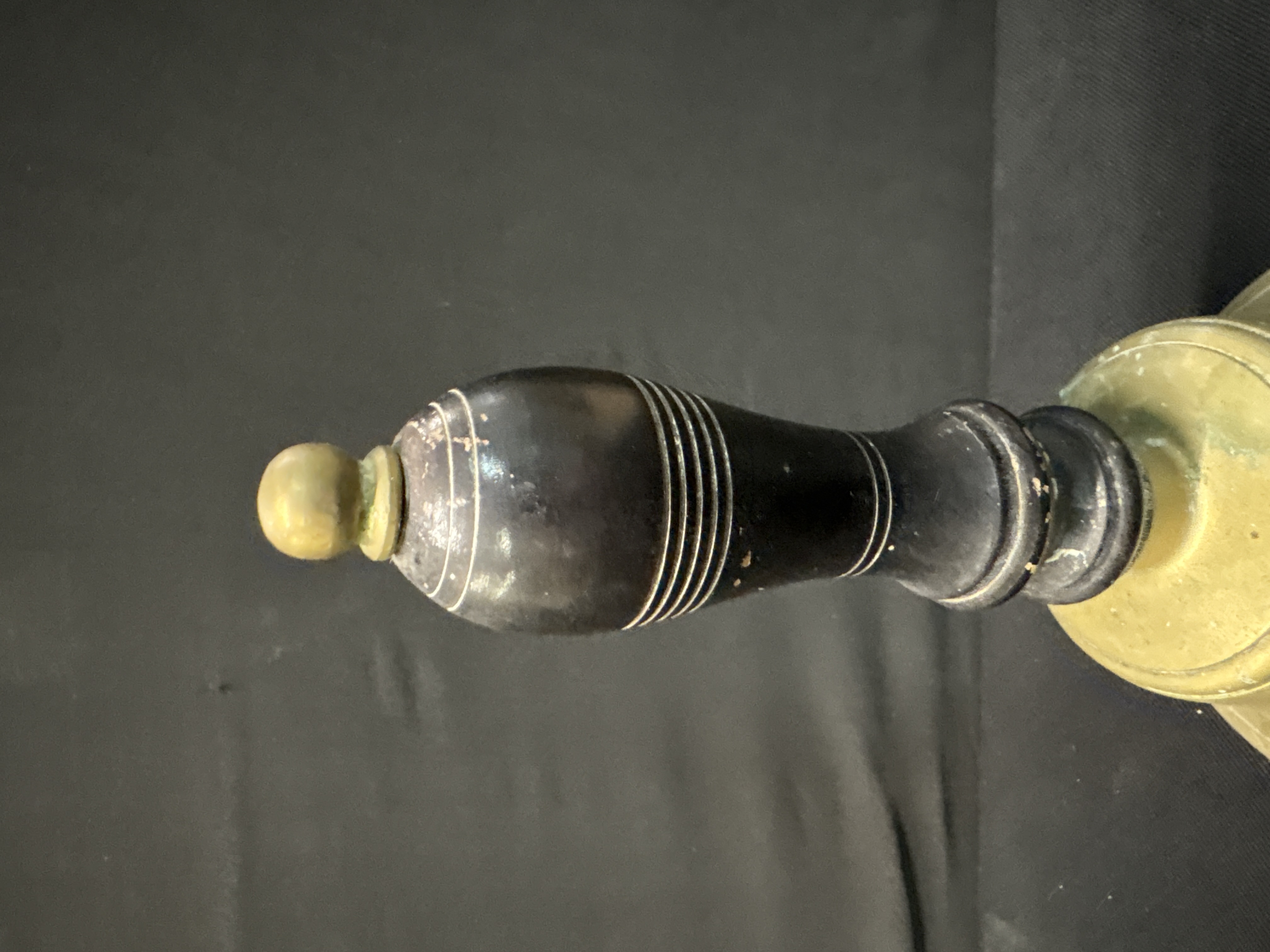 A vintage school bell no ringer, comprising a cast brass body and a dark-stained, turned wooden handle. The handle is embellished with concentric rings and is surmounted by a brass finial. This type of hand-held ringer was a common fixture in mid-20th century schoolhouses and domestic settings for summoning students or household members. The interior retains a metal ‘S’ hook for clapper suspension. No maker’s marks or serial numbers are evident. Height approx. 165mm, Diameter approx. 95mm.