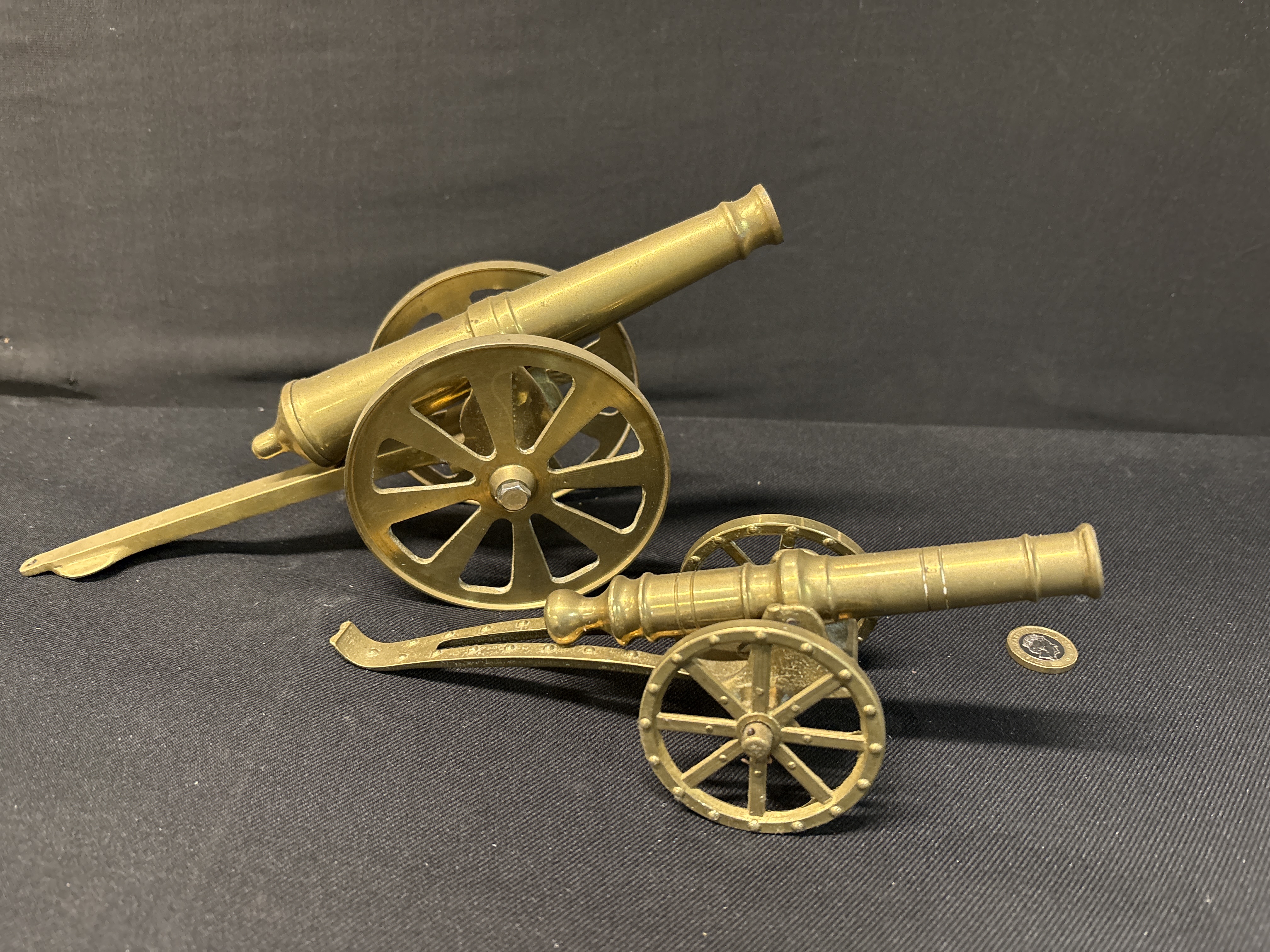 A pair of brass cannons of differing designs and scales, likely produced as decorative mantelpiece or desk ornaments during the mid-to-late 20th century. The larger cannon features a tapered barrel with simple cast reinforcing rings, mounted on a carriage with large ten-spoke wheels and a solid trail. The smaller cannon is more ornate in design, featuring a multi-banded barrel and smaller eight-spoke wheels detailed with decorative studs on the rims, set upon a split-style trail. Both items are constructed from solid cast brass and lack visible manufacturer hallmarks or serial numbers, which is characteristic of such decorative militaria. The designs reflect traditional field artillery styling. Larger cannon: length approximately 180mm. Smaller cannon: length approximately 135mm.