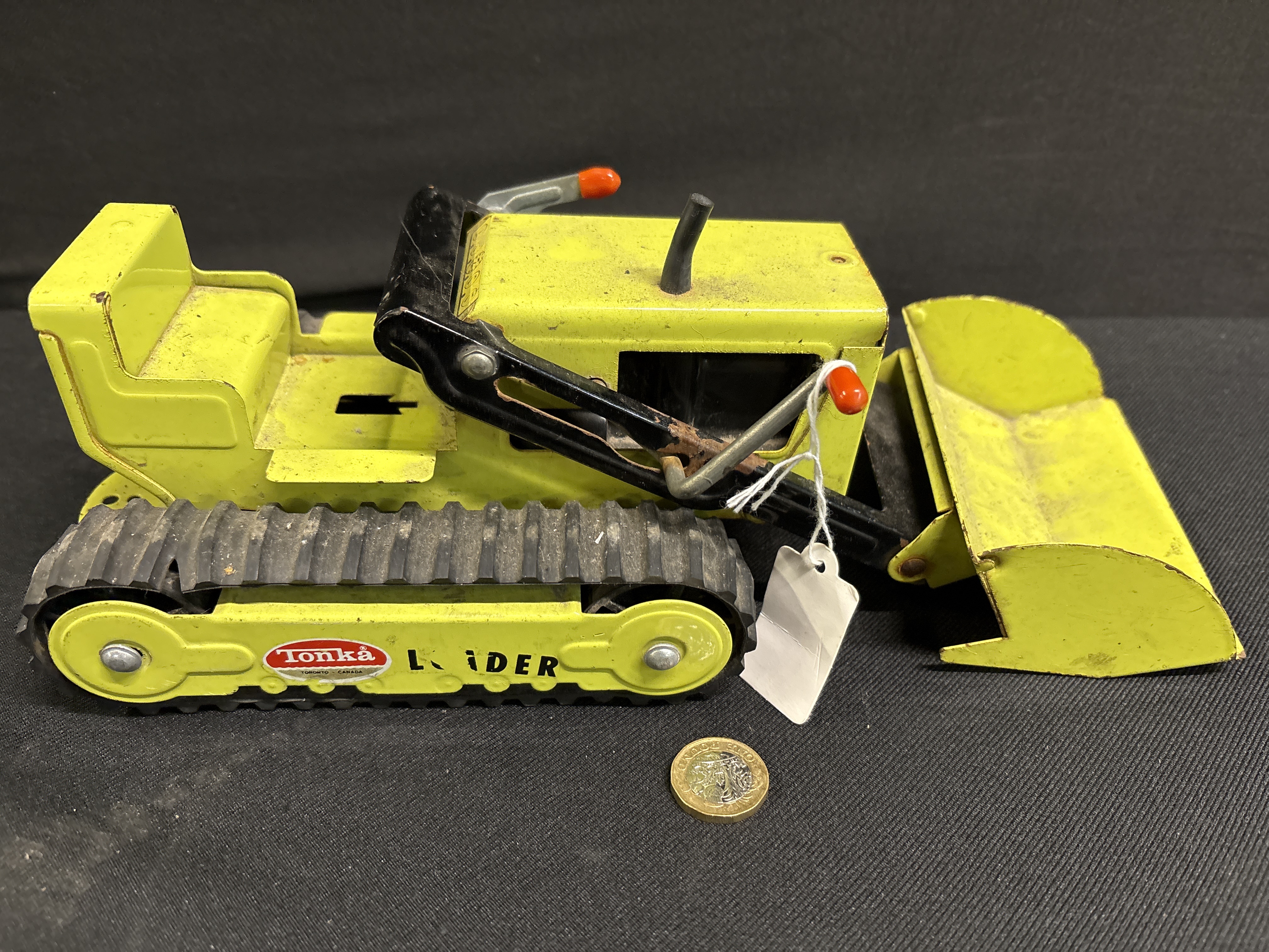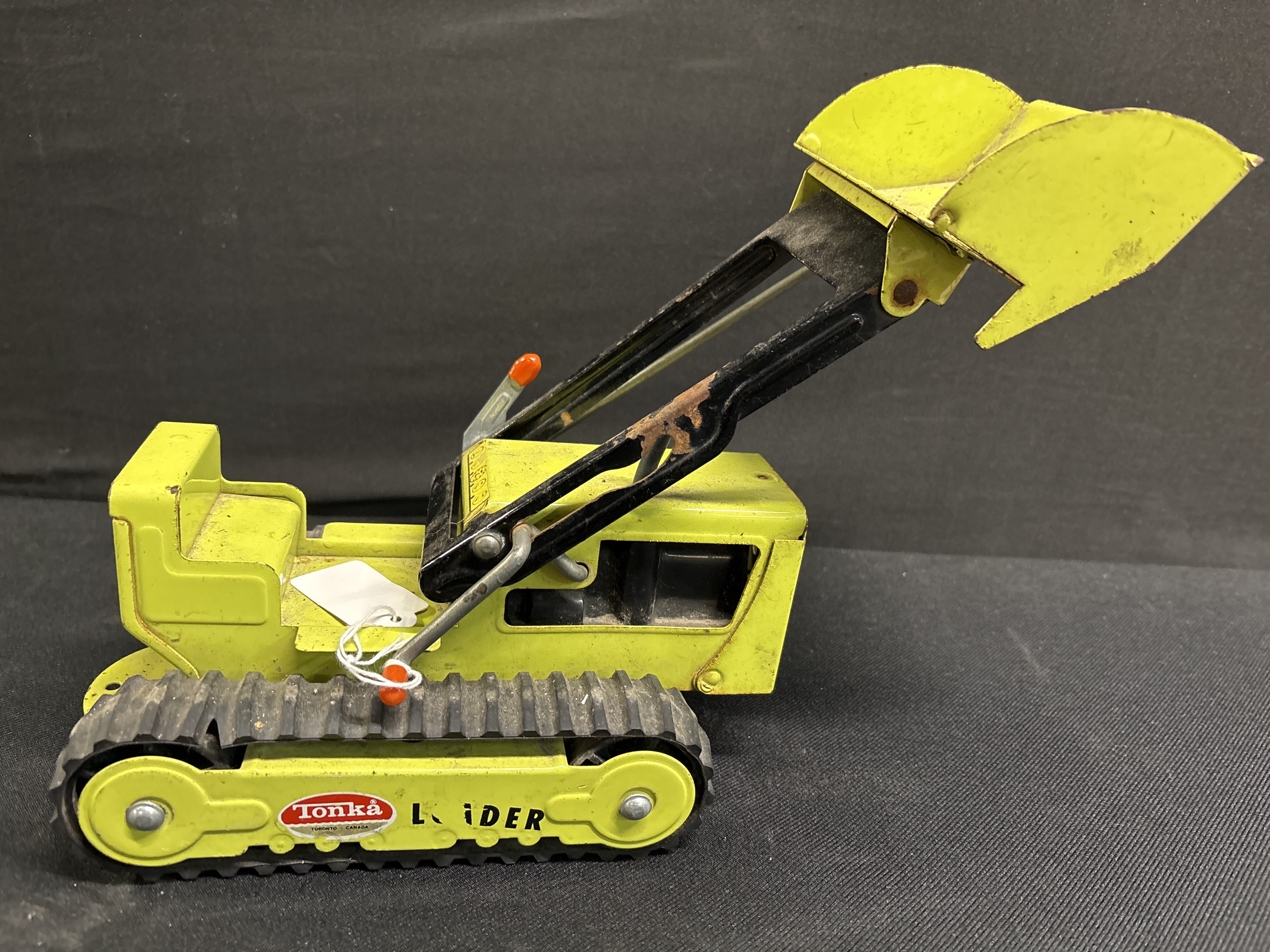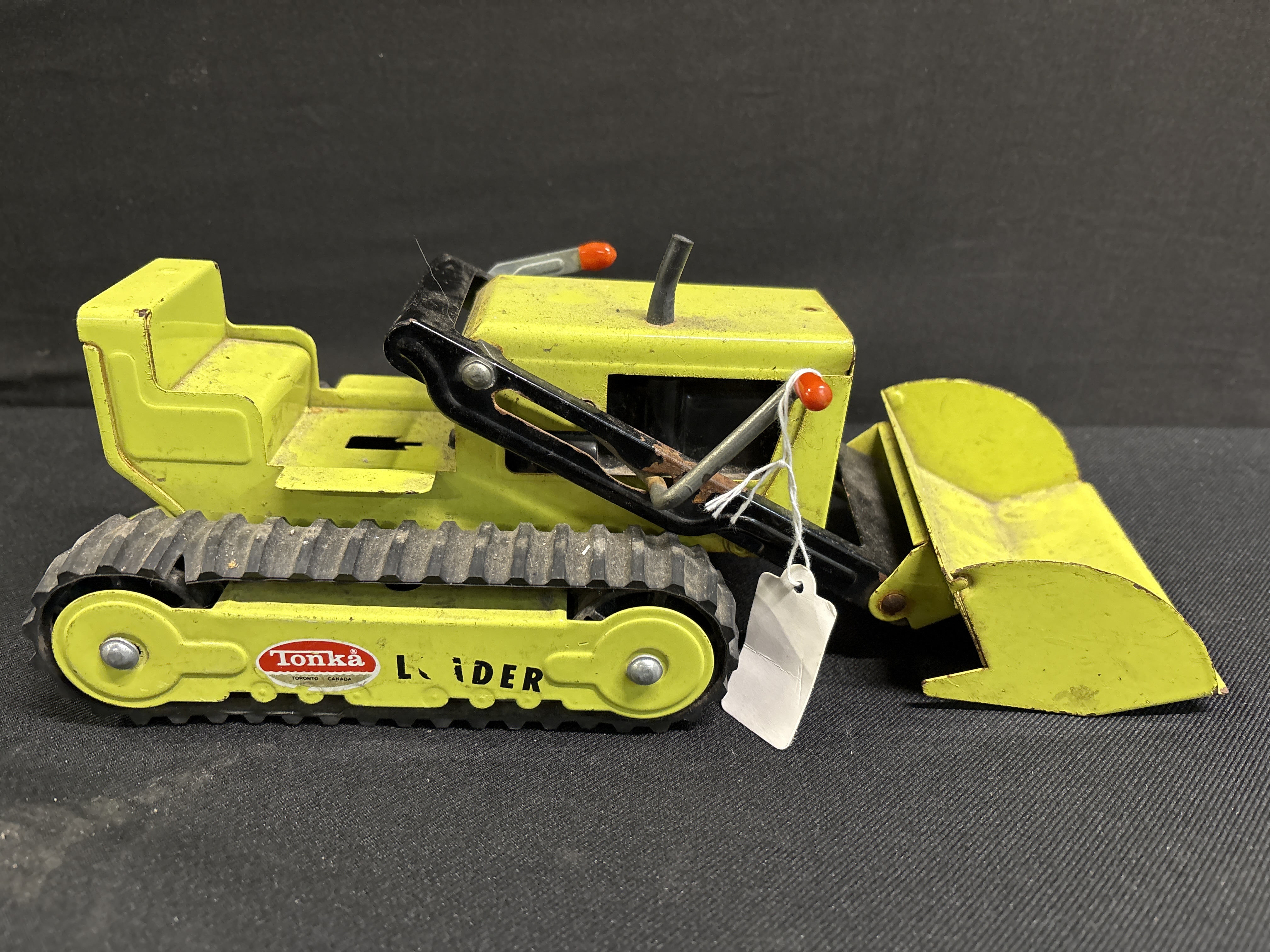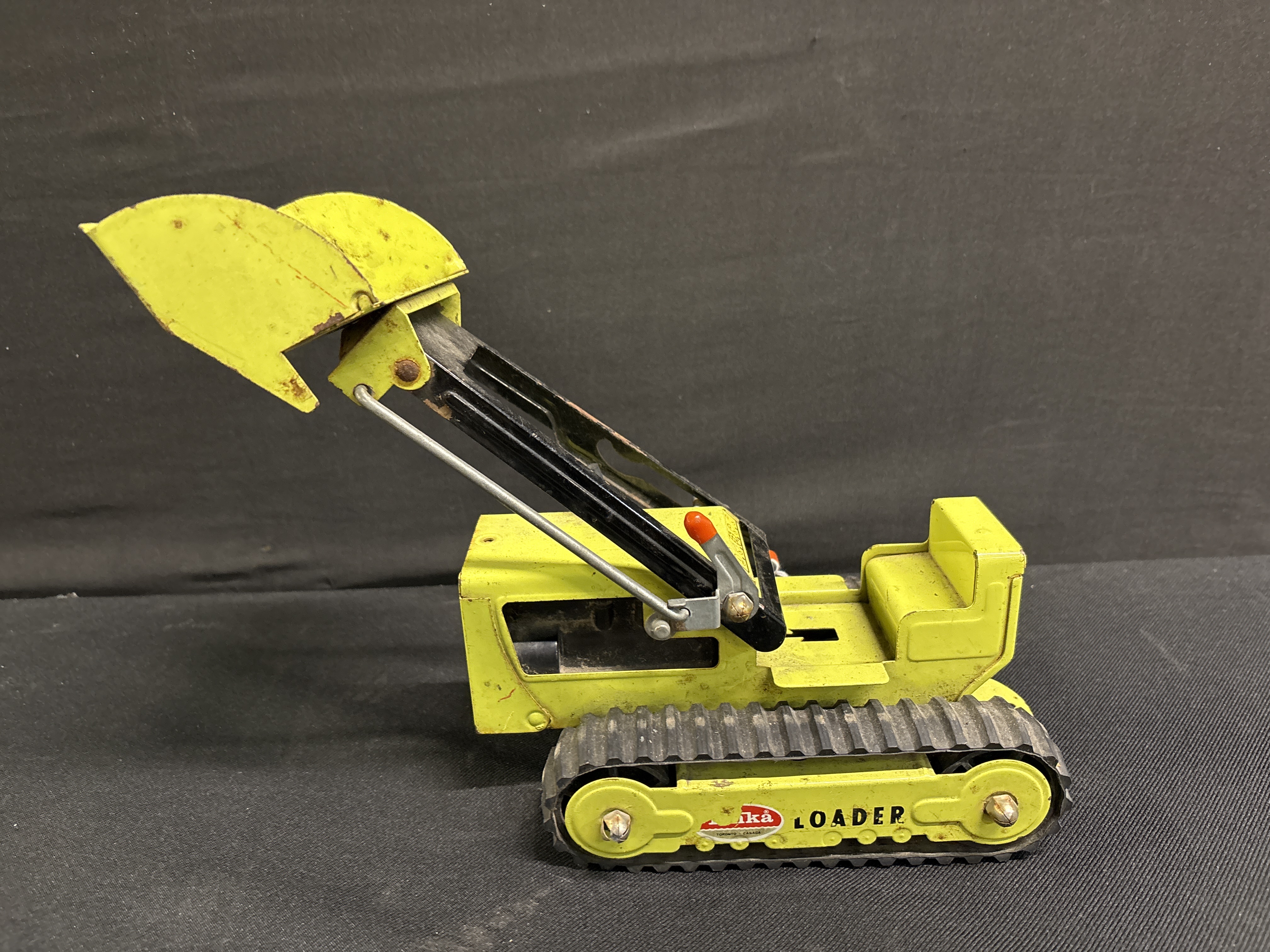 A vintage metal track loader manufactured by Tonka in Toronto, Canada, dating from approximately the 1970s. This front-end loader features a manual lever-operated mechanism that controls the lift and tilt functionality of the front bucket. The vehicle is constructed from metal and finished in a period-correct lime green paint scheme with black-painted lift arms. It sits on two wide, black rubber crawler tracks. The item is offered without its original packaging. Visible markings include the original Tonka decals on the track covers, which identify the manufacturer and the model as a loader.