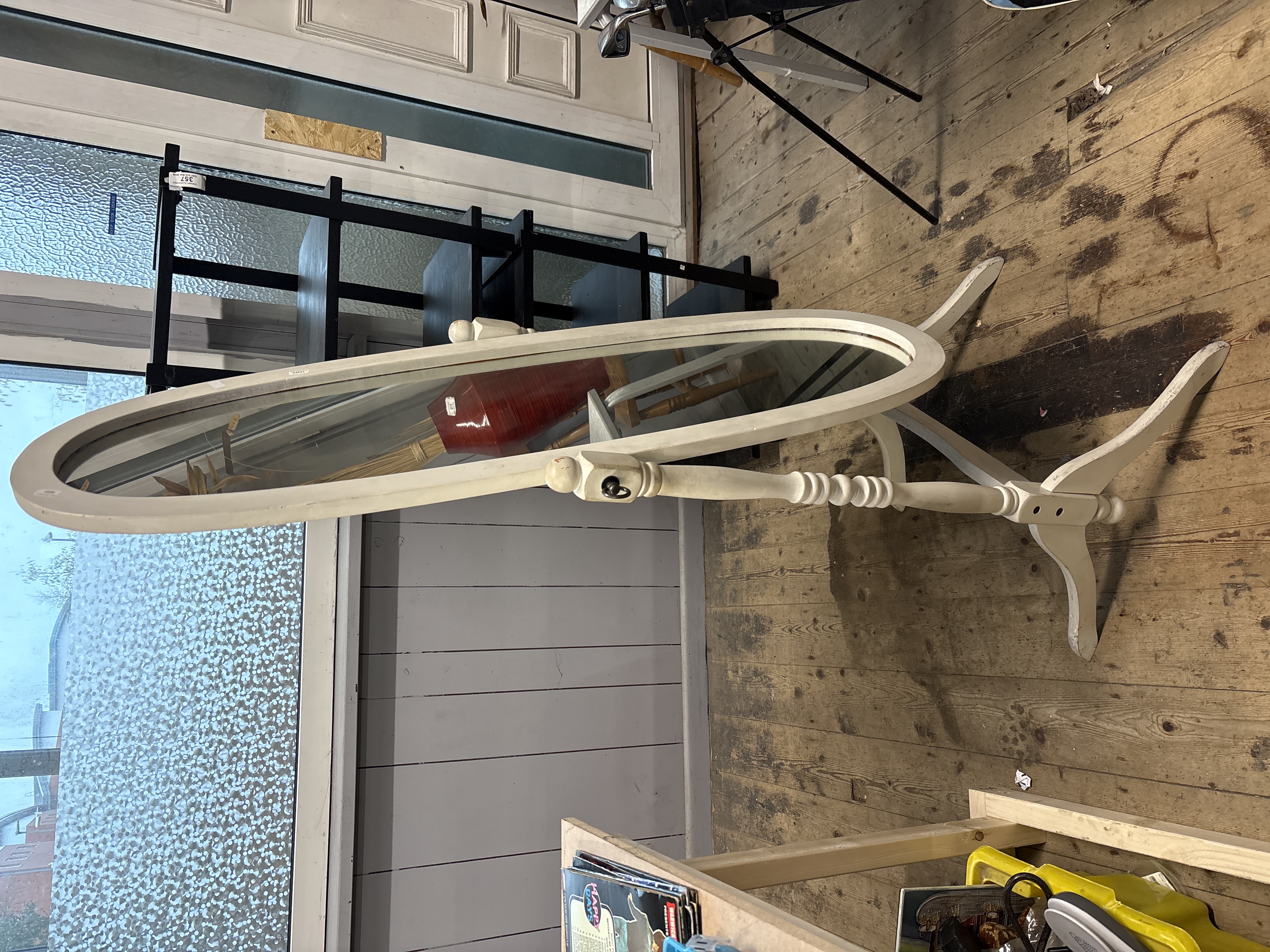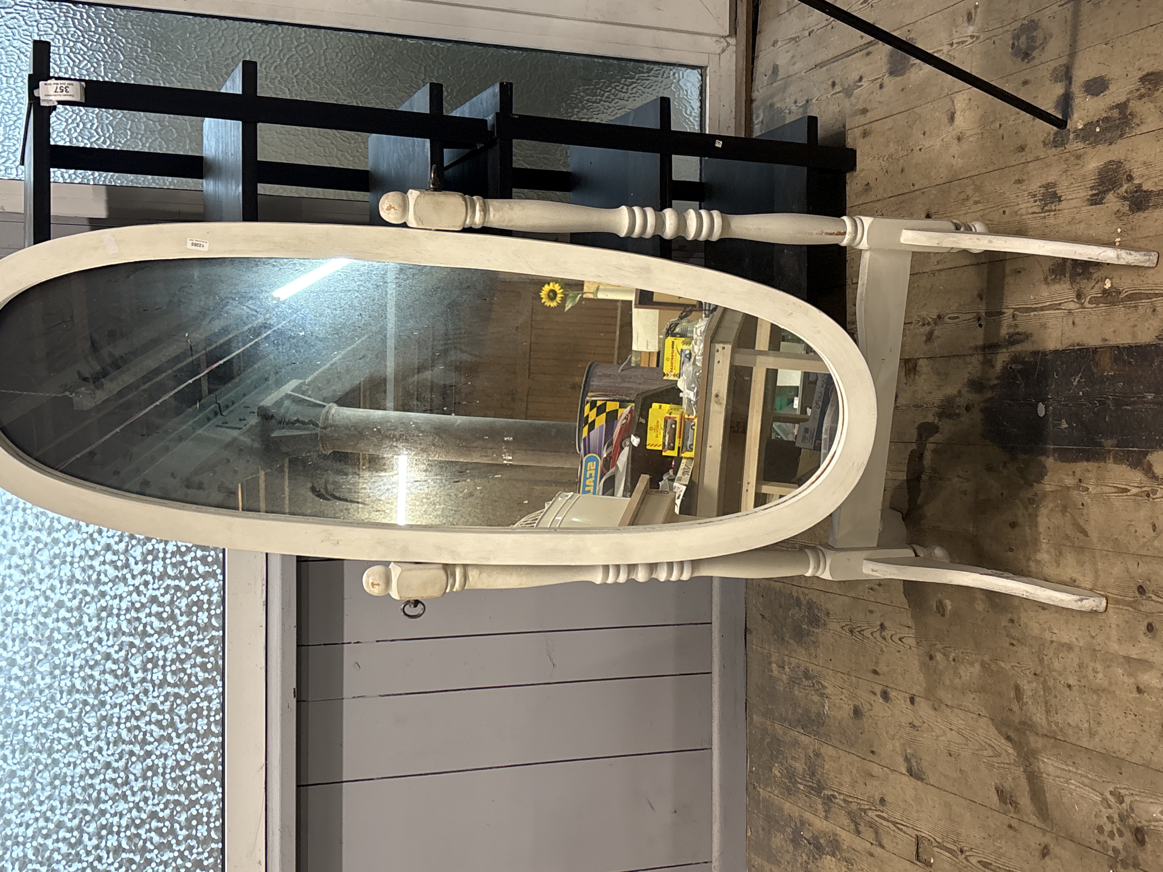 A traditional oval cheval mirror by Crown Mark, constructed from wood with a white painted finish. The design features a full-length oval mirror plate held within a moulded frame, mounted between two turned upright supports. The frame is secured to a trestle-style base with splayed feet, allowing for adjustable tilting via side-mounted knobs. This oval chival mirror represents a classic bedroom staple with a versatile contemporary finish. Dimensions: Approximately 150 cm x 48 cm x 40 cm.