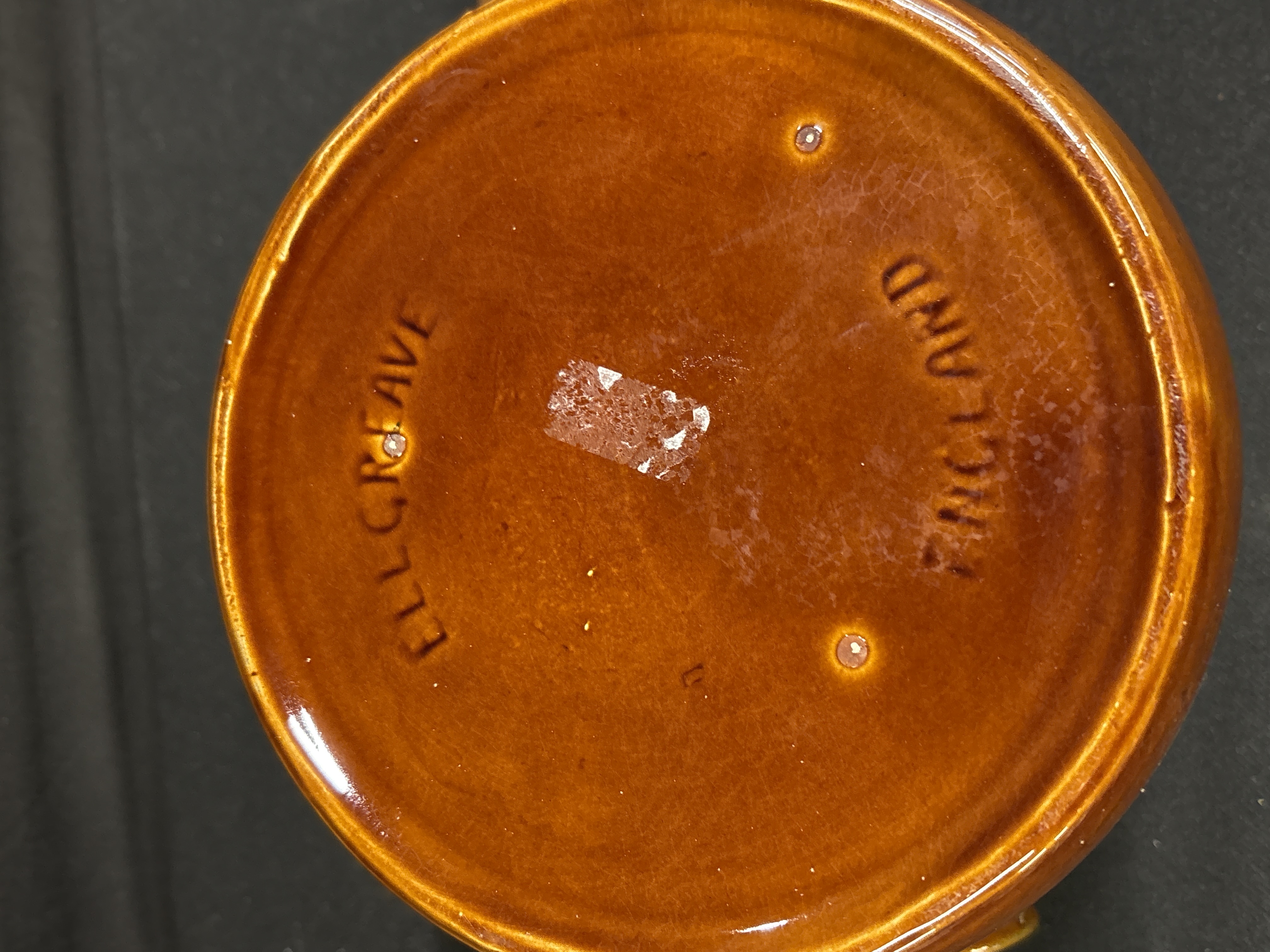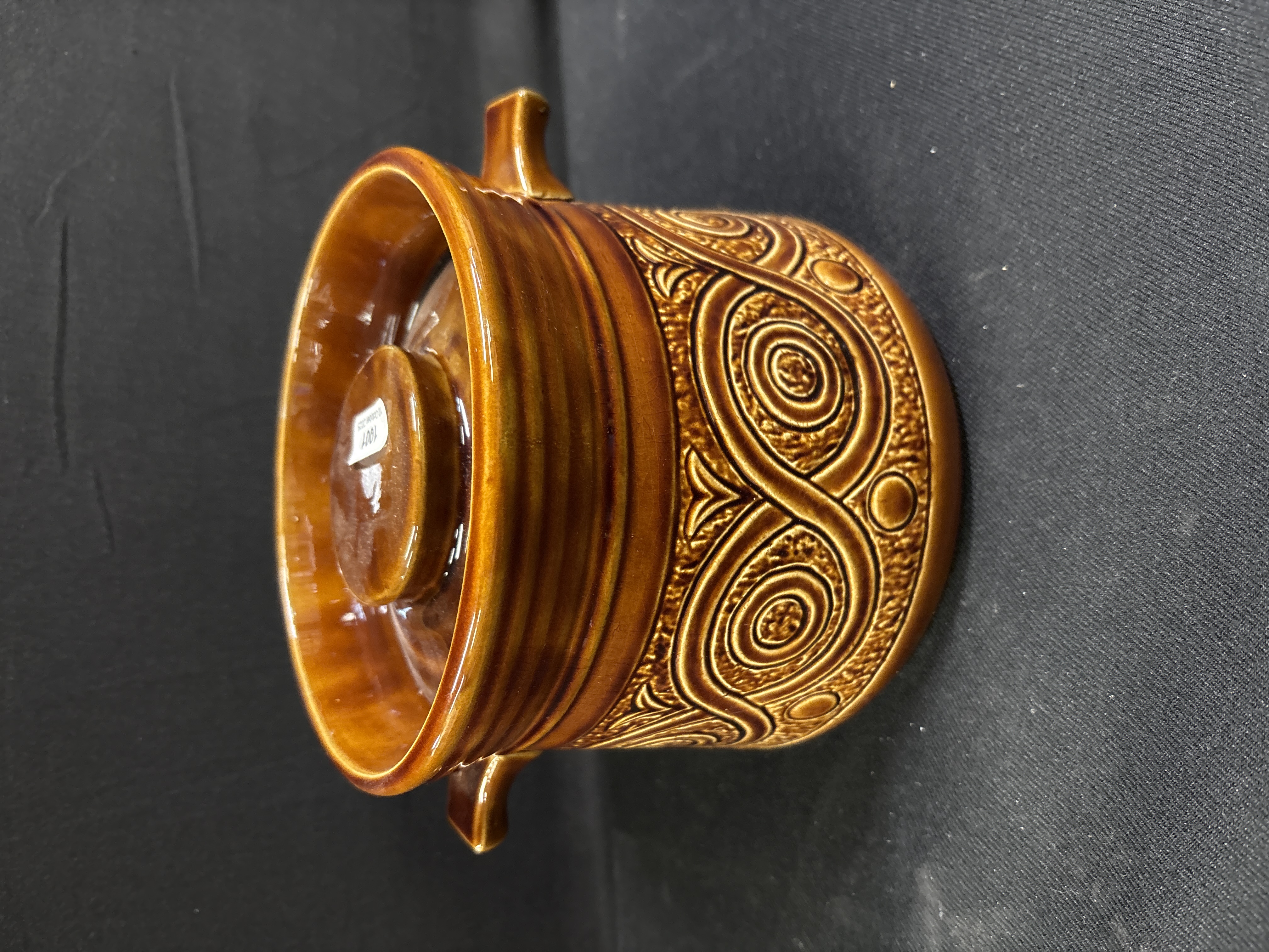 A vintage Ellgreave stoneware lidded cooking pot in the Saxony pattern, produced by Ellgreave Pottery of Burslem. The vessel is finished in a glossy treacle-brown glaze and features a relief-moulded decorative band of stylised interlocking spirals and circular motifs in a folk-art aesthetic. The upper neck area is detailed with horizontal ribbing and is flanked by two small, integral lug handles. The base is impressed with the maker’s mark ELLGREAVE ENGLAND. This piece is a characteristic example of mid-century modern kitchenware from the 1960s-1970s, often associated with the Wood & Sons group. Height: approximately 16cm.