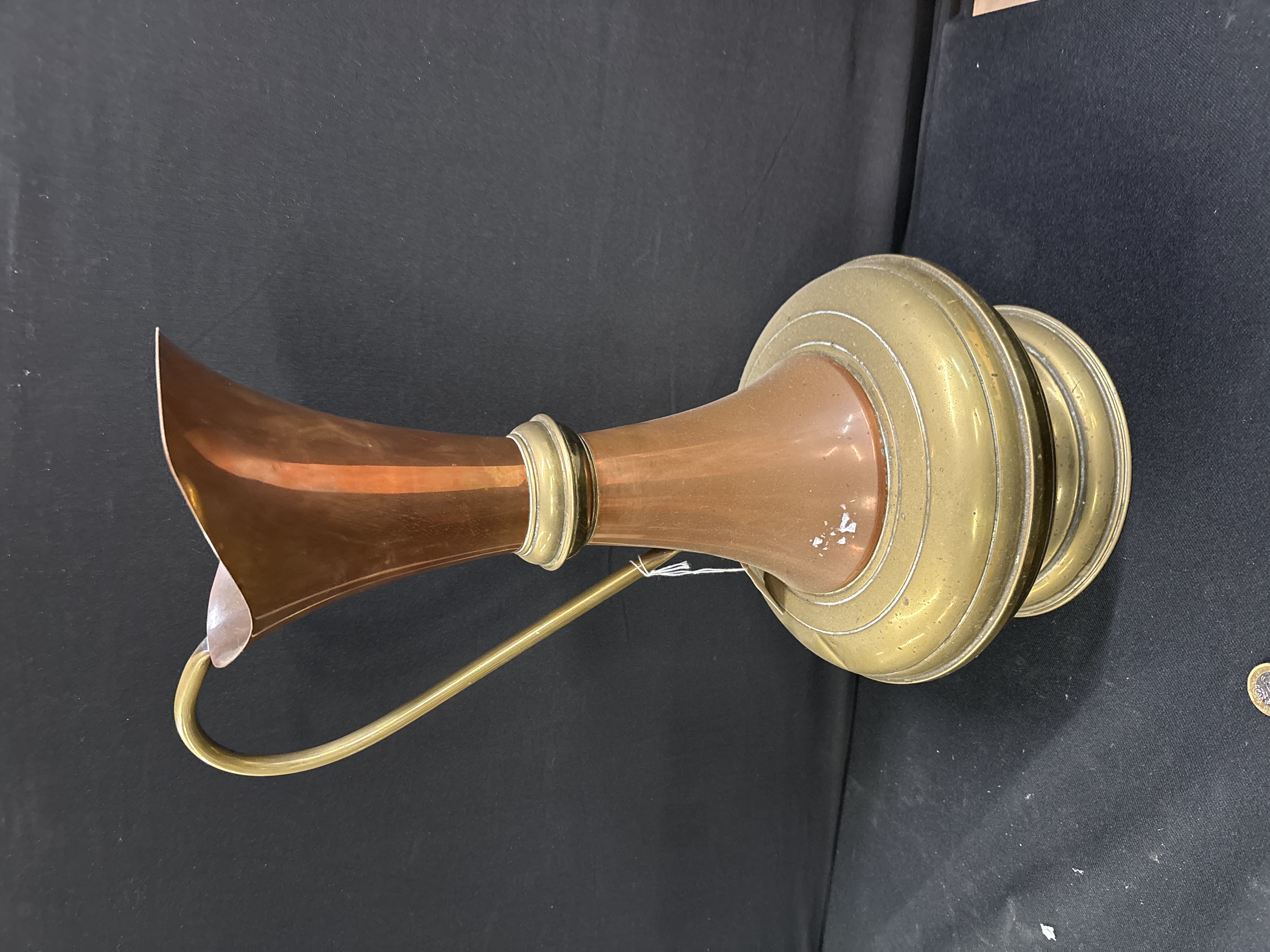 This large brass and copper ewer is a sophisticated example of late 19th-century decorative metalware, reflecting the aesthetic principles of the Arts & Crafts movement. The piece is of bi-metal construction, featuring a tapered copper body fashioned from sheet metal with a visible vertical seam. It is enhanced by contrasting brass elements, including a flared spout, a central decorative collar, and a substantial stepped circular base. A long, slender wrought brass handle completes the elegant silhouette. Although unmarked, the design and assembly are characteristic of English domestic metalware from the late Victorian period. Dimensions: Height 53 cm.