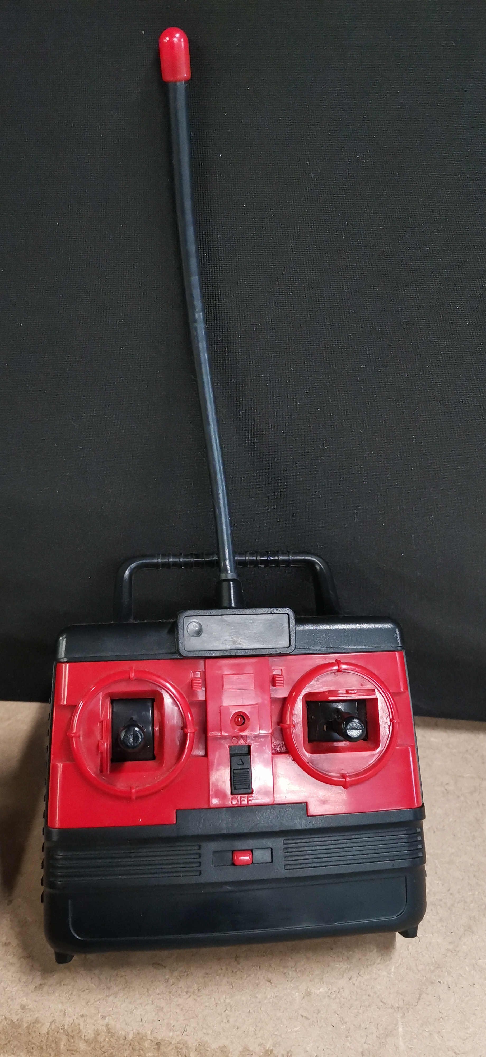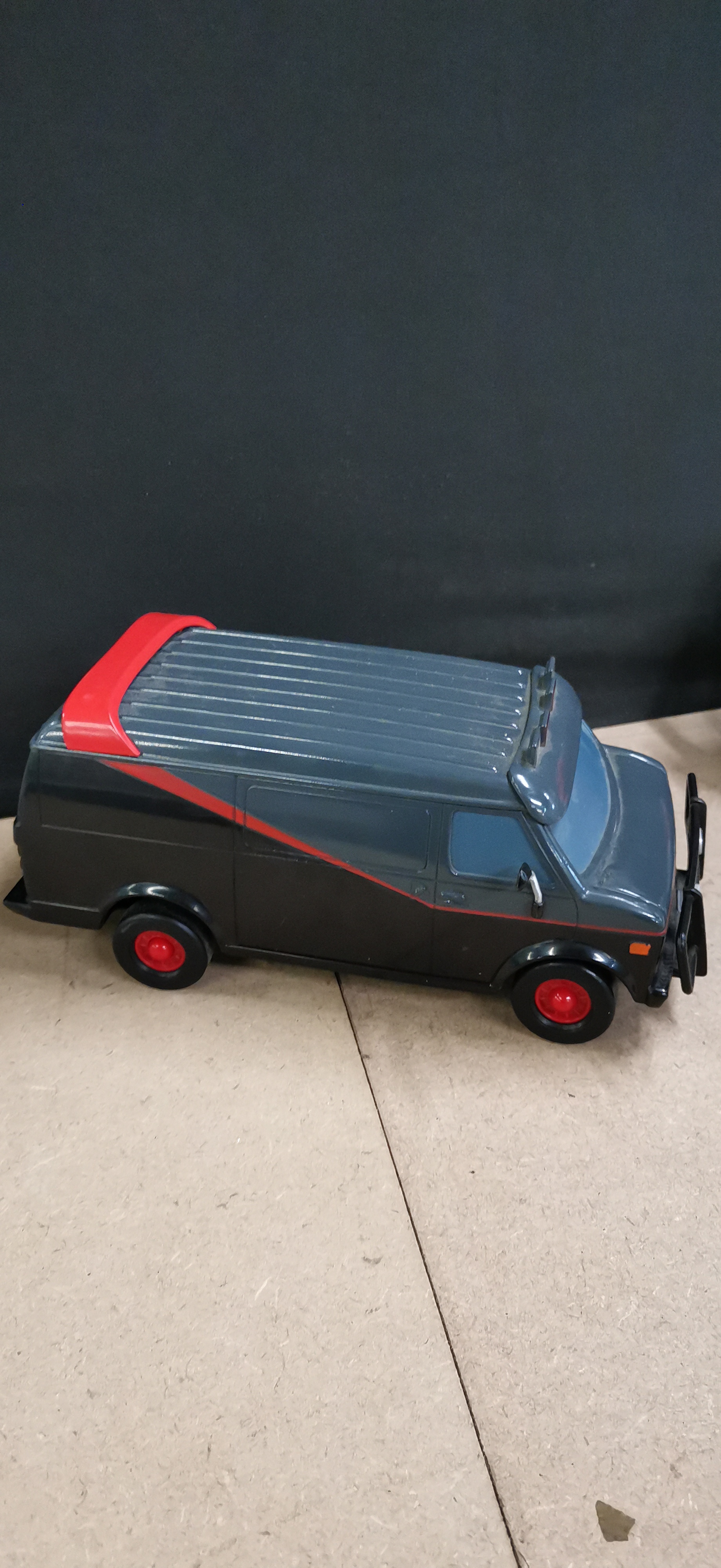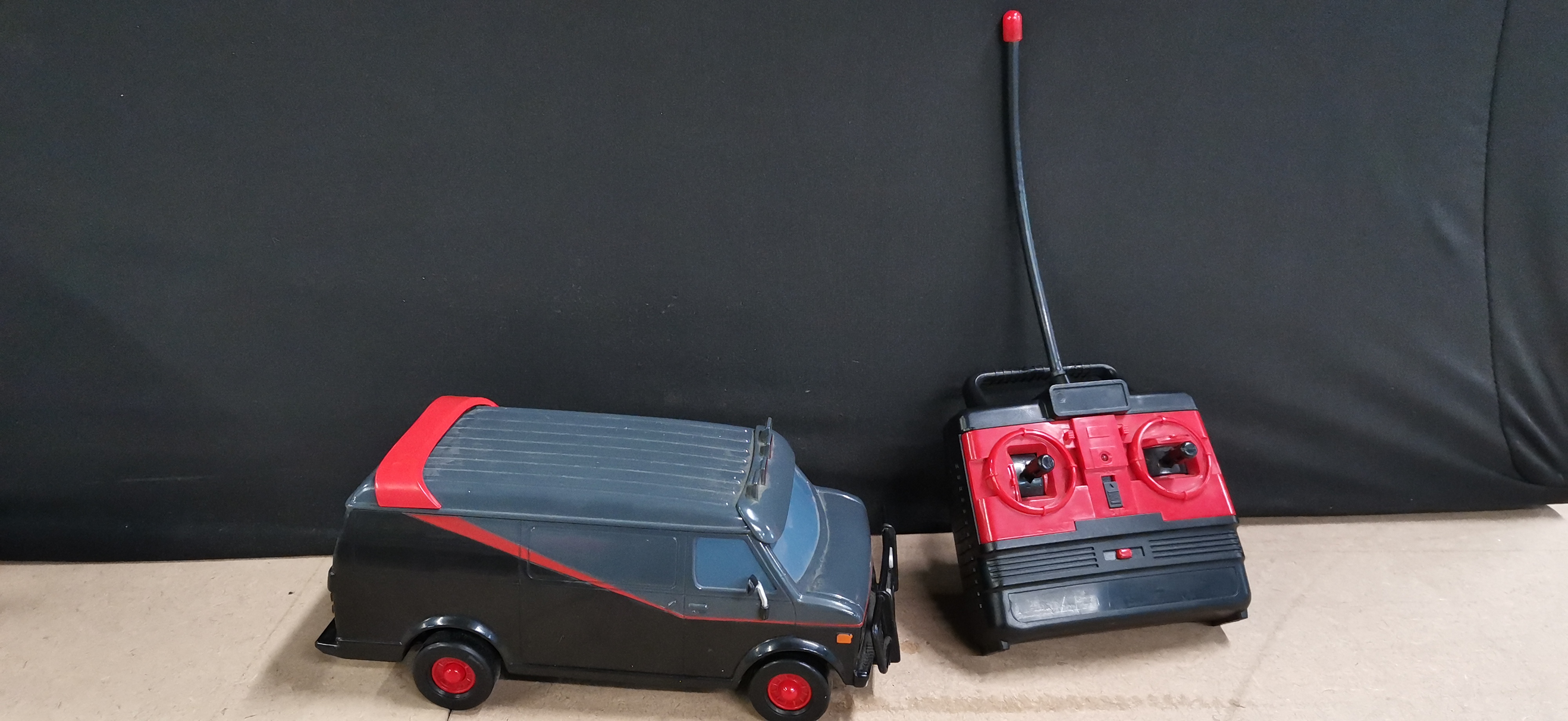 Produced by Pava Ltd. (Model No. NBO-1079W), this is a radio-controlled replica of the iconic GMC Vandura from the 1980s television series The A-Team. Constructed from molded plastic, the vehicle features the classic two-tone black and grey colour scheme with the signature red diagonal stripe. The mechanism is battery-operated, functioning on a 40MHz frequency via a handheld two-joystick remote control. This item is offered without its original box and dates from the early 2000s.