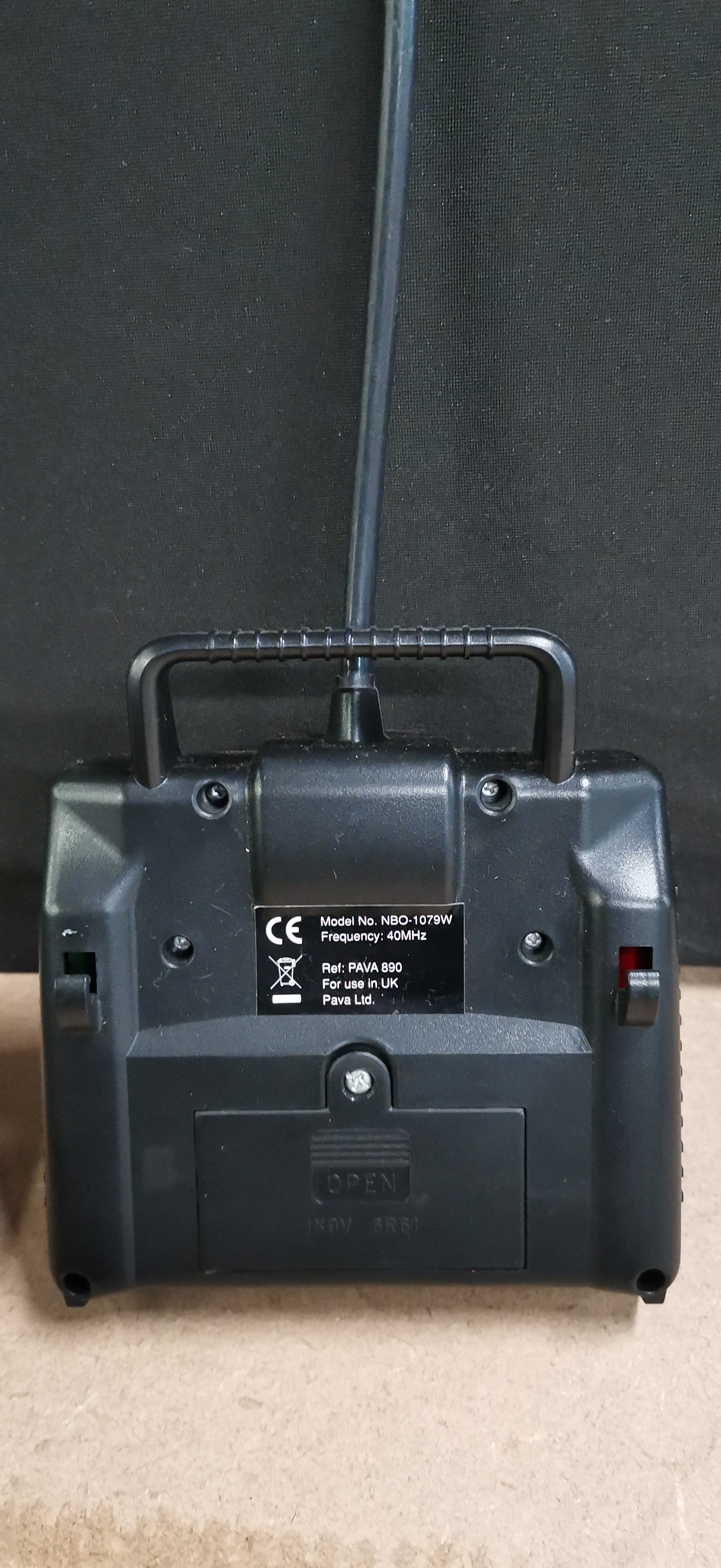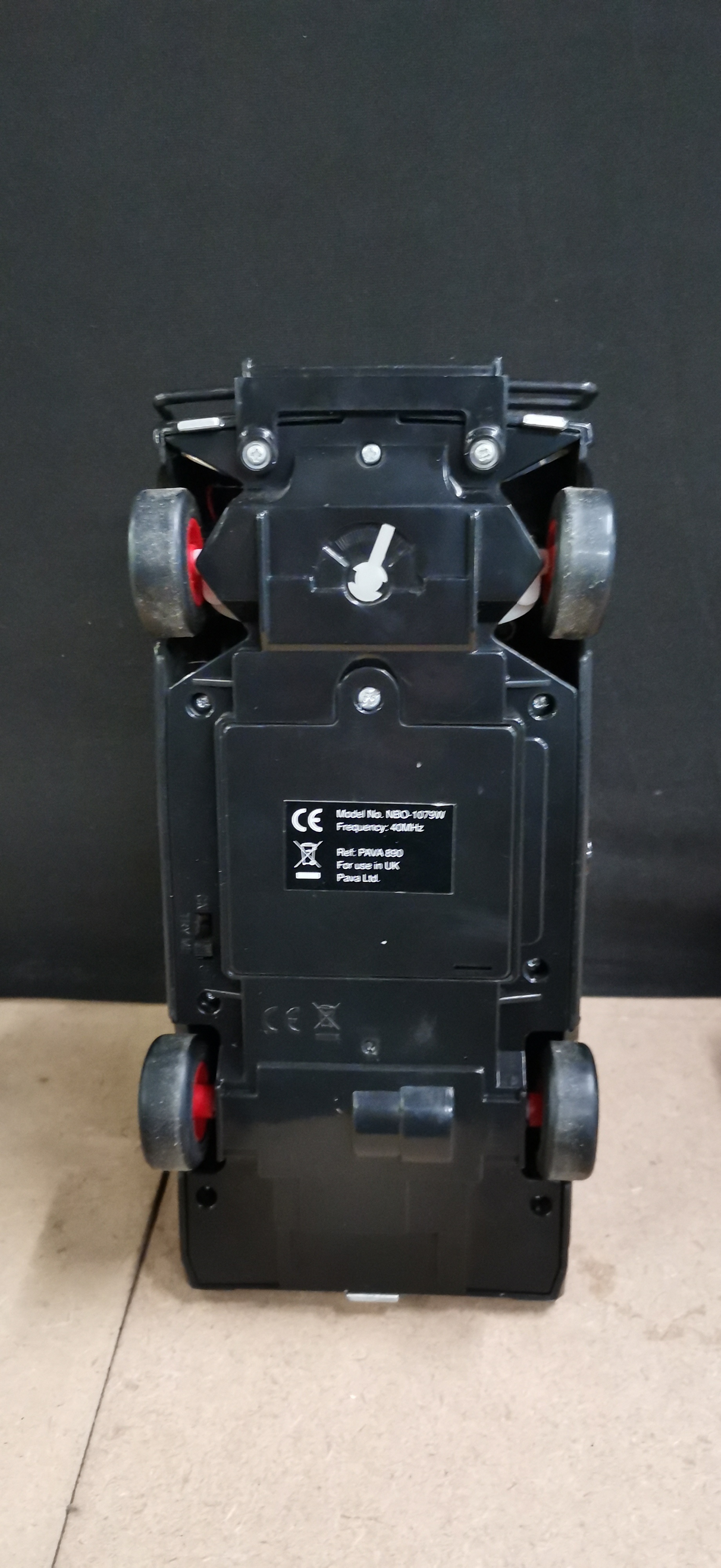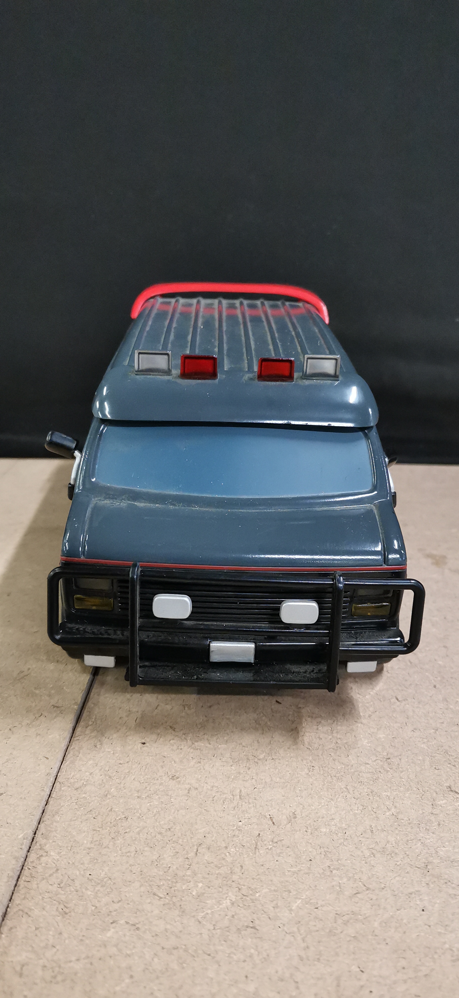 Produced by Pava Ltd. (Model No. NBO-1079W), this is a radio-controlled replica of the iconic GMC Vandura from the 1980s television series The A-Team. Constructed from molded plastic, the vehicle features the classic two-tone black and grey colour scheme with the signature red diagonal stripe. The mechanism is battery-operated, functioning on a 40MHz frequency via a handheld two-joystick remote control. This item is offered without its original box and dates from the early 2000s.