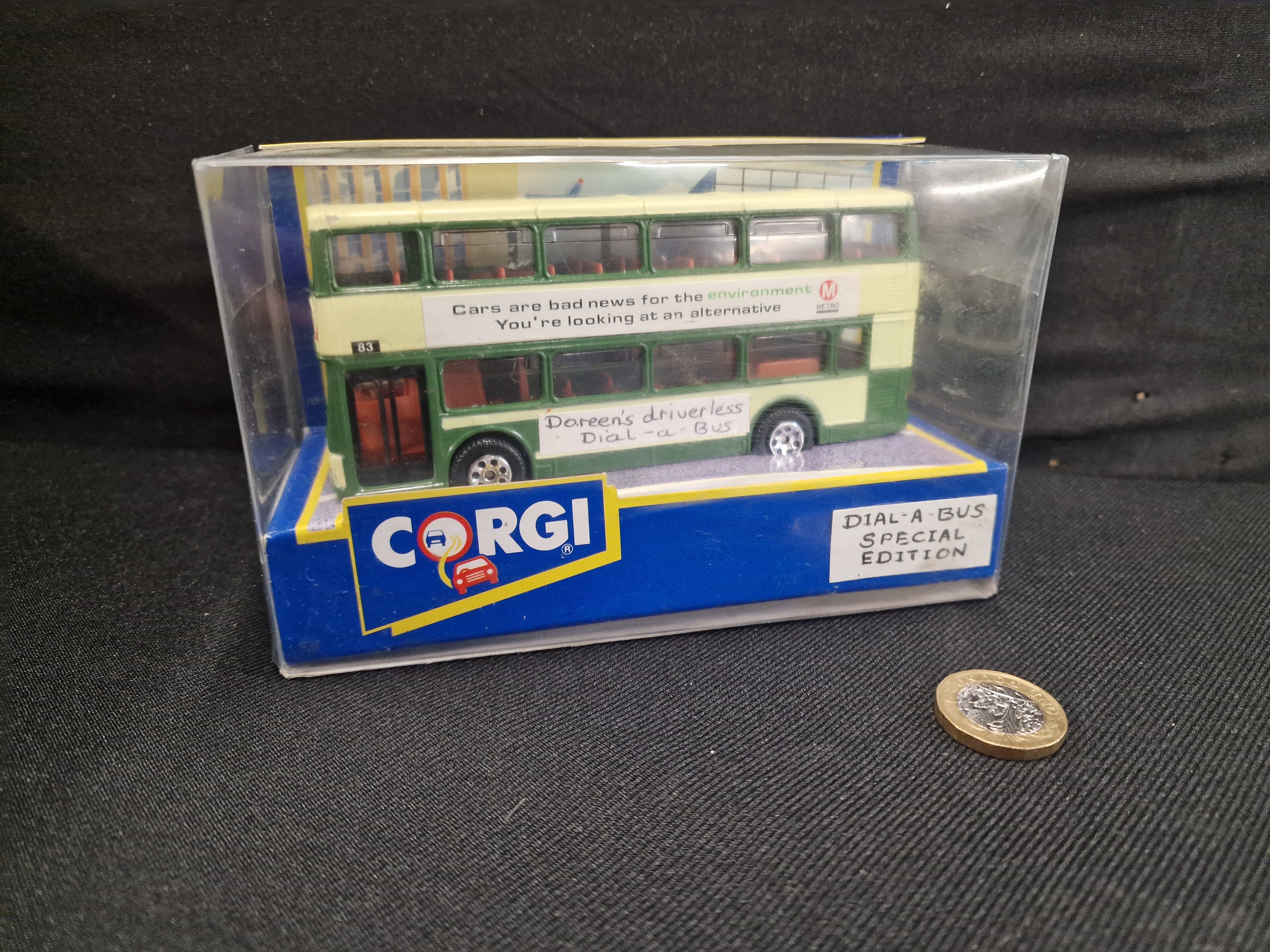 A Corgi die-cast model of an MCW Metrobus double-decker, part of the Yorkshire Rider series representing Leeds City Transport. The model is finished in a traditional green and cream livery and features route number 83. The side panels display environmental advertisements reading, Cars are bad news for the environment You’re looking at an alternative, accompanied by the Metro logo. A unique lower white panel bears the printed text, Doreen’s driverless Dial-a-Bus. The item is housed in its original blue Corgi-branded cardboard display base with a clear plastic cover. The front of the base is marked with a white adhesive label identifying this as a DIAL-A-BUS SPECIAL EDITION. This model serves as a nostalgic representation of West Yorkshire bus operations during the late 20th century. The model measures approximately 120mm in length; the display case measures approximately 150mm x 85mm x 55mm.