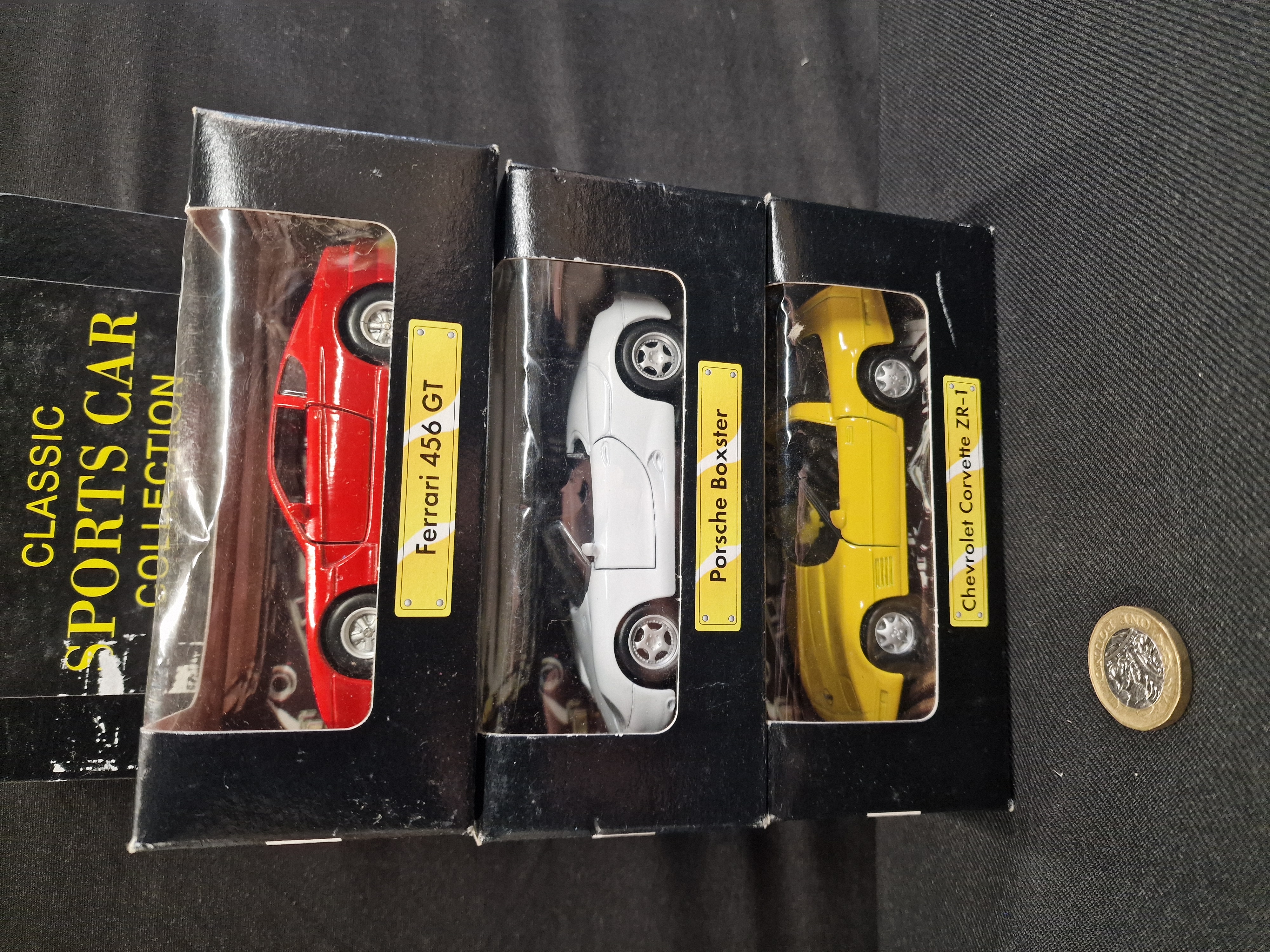 A collection of three die-cast model sports cars from the Classic Sports Car Collection, attributed to Maisto. The group comprises a red Ferrari 456 GT, a white Porsche Boxster, and a yellow Chevrolet Corvette ZR-1. Each model is constructed from die-cast metal with plastic detailing, featuring period-correct wheel designs and interior moulding. The vehicles are housed in their original individual black window display boxes, each finished with a yellow and black identification label. These models represent a quintessential selection of high-performance grand tourers and roadsters from the late 20th century. Individual box dimensions approximately 100mm x 40mm x 40mm.