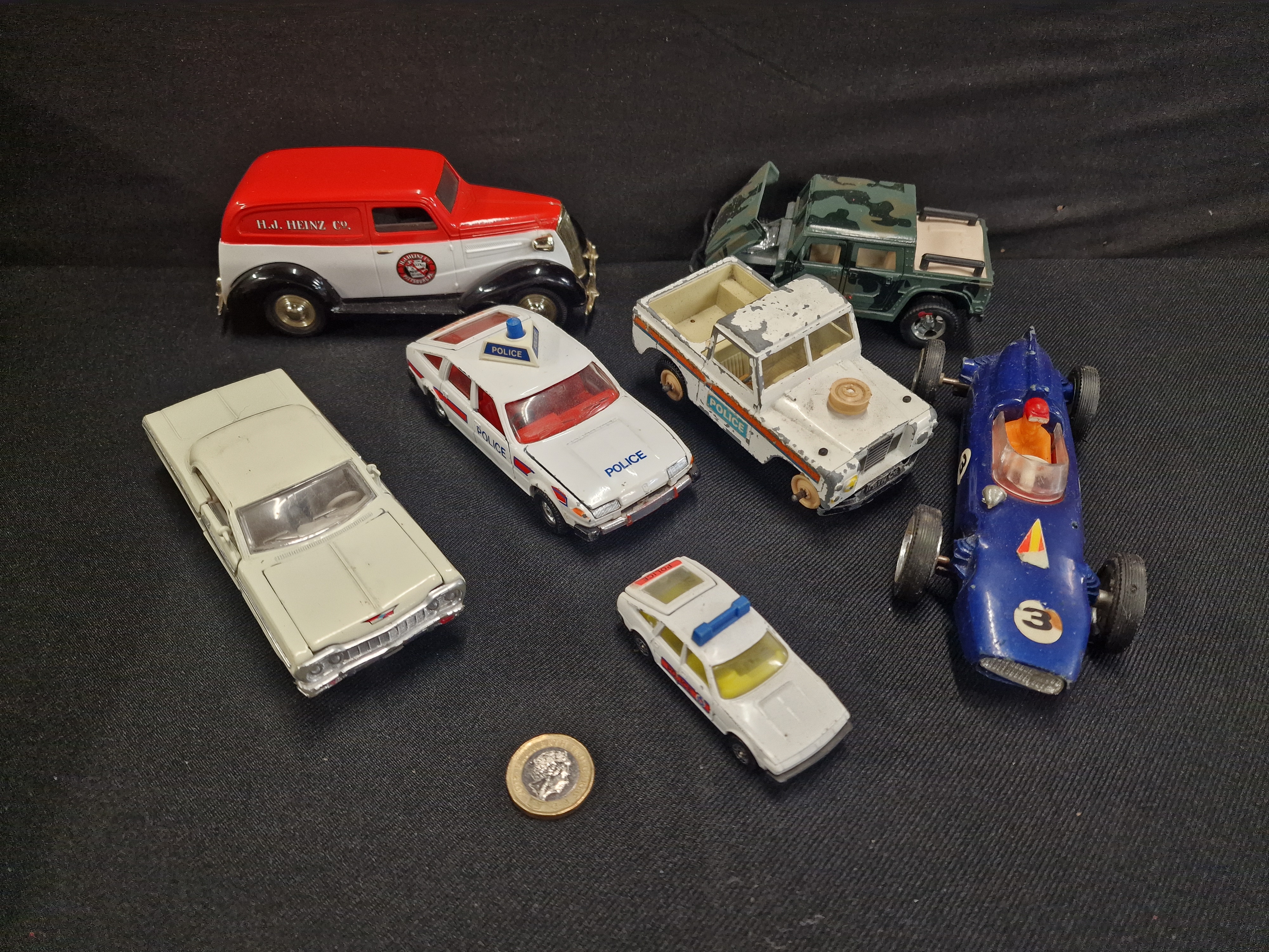 A collection of seven assorted die-cast metal toy vehicles of various scales and eras. The group is led by a Liberty Classics 1937 Chevrolet delivery van, produced as a coin bank for the H.J. Heinz Co. Pickling & Preserving company, featuring a two-tone red and white livery with authentic period branding. The lot also includes a vintage open-wheel racing car in blue with racing number 3 and driver figure; a white 1960s-style American sedan resembling a Chevrolet Impala; a Land Rover style utility vehicle in Police livery with a hood-mounted spare tyre; a Rover SD1 style police patrol car; a military Humvee in camouflage finish with an opening bonnet; and a small-scale miniature police car. All items are unboxed.