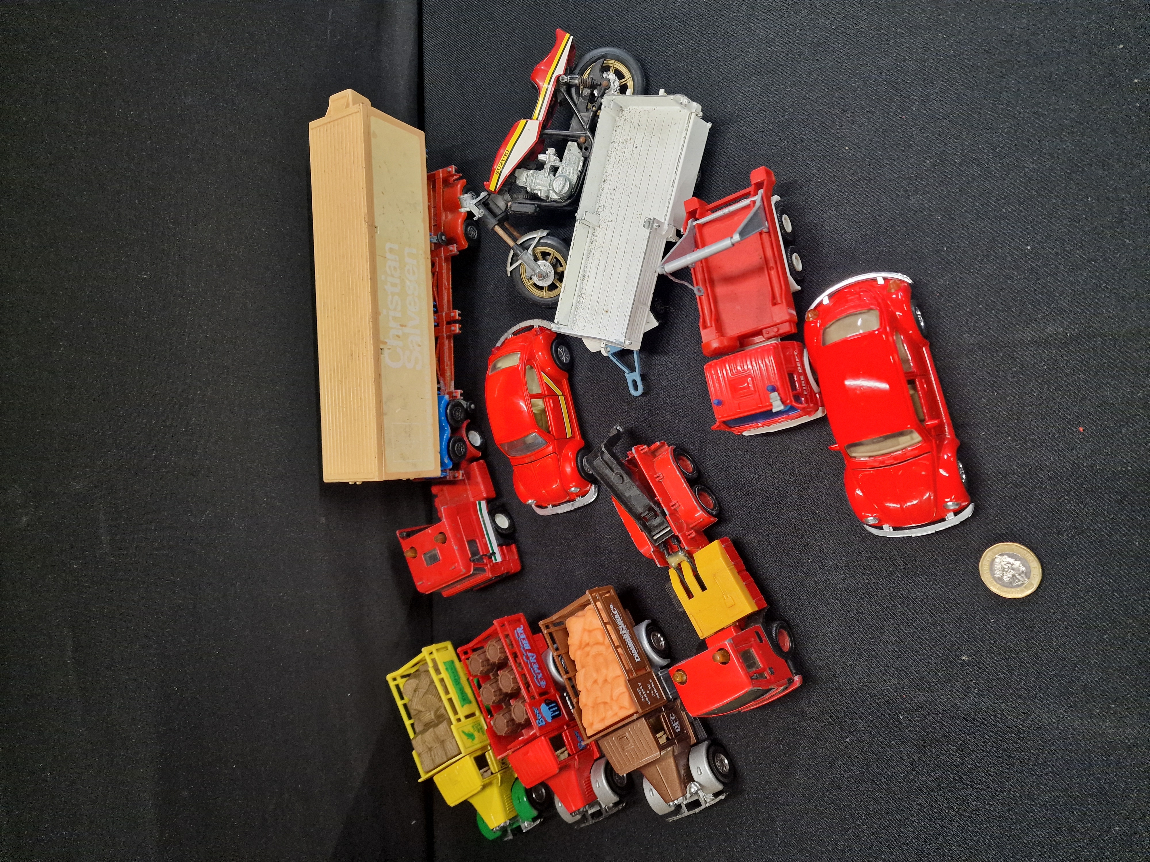 A collection of vintage and modern toy vehicles featuring manufacturers such as Matchbox (Lesney) and Lledo. The lot includes a Matchbox Super Kings articulated tractor-trailer with a Christian Salvesen livery container, constructed from die-cast metal with a plastic container. Also featured are three Lledo Days Gone style delivery trucks, including a Diamond T fruit truck and an Expert Beer vehicle. The group contains various utility vehicles such as a die-cast crane truck with a plastic mechanism and a fire engine with an elevating platform. Passenger vehicles include a large-scale red Volkswagen Beetle and a smaller hatchback. Supplemental items include a plastic Suzuki racing motorcycle and two tipping trailers. All items are unboxed.
