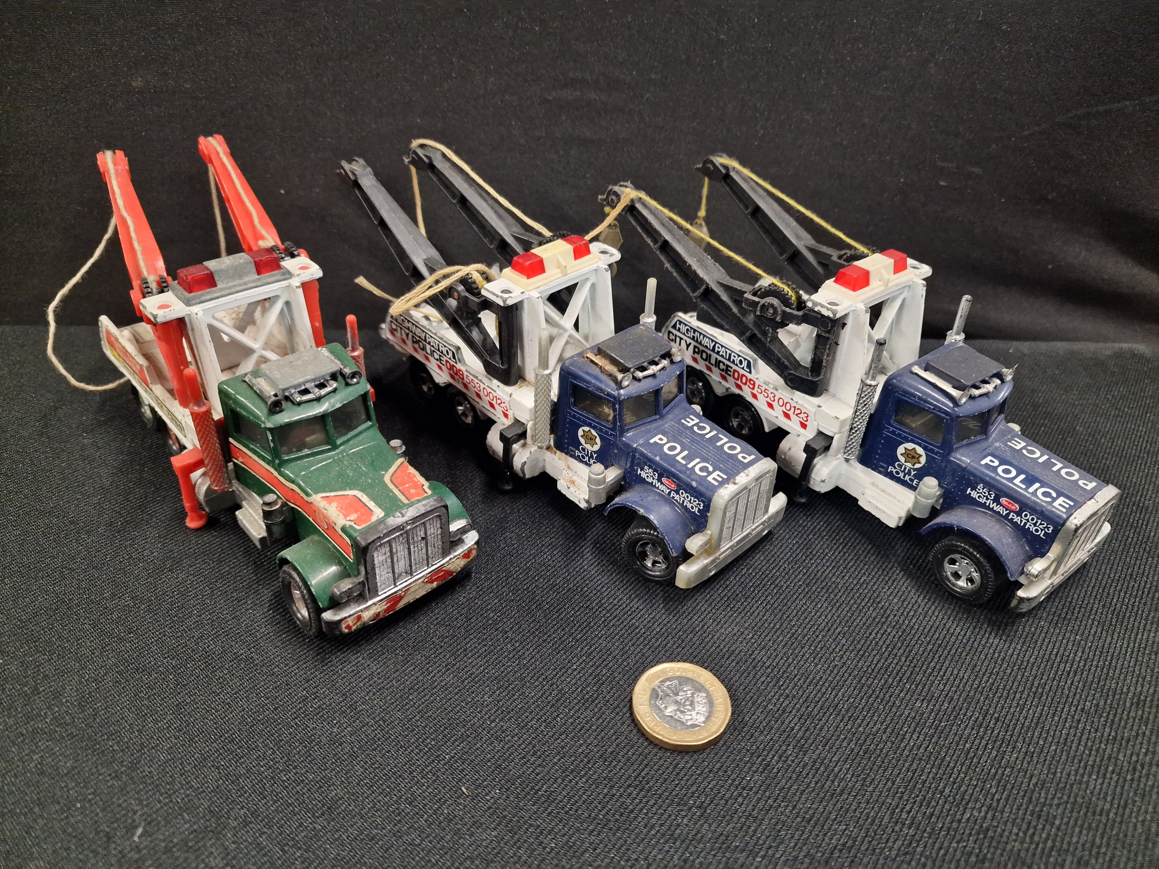 A collection of three Matchbox Super Kings K-20 Peterbilt Wreck Trucks, manufactured by Lesney Products. This lot comprises two models finished in the “City Police” and “Highway Patrol” livery, featuring dark blue cabs with white recovery bodies and “00123” decals. The third model is presented in a contrasting green and red commercial colour scheme. Each vehicle is constructed with a die-cast metal cab and chassis, featuring the Peterbilt logo on the bonnet. The recovery apparatus consists of twin plastic booms, winching mechanisms, and twine tow cables. These heavy-duty recovery vehicles were a prominent part of the Super Kings range during the late 1970s. Each truck measures approximately 160mm in length.