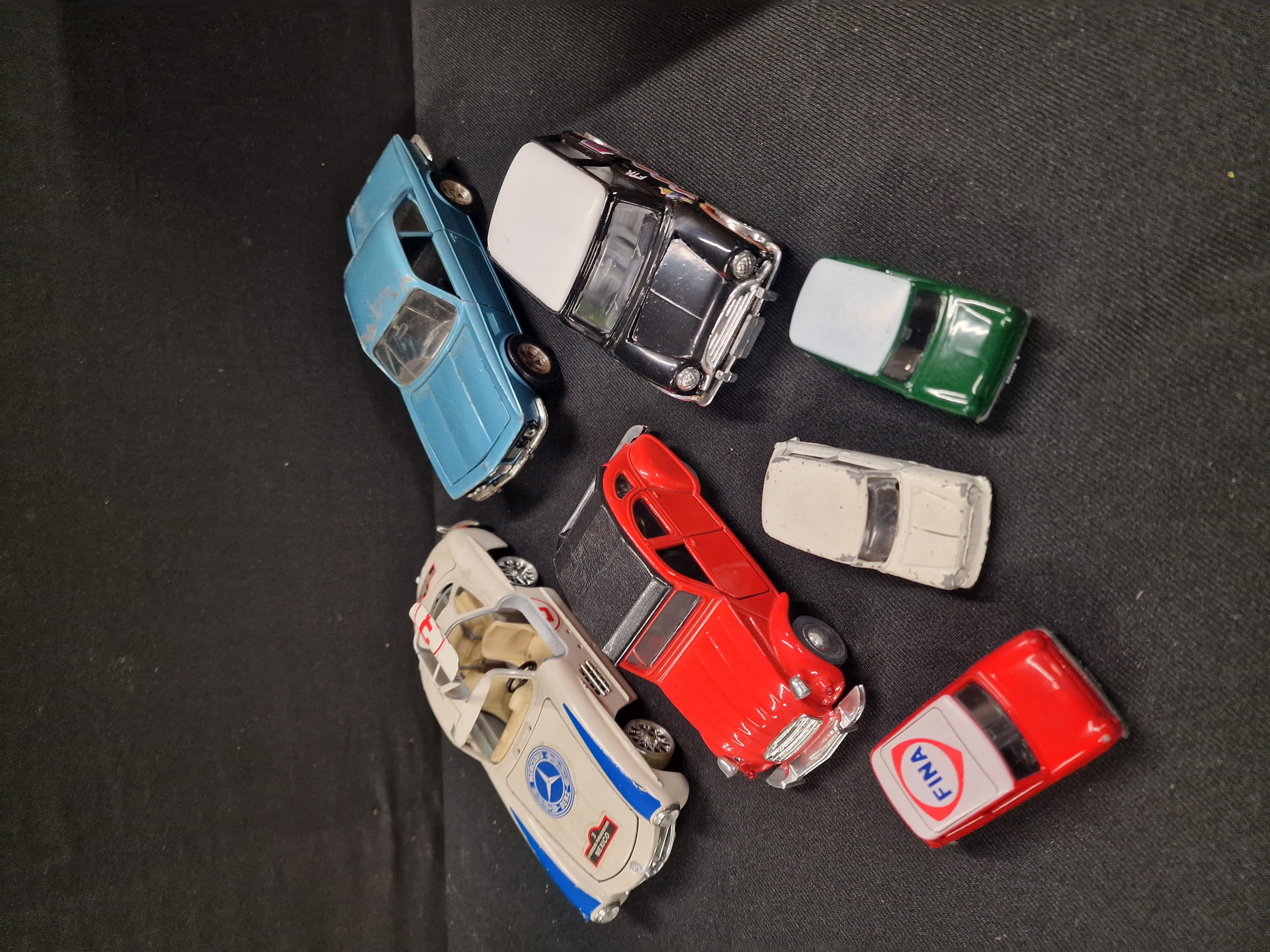 A collection of seven die-cast toy vehicles featuring manufacturers such as Sunnyside Superior Toys. The lot includes a black and white Mini Cooper with a pullback friction motor and a white Mercedes-Benz 300SL racing car decorated with Carrera Panamericana Mexico decals and a large logo on the bonnet. Also present is a light blue 1960s-style Ford Mustang, a red vintage-style sedan with a black textured roof and chrome-finished grille, a small-scale red car with a white roof featuring the FINA oil company logo, a green and white hatchback, and a small off-white car. The vehicles are constructed from die-cast metal with plastic parts and feature free-rolling wheels. No original packaging or boxes are included in this lot.